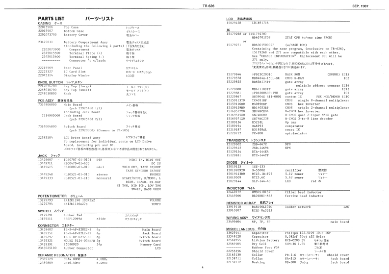 SEP.1987TR-626T己-G己SERVICE NO正First EditionSPECIFICATIONS日这mG200,春「,六1GM1n:6D00m45.n4号1物3语fmna背43-240数gneATgI里0月风0b时T网Sp时QIdbrsPome Saardeo DC dry coll YM-20 G pcxor AC Acapre D0匹飞AWtDn属DCty情1514■1582375mCHANGE INFORMATION变更案内Wrige13b42140ah9山yChooesbrisCaameian Cian 11-950Dry cdl SUV-3 6pa.CPU 105 Muin BeorsA21LLA5·x出=C直是表8直Pedul Bwiron DP-3Tre和GU'm a of the dnte of thia■3n]本中一比天/一卜霜行特或下,下孟的满月3随型biffcreaces ong them rre as listed belew物CPU便用2T十Sance the updated nevet cPU is uptard表中3CPU生、上y+儿t、K13K11)0A12K12060ot线ib】efr8wthe学to频6 essors,1t3s信用巴生3)CPU志使期儿t下是4,H2357341bV22770C0240100Mep Too24e01J0Part So.TChange1517270up to BOD199g/laterna】aati■1517326因820004-9幻180P别Progra Bee descriptien belaw.Im6的01T0ot2151732T18204p4/11北想r■Type af interral R例Tan CHAMA8SD网2016941《7世y7点住1511926业同C10.月Sbt P1245114每413504度川arasmanta On Tha E Prpir▣子只学2人欧臭点LEo时【2nd1tntbo1at8LP.14440(15027144tD4o可s4门ickerinc1at4p41nd1 cationxLCD上)子y希著不初+子7专耀城on the L3.4 Implammat the followiag feataras.幸下配的叠能冬丑如134711134413月trumamit/receive MIDI Excluive seaange.D1Ela,身七一梦老五受信节香,Tranemit a song pooltien pointer then a卡号y夕中0小题却个y年一三上道被menwure in the ongoing track 14 dtreotly播宽7包色递★,yy岁成夕乡票米多是是日十五,一内c有Feet-i5512004H05210I12r2213016951103424(134地1RolandPrintod in Japen nA-2 LH1