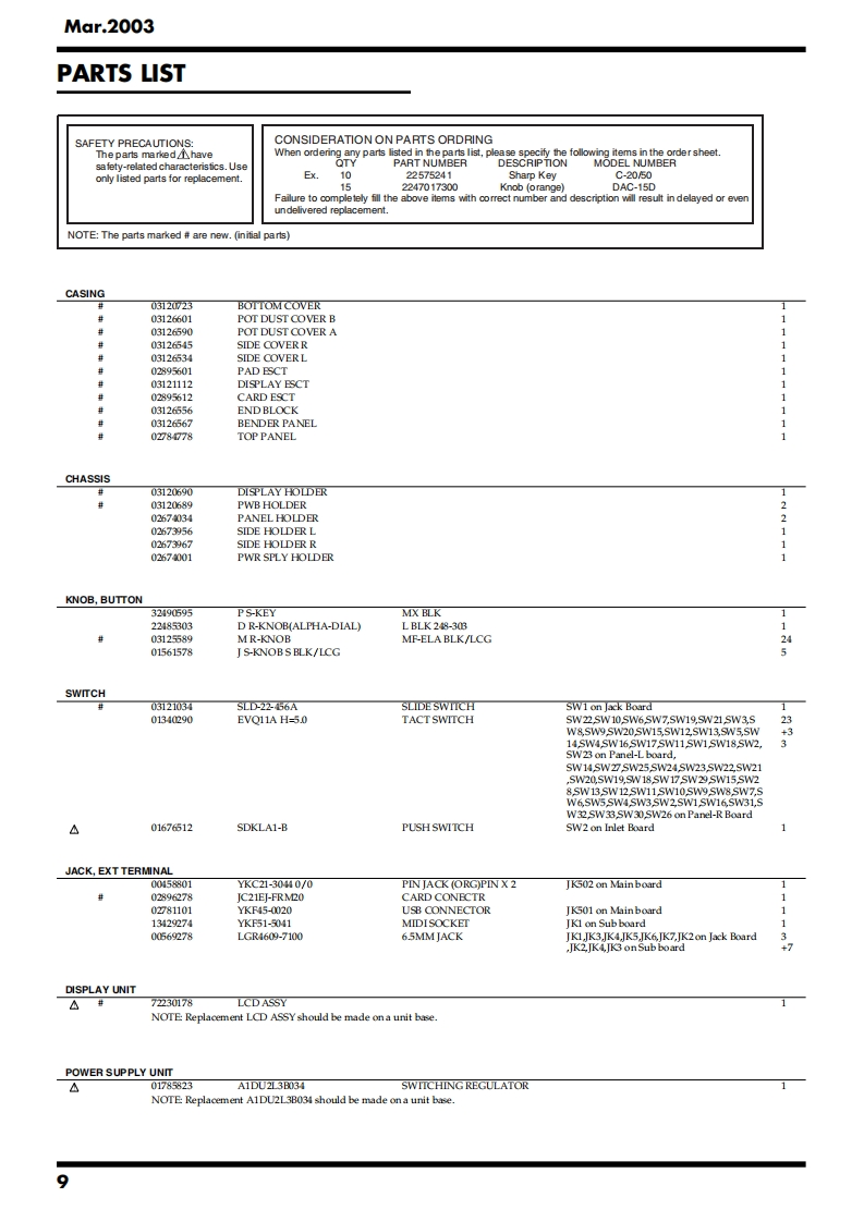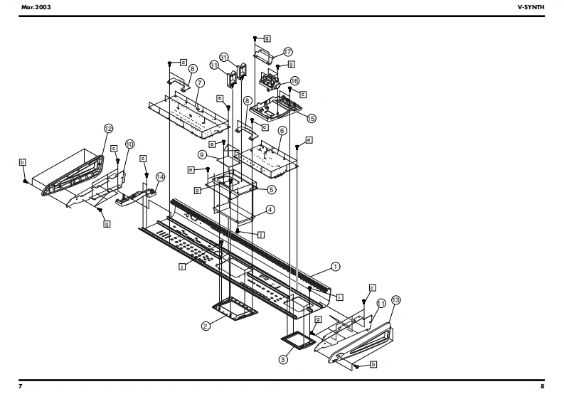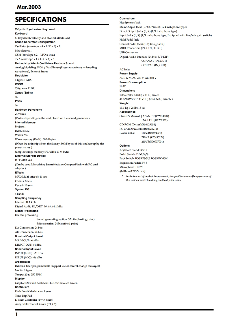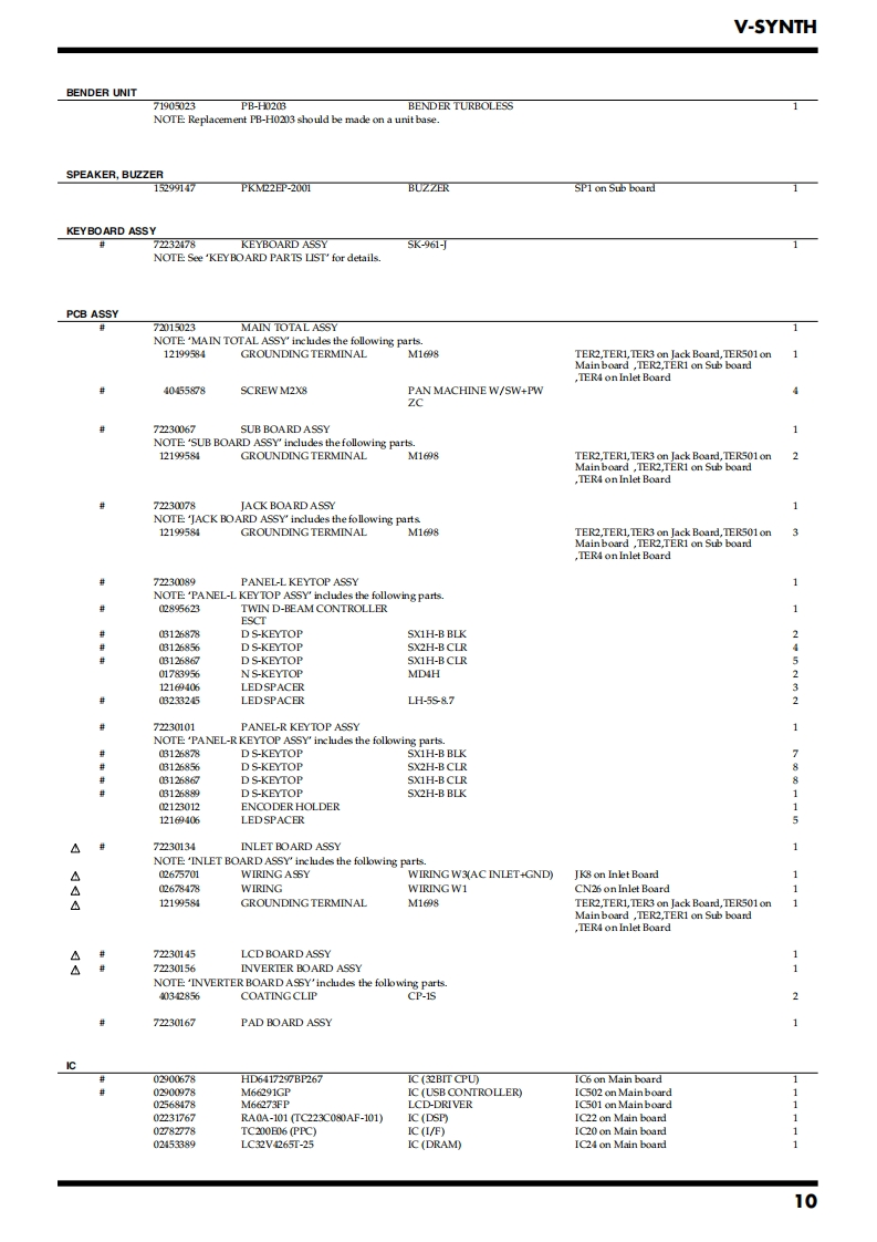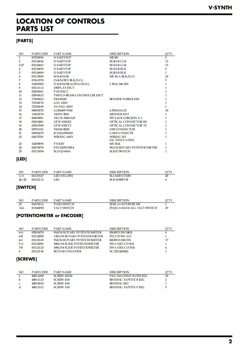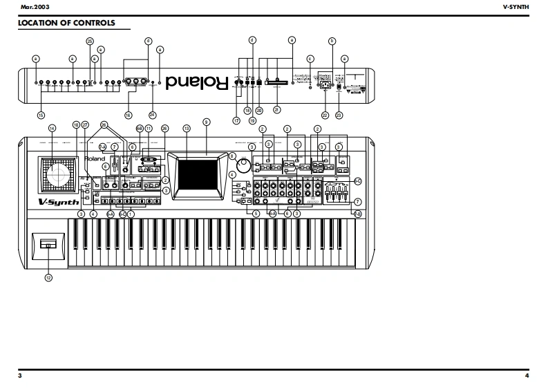 Mar.2003V-SYNTHVSunthSERVICE NOTESIssued by RJASPECIFICATIONS.....CIRCUIT BOARD(MAIN)......37LOCATION OF CONTROLS PARTS LIST......2CIRCUIT DIAGRAM(MIAN 1)..39LOCATION OF CONTROLS..3CIRCUIT DIAGRAM(MIAN 2)...............41EXPLODED VIEW PARTS LIST.......5CIRCUIT DIAGRAM(MIAN 3).......43EXPLODED VIEW....5CIRCUIT DIAGRAM(MIAN 4)................5PARTS LIST.........9CIRCUIT DIAGRAM(MIAN 5).....CHECKING THE VERSION NUMBER....1847CIRCUIT BOARD(PANEL L)..................49USERS DATA SAVE AND LOAD.......18CIRCUIT DIAGRAM(PANEL L)........51RESTORING THE FACTORY SETTINGS............19CIRCUIT BOARD(PANEL R)...53Updating the system...19CIRCUIT DIAGRAM(PANEL R).55Test mode....20CIRCUIT BOARD(RELAY).......57KEYBOARD PARTS LIST..........30CIRCUIT DIAGRAM(RELAY)0.59KEYBOARD CIRCUIT BOARD31CIRCUIT BOARD(SUB)........KEYBOARD CIRCUITDIAGRAM31.61CIRCUIT DIAGRAM(SUB-1)...63KEYBOARD DISASSEMBLY...33CIRCUIT DIAGRAM(SUB-2)................65BLOCK DIAGRAM.35ERROR MESSAGES....678888888888口而面面口白0。Copyright 2003 ROLAND CORPORATIONAll rights reserved.No part of this publication may be reproduced in any form without the written permissionof ROLAND CORPORATION.Roland17058123E0Printed in Japan(0800)(CM)