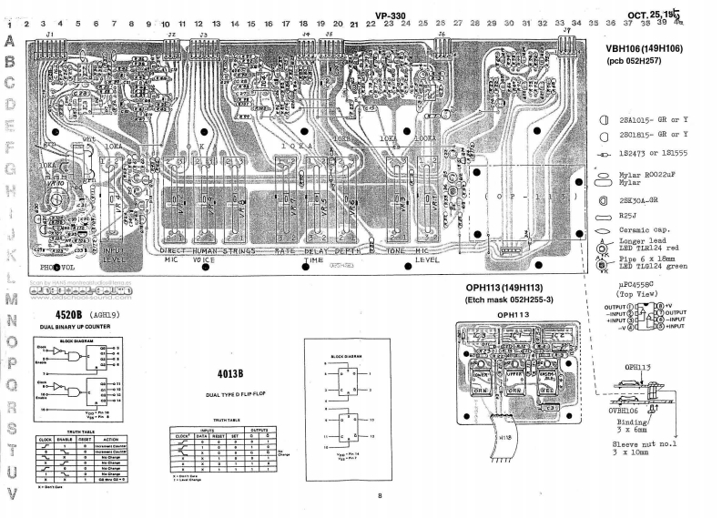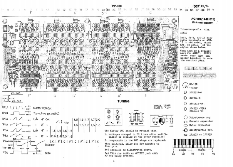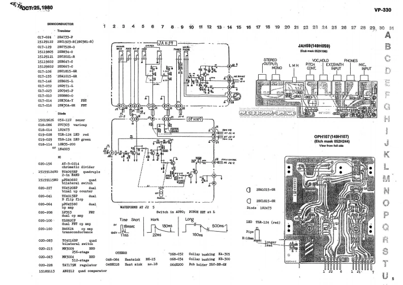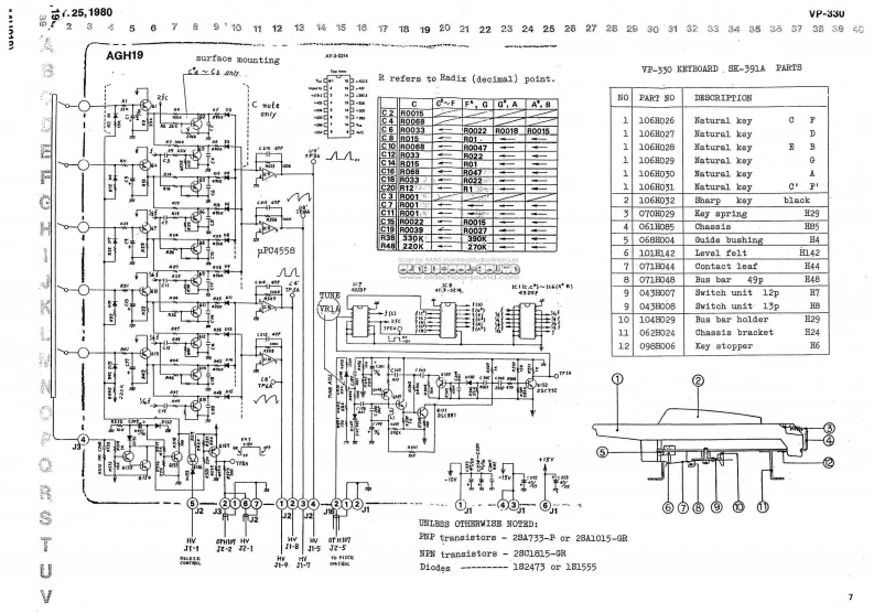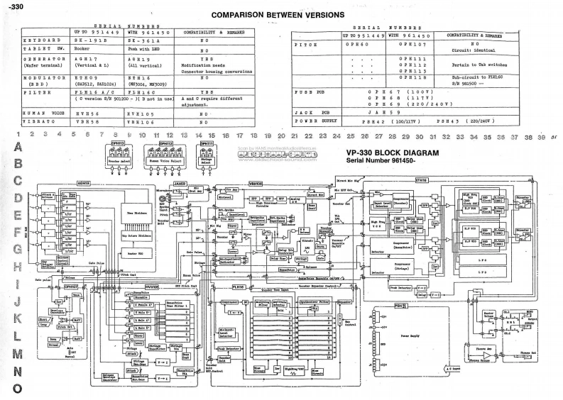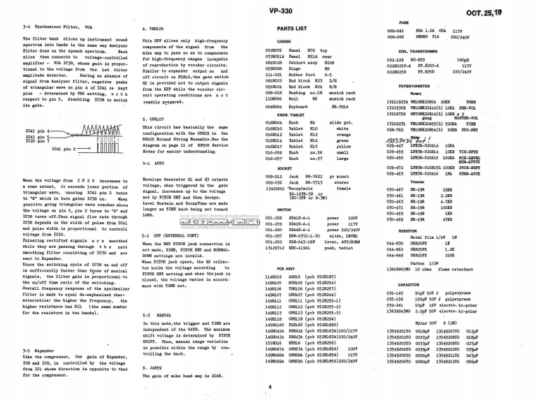 00T25,1980VP-330VP-330 SERVICE NOTESSecond EdittionAPPLICABLE SERIAL NUMBERS UNITSFLH16 SECTION:901200-or MOUNTING FLH16 "C"VERSION的lENTIRETY:961450⊙2D90BB52-608FBCIFICATIONBwww.oldschool-sound.comKeyboard-49 keya,C-C.10PP1Tunable Range士50 centsH10d▣(0.775Vma》,6.k obnsNicrophone Input.M:-15dBa.8.6k obnsPanel H51A (072H051A)InpedanceL:-30dBm,2.2数obmePover Cansunption-26 wattsWeight -14kgD1n6na1a0s------905(W)x370(D)x145《H)nNOPART NUMBERDESCRIPTIONPARP NAME010-264receptaclefemale0-TorD-则Pop panel removala112009-036dackstereo80-77138crew8E6(110H006Bushing3 x 16m oval1,3,4Panel H76009-012jaoknono80-762286018)(072出76】6001-297switahslide3w-0372-01-030Cabinet13129712switeh号ab1et-su8hw/1BDaH0-11901日220(0n228】小14016H010tabletW白1t格tablet H10End block016H012tablet24(091024)orangetablet215,16End bloek(panel)016B014tabletgreentablet4H2)(091H023J016017tabletyellovtablet7Rubber foot029-447pot.10h,0,EIE开-020A149。0-5《111-02☒11016日004知obcnob410029-453pot.1,VR2L2Bn-020A16End block renoval.Xeyboard renoval screw8Borewa 4 x 7Cmm pan5”2029-450160A,VR1,E3I3B5H-020A154 x 45cntr阳8812,17pot.1820-25029-447pot.104,1-4,m7-9LYg3组-C2011419029-459TYg5H-020147E06EVHLO5pot.10团,R613219309pot.LOKA.VR10003K25A1426016-056knob5na11knob no.56J59L1627019-029LEDredIR-124001-switchpowerSDA-detail P/LIBP2842/432813219234pot.20E,74008K20B24AGH1913219759pot.10KB x 2,gang.VH5Gy703K20B14OPE1OT修016-057红cb1arg附knob no.570001-202svitchlever8IB-643-18PBI8168x391A1029-472pot.11de,100,m317B3纽-016815132020-762pot.50ka,210g20545313219231pot.500RA,V10nZ20A55RolandPrimted in Japan AE-2