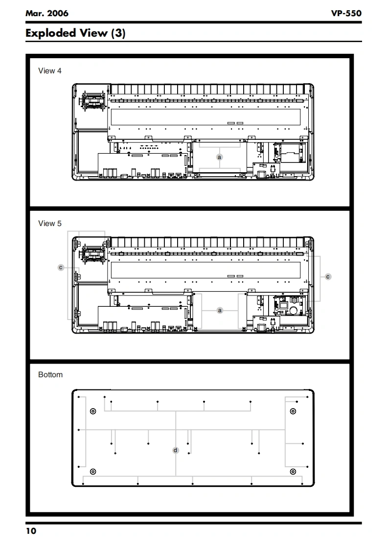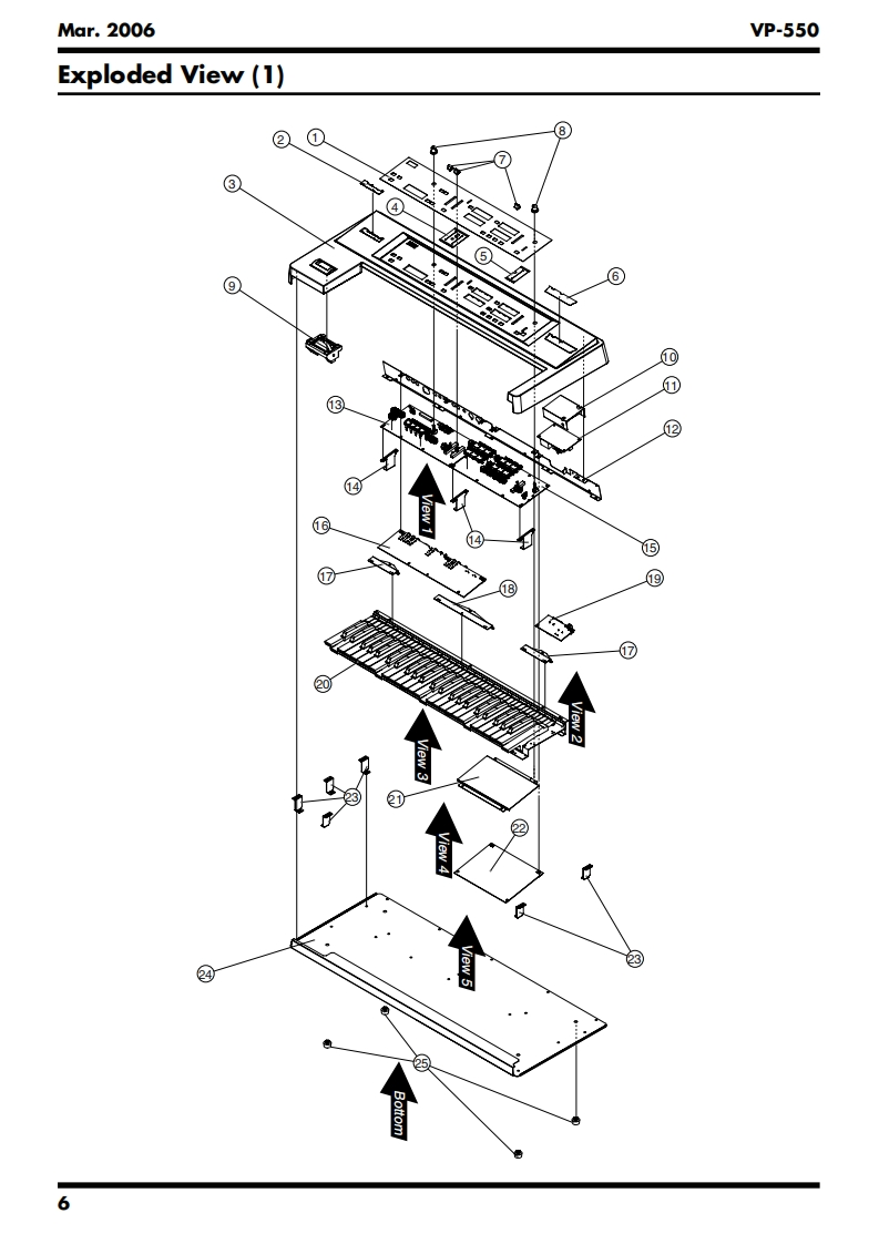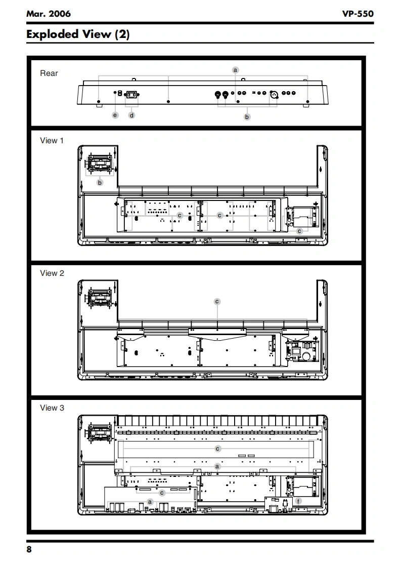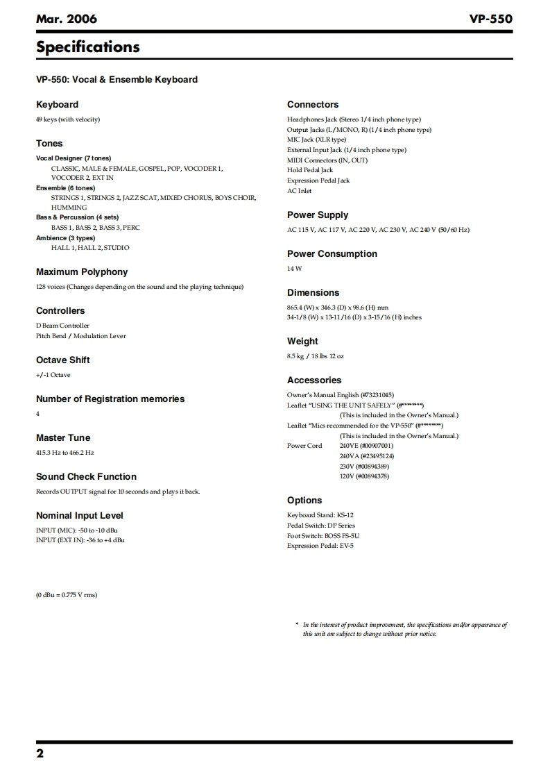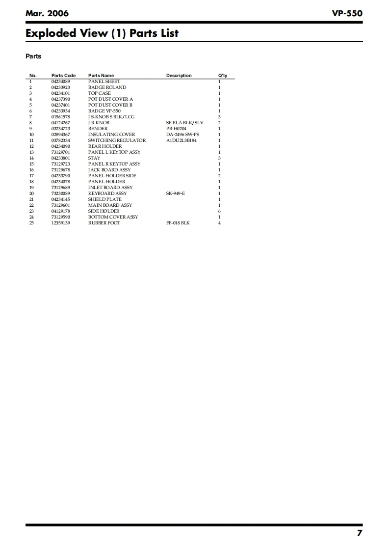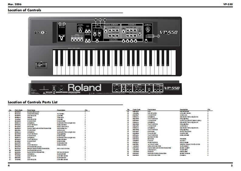 Mar.2006VP-550SERVICE NOTESVOCAL ENSEMBLE KEYBOARDIssued by RJATable of ContentsSpecifications......02Keyboard Circuit Board......28Location of Controls..4Keyboard Circuit Diagram..28Location of Controls Parts List.....4Circuit Board (MAIN BOARD:1/2)....................30Exploded View (1).6Circuit Board (MAIN BOARD:2/2)....................32Exploded View (1)Parts List...Circuit Board (JACK BOARD,INLET BOARD:1/2)Exploded View (2)..........834Exploded View (2)Parts List.........9Circuit Board (JACK BOARD,INLET BOARD:2/2)Exploded View (3).........10.34Exploded View (3)Parts List..11Circuit Board(PANEL L BOARD,PANEL R BOARD)Keyboard Parts List...1236PartsCircuit Diagram(MAIN BOARD:1/2).38Checking the Version.....16Circuit Diagram(MAIN BOARD:2/2)40Factory Reset........16Circuit Diagram (JACK BOARD:1/2).42How to Update the System Program16Circuit Diagram (ACK BOARD:2/2).................44Test Mode......16Circuit Diagram(PANEL L BOARD).......46Keyboard Disassembly.21Circuit Diagram (PANEL R BOARD).....4.8Block Diagram24Circuit Diagram (INLET BOARD)..5.0Wiring Diagram.….26Note for Panel L Board Assy.....50RolandR55知Copyright 2006 ROLAND CORPORATIONAll rights reserved.No part of this publication may be reproduced in any form without the written permissionof ROLAND CORPORATION.Roland17058412E0Printed in Japan(0400)(SC-KWS)
