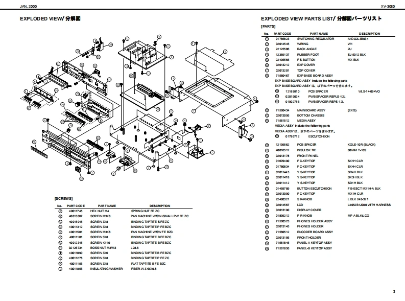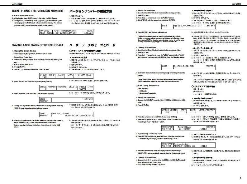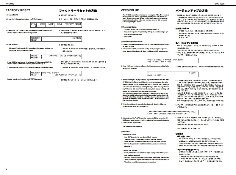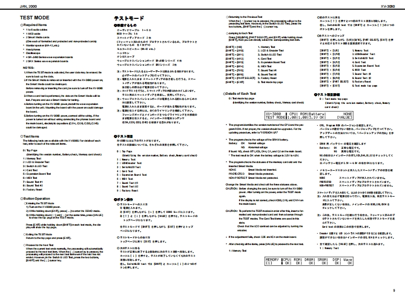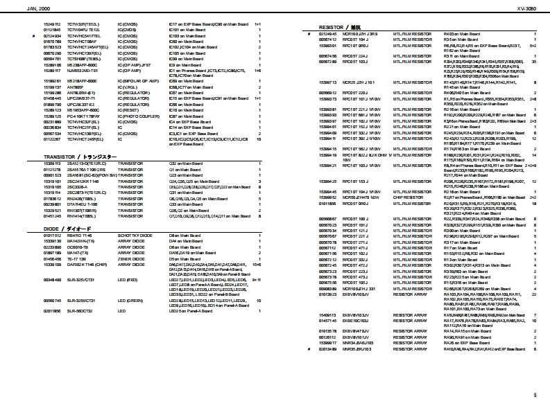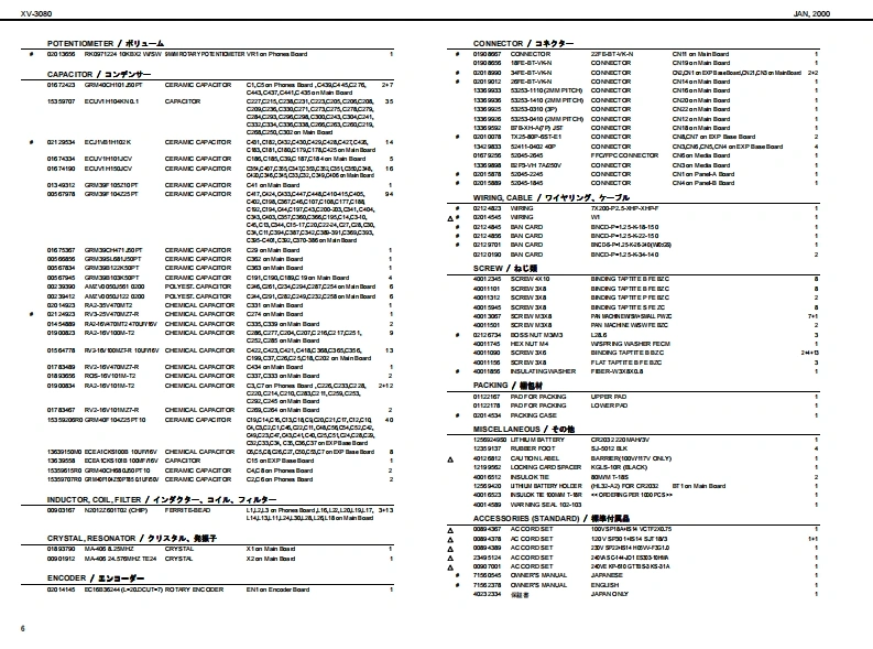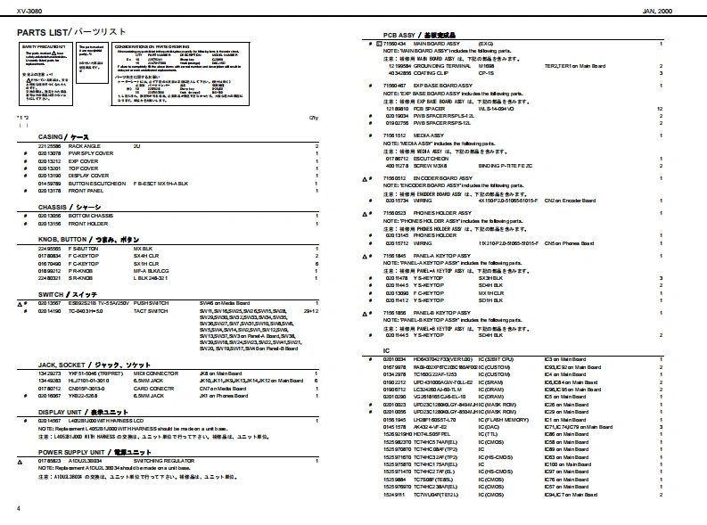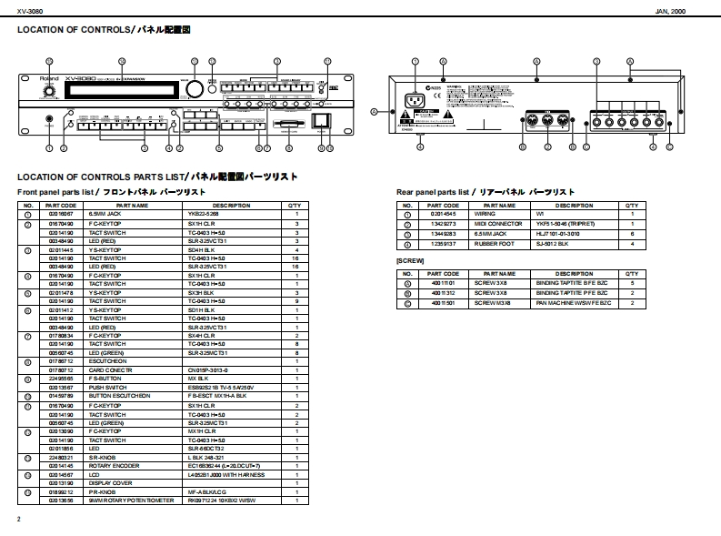XV-3060A2000SERVICE NOTESSPECIFICATIONS主在仕檬XVB▣B▣XV.3080 128 voice sound modubW-3你2盘术术又+竹方少卡+毛乡1一儿First EditionGM Level 2 systom Comp atible28VCICEs 6x EXPANSIONIssued by RJA●-b●扬开●Pa数●Connectors餐4居方N2yNL吗,悬,A四0车u0nq,RB7为3gkL,段Oupt d时G7勺+9,k号6L《过Madimu PolyphoryCC4d0,R附●最大弹局音数157a14d1-的通香八9F·甲9?,volons面3来-值,,罐身TABLE OF CONTENTS目次PageSPECIFICATIONS.又心y夕/生在仕缣...1●那泉是)宽事6国(笔-tr北nu鸣0g上gk9三7n》LOC可ONOF C0 NTROLS..........米儿配置☒...,2龙K小口a0,星L0 CATION OF CONTROLS PARTS LIST..バ米儿配置园-yy又卜........2●Exparsion slots●批须天口7kEXPL0 DED VIEW.......分解同.....3Wawve Epanion Bourd●清贵冒功会0a:4a女nEXPLODED VIEWPARTS UIST......分解凤-y少又卜….313w欲-PARTS UST.-yy卜”…4-62流动●外影横IDENTIFYING THE VERSION NU阳ER../バ一至十>/一D認方法7●0 ime raioms●内a城时地时oy的x1丹x输0件国,通【3USER DATASAVE AND LOAD...于-D也-ブ上口-ド..….78赠#4n6P路21运特●刊学卡”量=7y772…42FACT0 RY PRESET..77夕卜-列也y卜D方法.8P (1CAlLevel2Patde256Pertrunon:02x2na动Urack mont tp的:职HOWTO VERSION UP THE FLASH ROM..フラy之ュR0N-岁3y7yプD方法....8量量TEST0DE....于又卜毛-ド.....9-11●为七M4.4 kg1品物.4BL0 CK DIAGRAM.....口y夕圆·配同.12弘ggkD口g最心9》付黑晶CIRCUIT BOARD....................基板园.………………1318●U装reo时y●A6心的时出量+a<1V红包4CIRCUIT DIAGRAM..回路园..1929Onrnin-F 00900)ERR0 R MESSAGES.......工ラ-·y也-少月ntng4●1一…是一Pover cod%手U里●E地deOy●利亮品方三-号过为州-解(2-195a23W价88●Ewdn●外都是)一随国幸C直制队:鱼Wave Fpanion Boadd一k·甲7一F1细联a气细0中2与垂&n国南“In te intematof prodct●Dahy●工7x夕k6山山西由常业danda itnespudL4#:1?红尾日用到0出古●甲(具九Copyright2000 ROLAND CORPORATIONAll righs neserved.No part ol ths publcation may be reproduaced in amy lom wthout the wrton permiszlon of ROLAND OORPORAT ION.末吉价一遥.古儿《柱企影香断下传零:丘数十香之上垂号儿重t,Roland17059010Printed in Japen AA0D B)