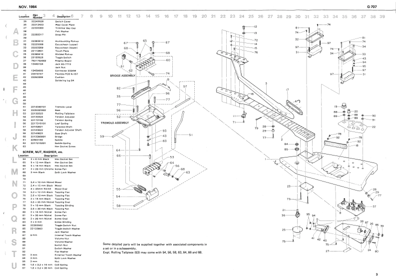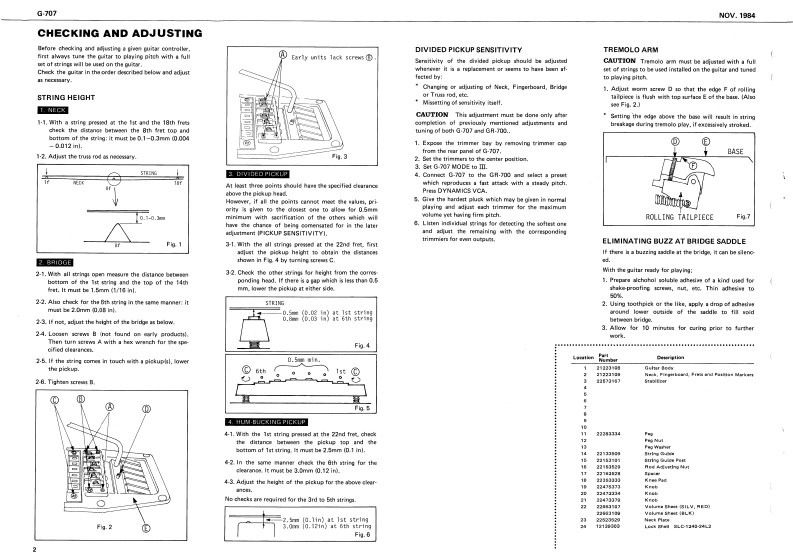 NOV.1984G707G-7▣7SERVICE NOTESPARTS LISTFirst EditionPICKUPHEAD22305610Divided22283334Peg22383612Husbucking22L33509String CuidePHOTO:SILVER22153101String Guide Post229a55422153529Rod Adjusting NatSaing GuldeTREMOLO UNIT21390022563171Trennlo Ask'y(including the followingBODY21223108SILVER对A4 aninghut2115522213323Kolling Tailpiuce2122311LBLACK2235333202Bmwm212231t0RED22573t7002214340100Tr=o10Leve¥22133908Br1d6eA'y212231021PCB ASSEMBLY212231097921702002(Pb22913B5303)STABILIZER2257316700POTENTIOMETER13219120EVH-RTA304D55500DLEFT HANDER GUITAR PARTS22221J01GUITAR TOUE13219106EVH-RTA304854508B21223112BodyCOF.EDIT (RESONANCE).21223113Week《inelod4gDe时hxta3LVO (VIBRATO DEPTE)221a261013219772K.J-hA322163500gB,50gBPosition Harkers)22573190Stabil12er139190H0615C119-47KBtrimer22213463B是ckPe113219766J-A3225450KBx222563176Trenolo Block Ass'yBALANCE(incloding the follovingparts)223533)5BaseIc2213352615189136M52181.22173158Leaf Spring15159104TlT4011B222283316PLVH内TA304D855KKD7922000000Freang Boardg12219120m(×6229251521211Kc622436333DIODE22143403Treeolo Lever-PeL,GW6N224M904=21501910315-2473122105Keb22475J73引OTHERS22212217SWITCH22910167Flexfble pebPo EVH-NTA334DS4TED131696040FTE-43B2222330Escutcheon611666423133525t0仅反1e22221309EscutcheonKeb224714CUITAR PICKUP SELECTOR22663107SheetVOLUME (SILVER.22717例RED versioa)22661109SheetVOLUMEJACK.CONNECTOR(BLACK versioa)134395051C-1204-2324Mconnector22$5333Knee Fad121¥303SLC-1204-2412 Loek She11221635800Spacer13440104sC-7713lack22523529Neck 7late22213423ack Fanel22243528Svitch Cover122211422KNOB22333309Trirnar Cap2228331722475373clearStrap Pin344042247333422473379togzle Svitch24象m白t年LG1204734M61343606Lock Snoel SLC-1204-34L21121393001RolandPrinted in Japan B3