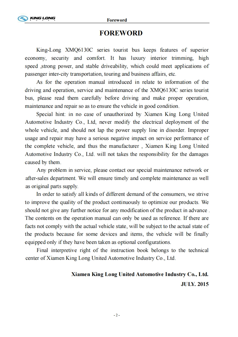 金龙客车king-long-xmq6130c零部件备件目录手册图册找手册网5小时前发布关注私信2.37MB136页029金龙客车king-long-xmq6130c零部件备件目录手册图册此内容为付费资源,请付费后查看¥39¥49黄金会员免费钻石会员免费登录购买付费资源 第1页 / 共136页 第2页 / 共136页 第3页 / 共136页 第4页 / 共136页 第5页 / 共136页 第6页 / 共136页 第7页 / 共136页 第8页 / 共136页 第9页 / 共136页 第10页 / 共136页 试读已结束,还剩126页,您可下载完整版后进行离线阅读 THE END陕汽/金龙 文本预览 )KING LONGUOPERATION MANUALUser's GuideKing-Long XMQ6130C series tourist busXiamen King Long United Automotive Industry Co.,Ltd.1- 查看更多 收起部分 喜欢就支持一下吧收藏