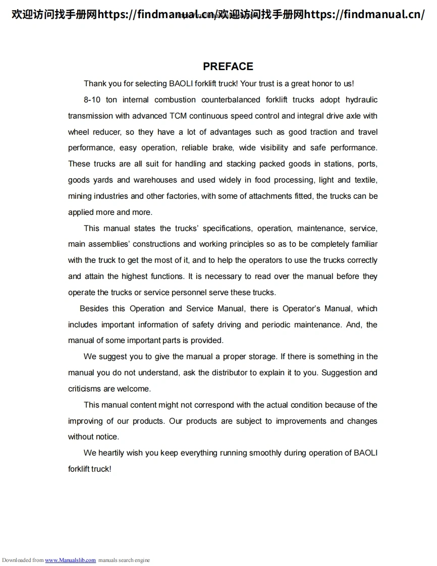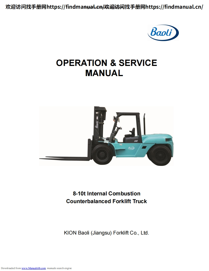 欢迎访问找手册网https:/findmanual.cny欢迎访间找手册网https:/findmanual..cn/OriginalBaoliinstructionsOPERATION SERVICE MANUAL8-10TInternal CombustionCounterbalanced Forklift TruckCPCD 80CPCD 100KION Baoli (Jiangsu)Forklift Co.,Ltd.Downladed from www.Manualslib.com mamunls search cngine