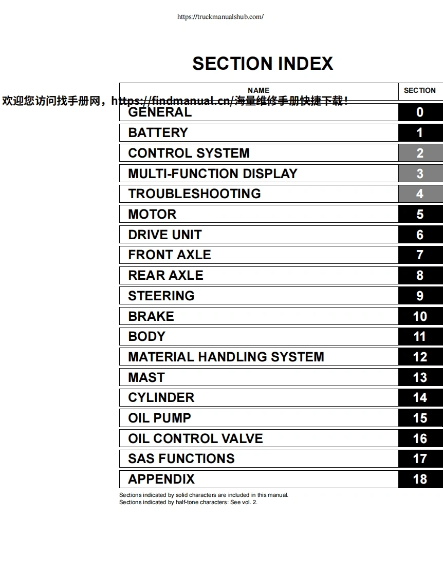 丰田叉车Toyota-Electric-Powered-Forklift-8FBCU20~32_8FBCHU25-Repair-Manual维修手册含电器液压原理图找手册网3小时前发布关注私信4.04MB43页023丰田叉车Toyota-Electric-Powered-Forklift-8FBCU20~32_8FBCHU25-Repair-Manual维修手册含电器液压原理图此内容为付费资源,请付费后查看¥39¥49黄金会员免费钻石会员免费登录购买付费资源 第1页 / 共43页 第2页 / 共43页 第3页 / 共43页 第4页 / 共43页 第5页 / 共43页 第6页 / 共43页 第7页 / 共43页 第8页 / 共43页 第9页 / 共43页 第10页 / 共43页 试读已结束,还剩33页,您可下载完整版后进行离线阅读 THE END三一/合力/大连叉车/丰田叉车/林德叉车/三菱叉车/永恒力 文本预览 https://truckmanualshub.com/TOYOTA欢迎您访问找手册网,https:/findmanual.cn/海量维修手册快捷下载!REAIMANUAL8FBCU20,25,28,30,328FBCHU 25VOL.1Pub.No.CU346 查看更多 收起部分 喜欢就支持一下吧收藏