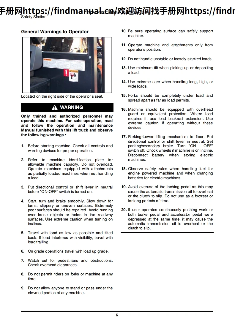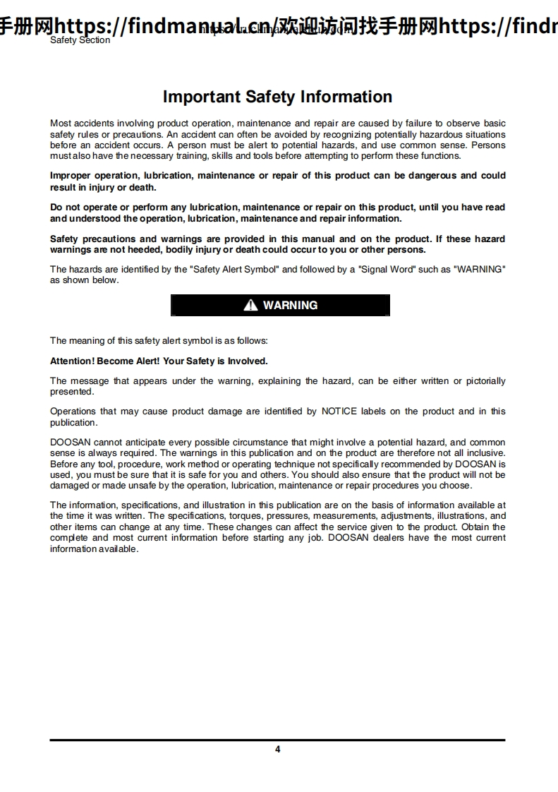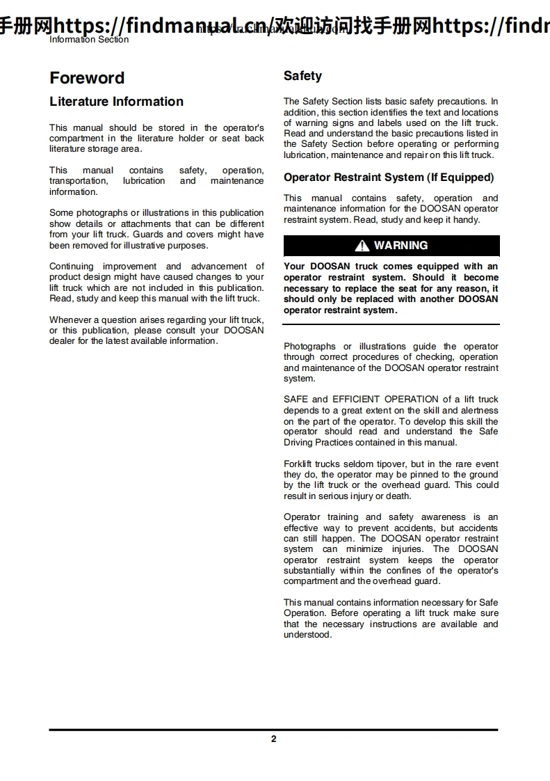 斗山叉车Doosan-D50S-5–D60S-5–D70S-5D80S-5–D90S-5G50S-5–G60S-5–G70S-5-Lift-Trucks-Operations—Maintenance-Manual维修手册含电器液压原理图找手册网1小时前发布关注私信8.71MB204页050斗山叉车Doosan-D50S-5–D60S-5–D70S-5D80S-5–D90S-5G50S-5–G60S-5–G70S-5-Lift-Trucks-Operations—Maintenance-Manual维修手册含电器液压原理图此内容为付费资源,请付费后查看¥39¥41黄金会员免费钻石会员免费登录购买付费资源 第1页 / 共204页 第2页 / 共204页 第3页 / 共204页 第4页 / 共204页 第5页 / 共204页 第6页 / 共204页 第7页 / 共204页 第8页 / 共204页 第9页 / 共204页 第10页 / 共204页 试读已结束,还剩194页,您可下载完整版后进行离线阅读 THE END中联重科/山河智能/Doosan/BT 文本预览 手册网https:/findmanual.cn欢迎访间找手册网https:/findSB2356E03OperationMaintenance ManualFORKLIFTSD50S-5,D60S-5,D70S-5D80S-5,D90S-5G50S-5,G60S-5,G70S-5Original Instruction1304 查看更多 收起部分 喜欢就支持一下吧收藏