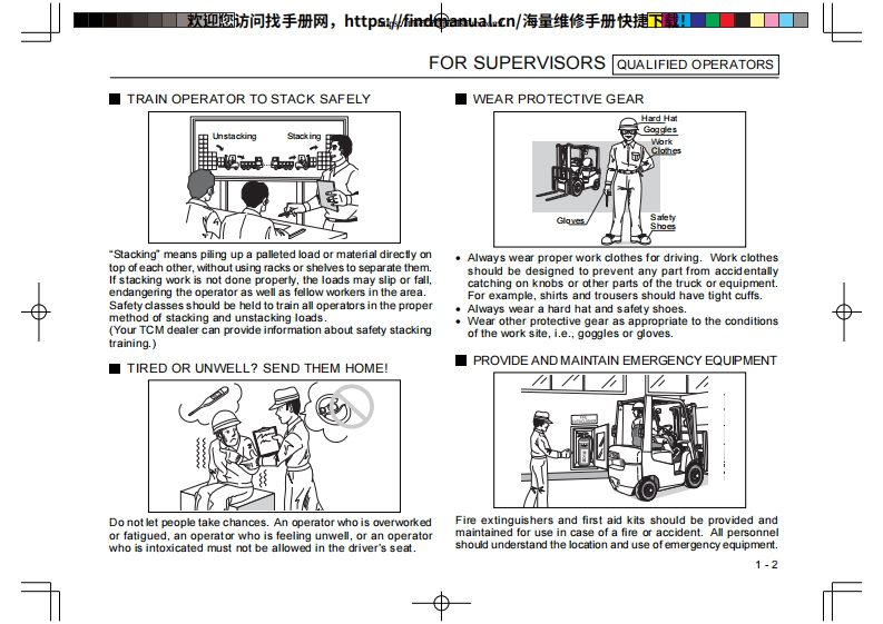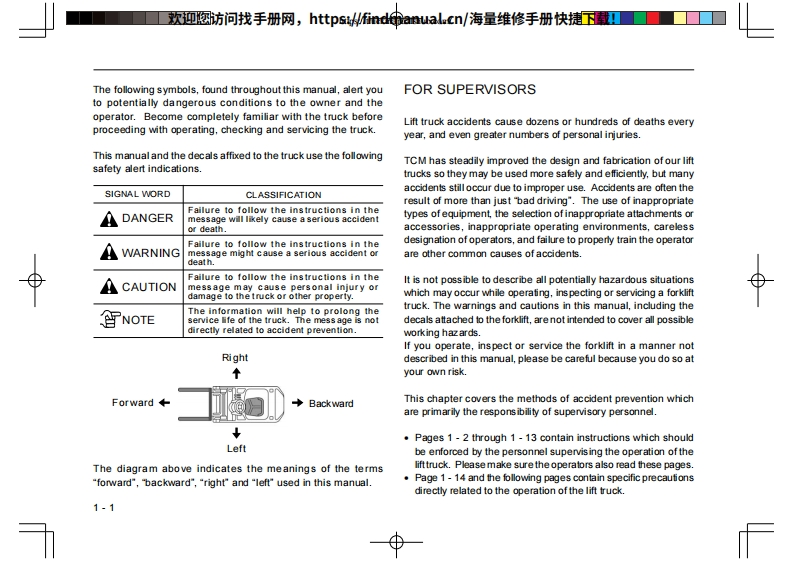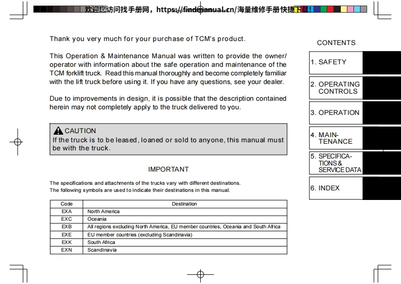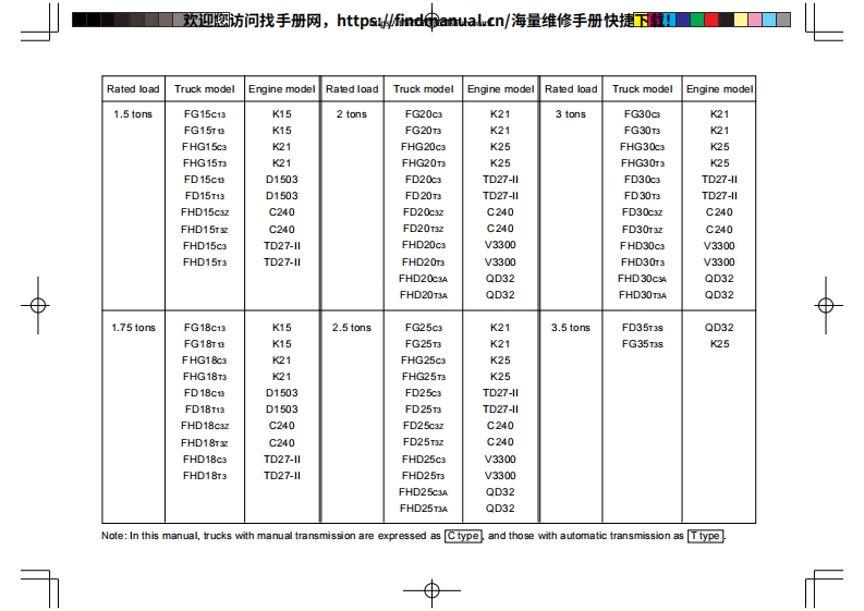 欢迎囡访问找手册网,httpst/findeanual.cn/海量维修手册快捷下载■工No.OF-2BOEETCMOPERATIONMAINTENANCE MANUALFORKLIFT TRUCKGas.LPG PoweredDiesel poweredFG15c13 FHG15c3FD15c13FHD15c3zFHD15c3FHD20c3AFG15T13FHG15T3FD15T13FHD15T3ZFHD15T3FHD20T3AFG18c13FHG18c3FD18c13FHD18c3zFHD18c3FHD25c3AFG18T13FHG18T3FD18T13FHD18T3zFHD18T3FHD25T3AFG20c3FHG20c3FD20c3FD20c3ZFHD20c3FHD30c3AFG20T3FHG20T3FD20T3FD20T3ZFHD20T3FHD30T3AFG25c3FHG25c3FD25c3FD25c3ZFHD25c3FG25T3FHG25T3FD25T3FD25T3ZFHD25T3FG30c3FHG30c3FD30c3FD30c3ZFHD30c3FG30T3FHG30T3FD30T3FD30T3ZFHD30T3FG35T3SFD35T3sIt is the responsibility of the operator and supervisor to read and understand this manual.Protect the earth and be kind to your lift truck.TCM CORPORATION