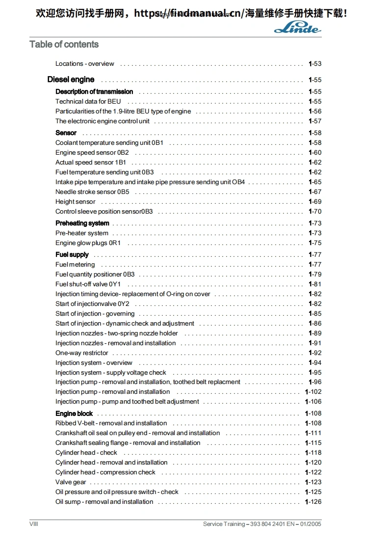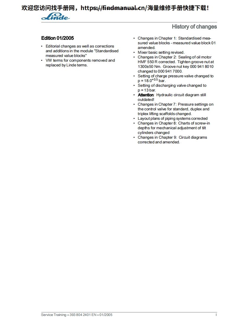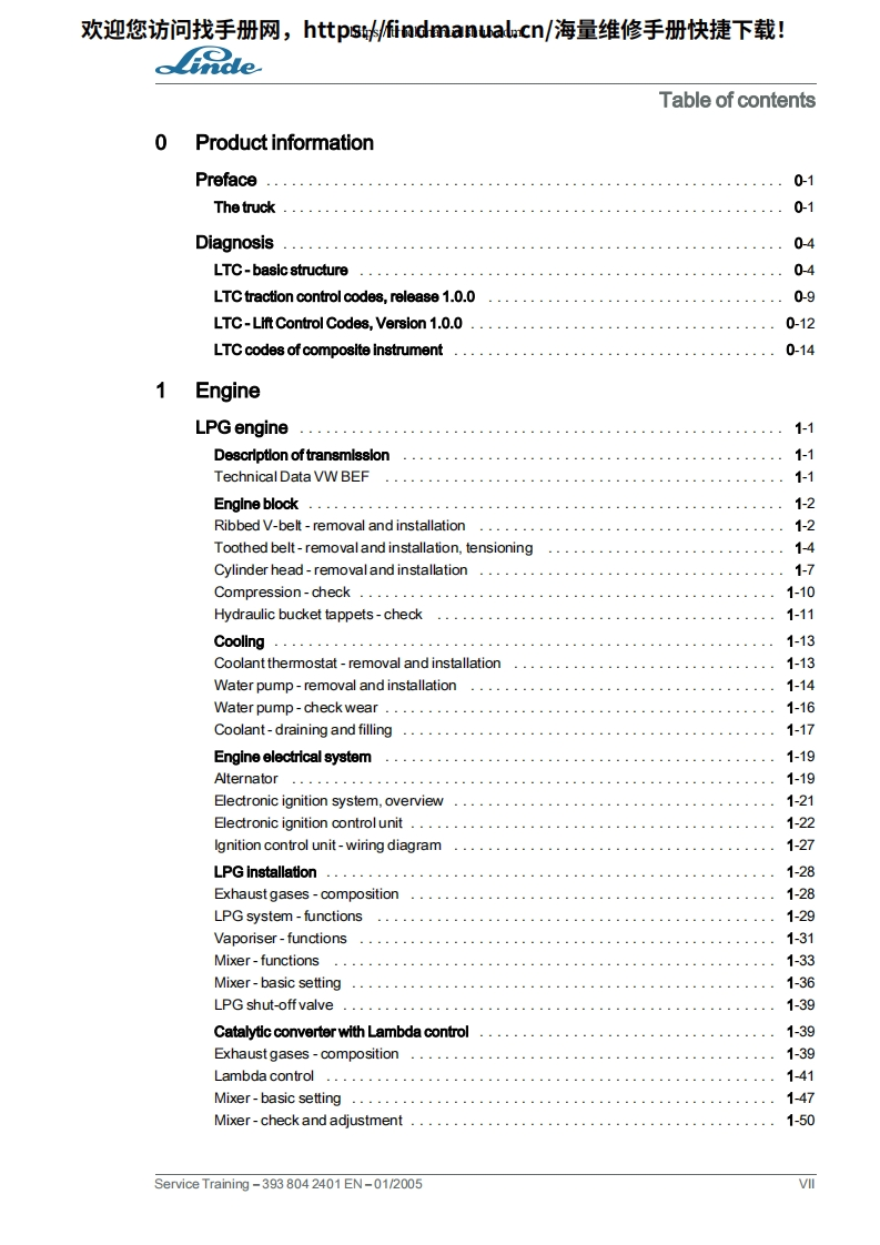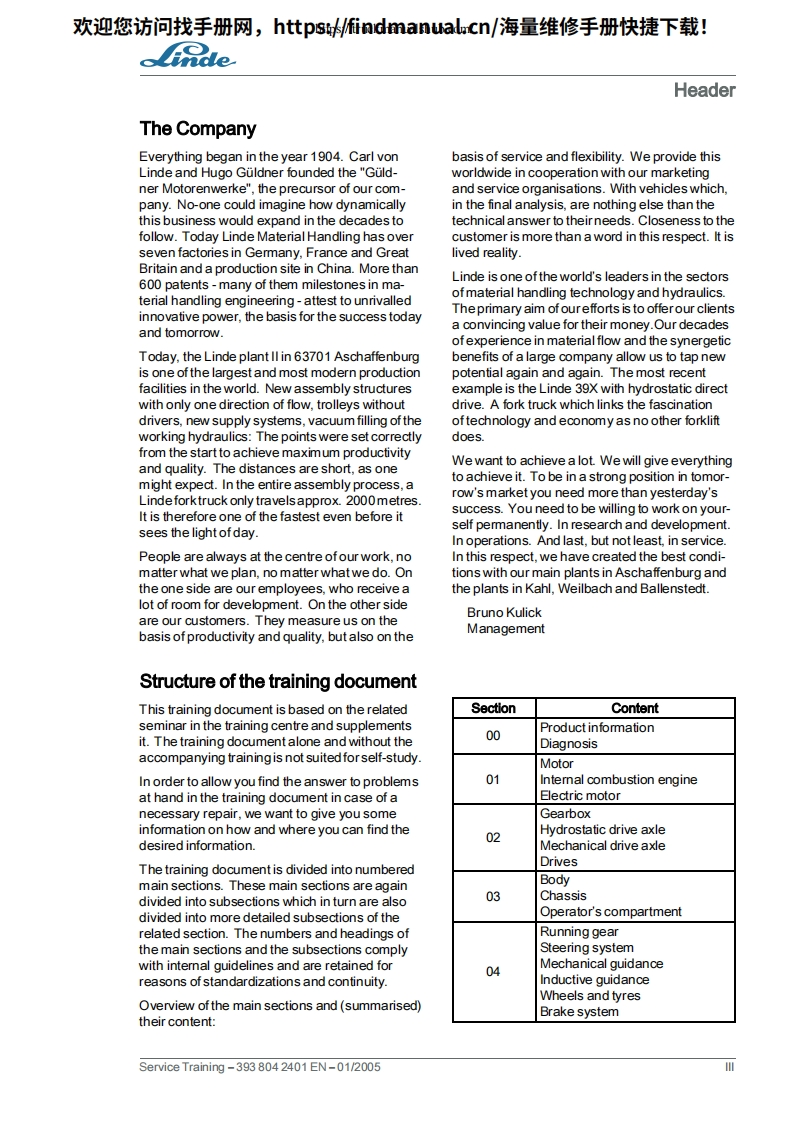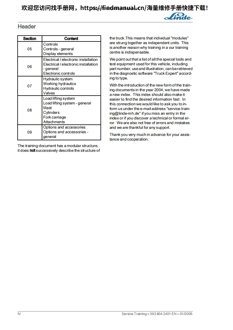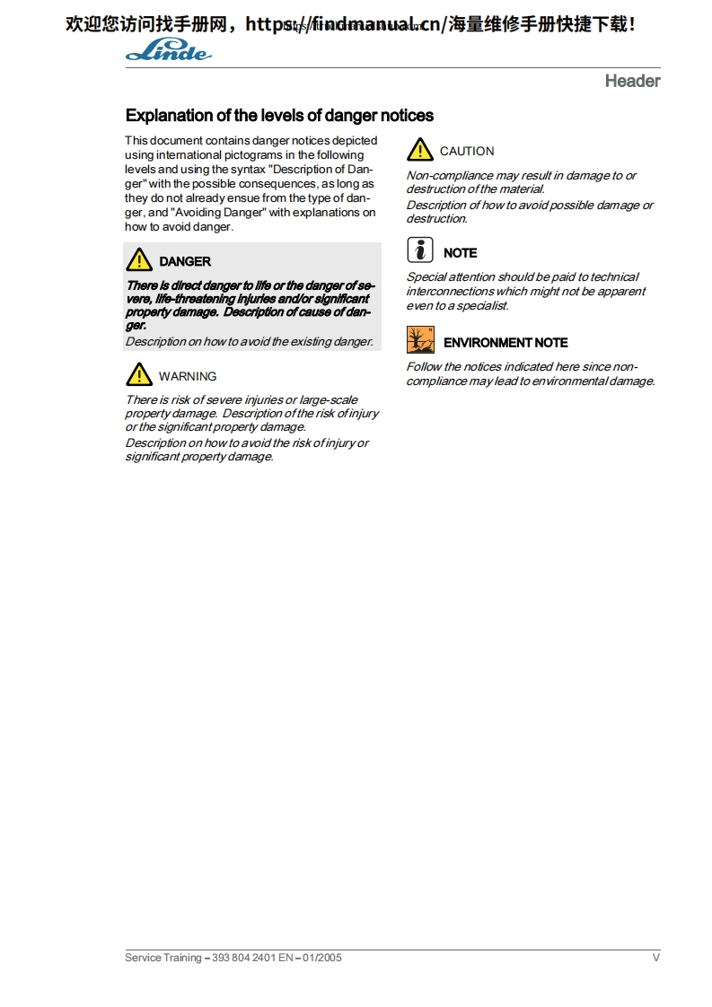 欢迎您访问找手册网,https://findmanual.cn/海量维修手册快捷下载!Service TrainingLinde IC Engined TruckH30D H30T H35D H35TSeries 393Edition 01/2005This service document is provided for use only and remains the exclusive property of LindeAG.Linde Material Handling Division.Service Training-393804 2401 EN-01/2005