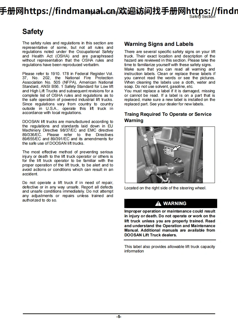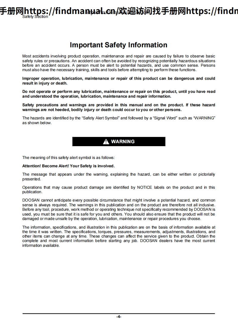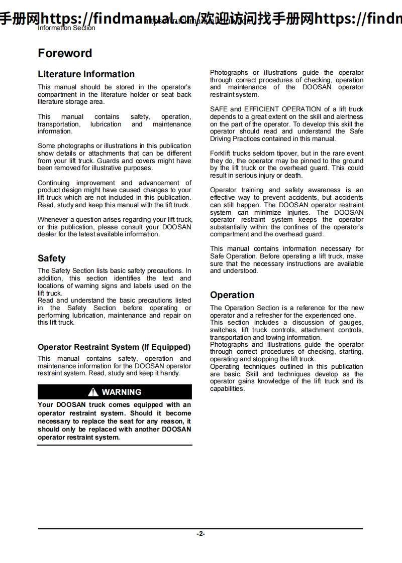 斗山叉车Doosan-G20P-5–G25P-5–G30P-5–G33P-5–G35C-5GC20P-5–GC25P-5–GC30P-5–GC33P-5-Lift-Trucks-Operations—Maintenance-Manual维修手册含电器液压原理图找手册网1小时前发布关注私信6.12MB210页047斗山叉车Doosan-G20P-5–G25P-5–G30P-5–G33P-5–G35C-5GC20P-5–GC25P-5–GC30P-5–GC33P-5-Lift-Trucks-Operations—Maintenance-Manual维修手册含电器液压原理图此内容为付费资源,请付费后查看¥39¥41黄金会员免费钻石会员免费登录购买付费资源 第1页 / 共210页 第2页 / 共210页 第3页 / 共210页 第4页 / 共210页 第5页 / 共210页 第6页 / 共210页 第7页 / 共210页 第8页 / 共210页 第9页 / 共210页 第10页 / 共210页 试读已结束,还剩200页,您可下载完整版后进行离线阅读 THE END中联重科/山河智能/Doosan/BT 文本预览 手册网https:/findmanbal.on欢迎访间找手册网https:/findrSB2349E02OperationMaintenance ManualLIFT TRUCKSD20S5,D25S5,D30S5,D33S5,D35C5G20E5,G25E-5,G30E5GC20E-5,GC25E-5,GC30E-5,GC33E-5G20P5,G25P5,G30P5,G33P5,G35C5GC20P-5,GC25P-5,GC30P-5,GC33P-50712 查看更多 收起部分 喜欢就支持一下吧收藏