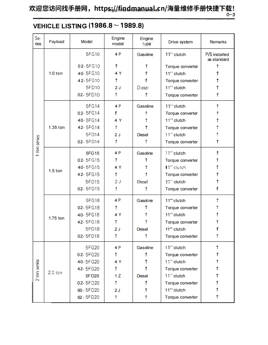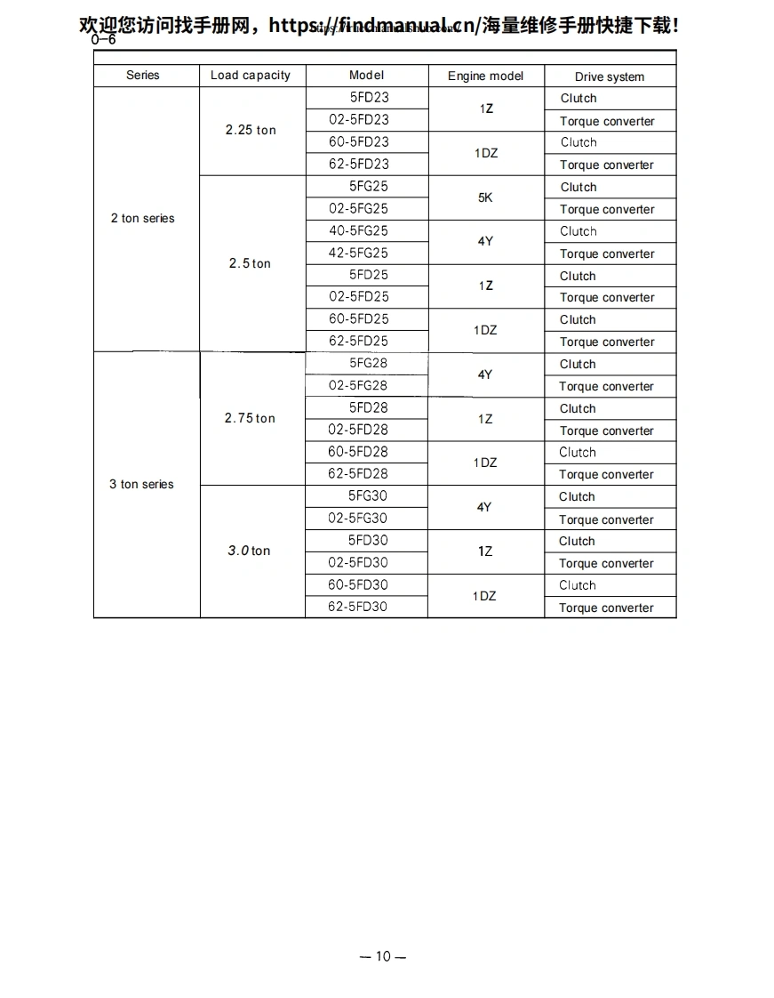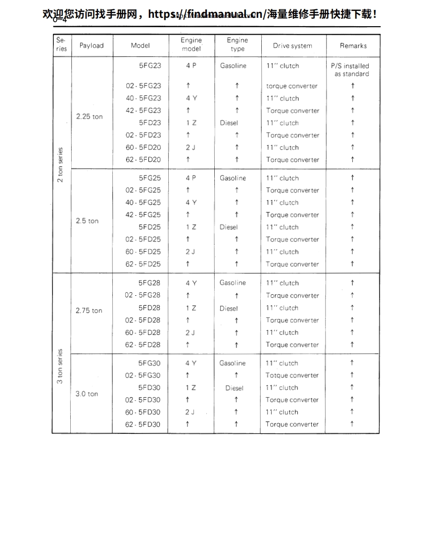 欢迎您访问找手册网,https4 findmanual.cn/海量维修手册快捷下载!FOREWORDThis manual covers the service procedures of the TOYOTA FORKLIFT 5FG10-30/5FD70-30 Series.Please use this manual for providing quick,correctservicing of the corresponding forklift models.These models on the market since August 7986 are subject to minor changesin September 7986.This manual deals with the models produced in the periodbetween August 7988 and August 7989 as well as the models as of September1989(after minor changes).Any change or modifications thereafter will be informed by Toyota IndustrialVehicles'Parts Service News.For the service procedures of the mounted engine,read the repair manualslisted below as reference together with this manual.(Reference)Repair manuals related to this manual are as follows:TOYOTA INDUSTRIAL VEHICLE 4P ENGINEREPAIR MANUAL (No.CE604)TOYOTA INDUSTRIAL VEHICLE 4Y ENGINEREPAIR MANUAL (No.CE602)TOYOTA INDUSTRIAL VEHICLE 2J ENGINEREPAIR MANUAL (No.CE603)TOYOTA INDUSTRIAL VEHICLE 1Z ENGINEREPAIR MANUAL (No.CE601)TO YOTA INDUSTRIAL VEHICLE 5K ENGINEREPAIR MANUAL (No.CE677)TOYOTA INDUSTRIAL VEHICLE 1DZ ENGINEREPAIR MANUAL (No.CE618)(Note:2-3 ton models mounted with 2J,1DZ diesel engine are only availablein designated areas.)TOYOTA MOTOR CORPORATION