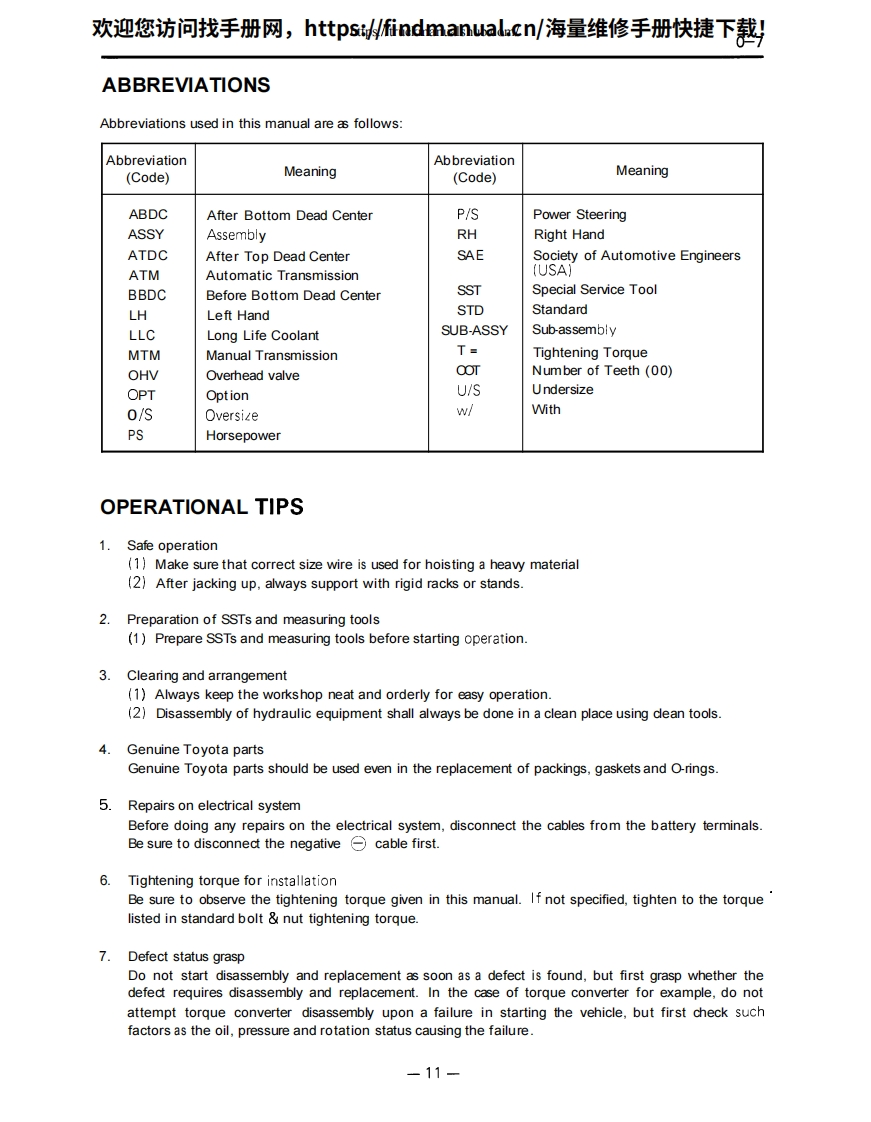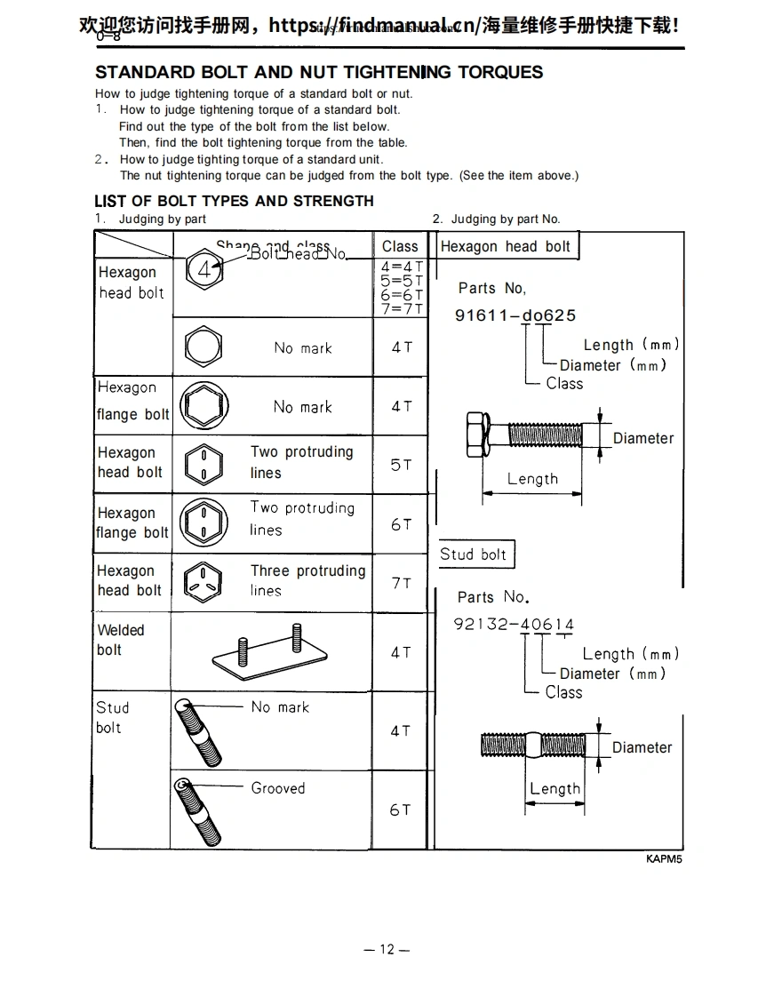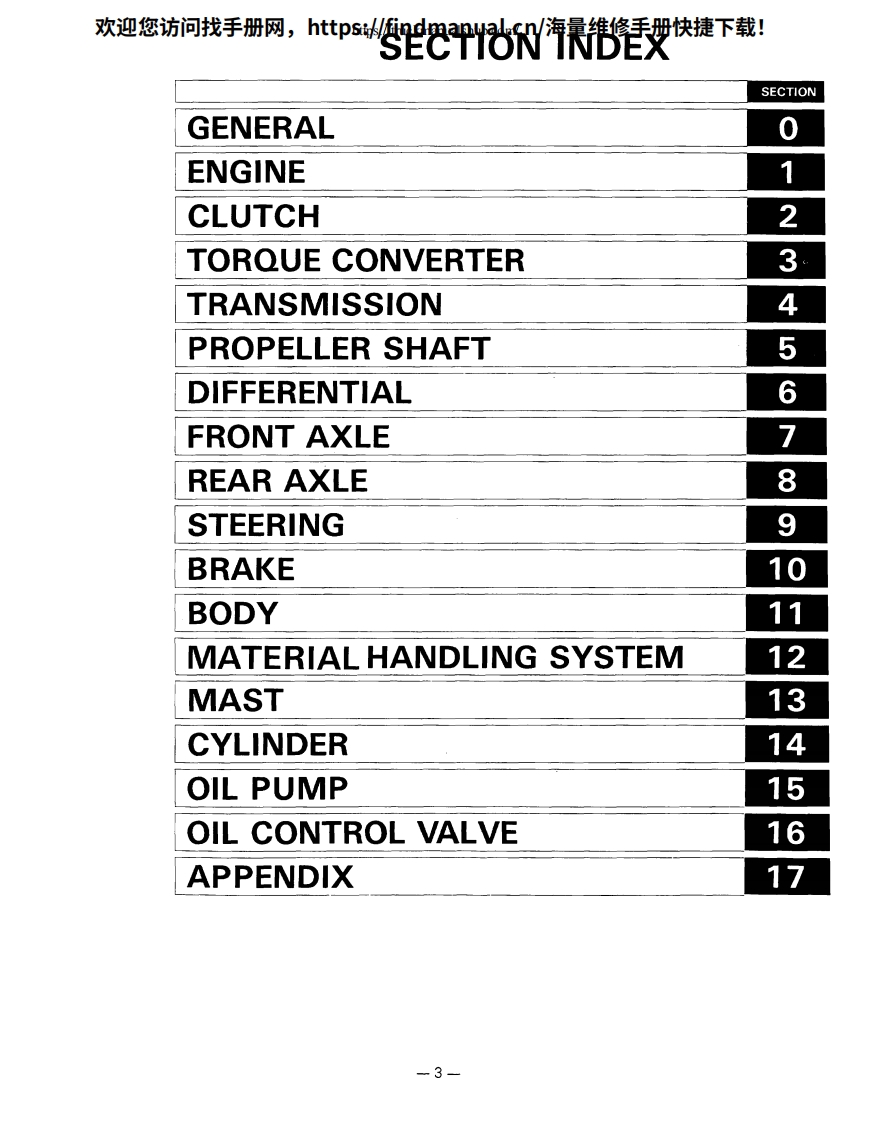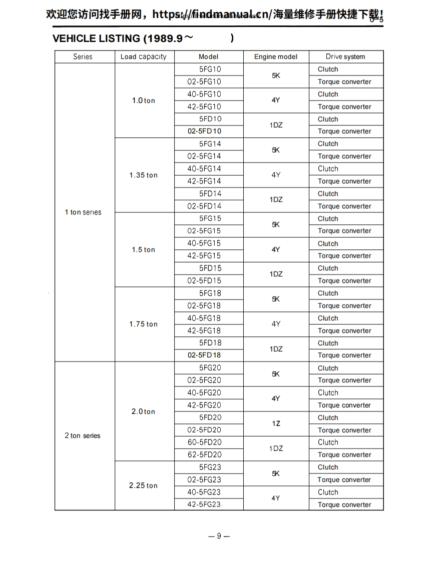 欢迎您访问找手册网,https4 findmanual.cn/海量维修手册快捷下载!FOREWORDThis manual covers the service procedures of the TOYOTA FORKLIFT 5FG10-30/5FD70-30 Series.Please use this manual for providing quick,correctservicing of the corresponding forklift models.These models on the market since August 7986 are subject to minor changesin September 7986.This manual deals with the models produced in the periodbetween August 7988 and August 7989 as well as the models as of September1989(after minor changes).Any change or modifications thereafter will be informed by Toyota IndustrialVehicles'Parts Service News.For the service procedures of the mounted engine,read the repair manualslisted below as reference together with this manual.(Reference)Repair manuals related to this manual are as follows:TOYOTA INDUSTRIAL VEHICLE 4P ENGINEREPAIR MANUAL (No.CE604)TOYOTA INDUSTRIAL VEHICLE 4Y ENGINEREPAIR MANUAL (No.CE602)TOYOTA INDUSTRIAL VEHICLE 2J ENGINEREPAIR MANUAL (No.CE603)TOYOTA INDUSTRIAL VEHICLE 1Z ENGINEREPAIR MANUAL (No.CE601)TO YOTA INDUSTRIAL VEHICLE 5K ENGINEREPAIR MANUAL (No.CE677)TOYOTA INDUSTRIAL VEHICLE 1DZ ENGINEREPAIR MANUAL (No.CE618)(Note:2-3 ton models mounted with 2J,1DZ diesel engine are only availablein designated areas.)TOYOTA MOTOR CORPORATION