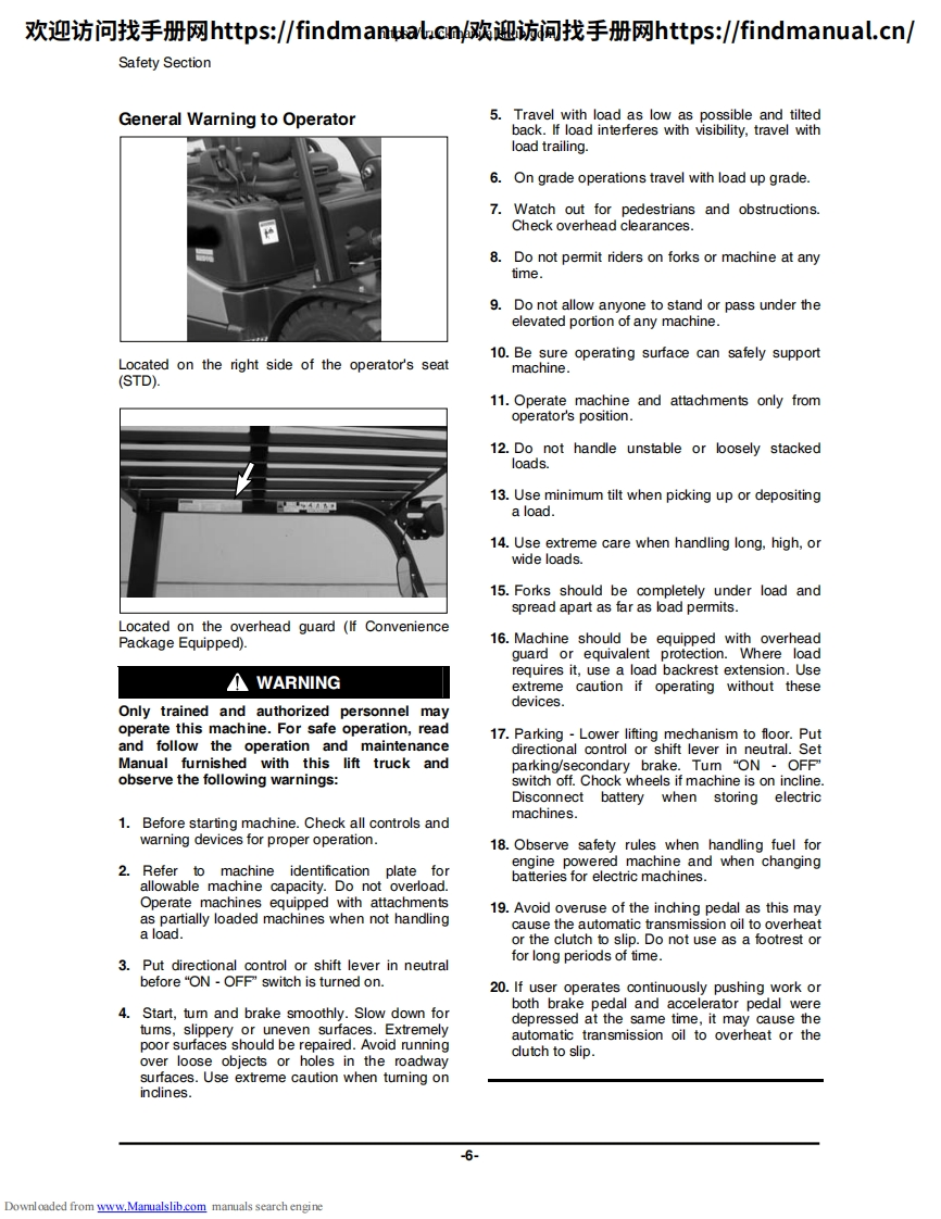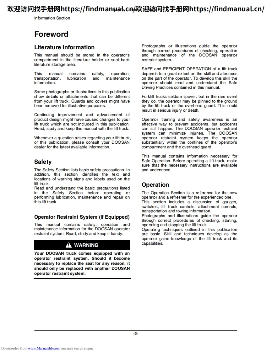 欢迎访问找手册网https:/findmanual.cn欢迎访间找手册网https:/findmanual..cn/SB2349E04OperationMaintenance ManualFORKLIFTSD20S-5,D25S-5,D30S-5,D33S5,D35C5G20E-5,G25E5,G30E-5GC20E-5,GC25E-5,GC30E-5,GC33E-5G20P.5,G25P5,G30P.5,G33P5,G35C5G20P-5 Plus,G25P-5 Plus,G30P-5 Plus,G33P-5 Plus,G35C-5 PlusGC20P-5,GC25P-5,GC30P-5,GC33P-5Original Instruction1105Downloaded from www.Manualslib.com manuals search engine