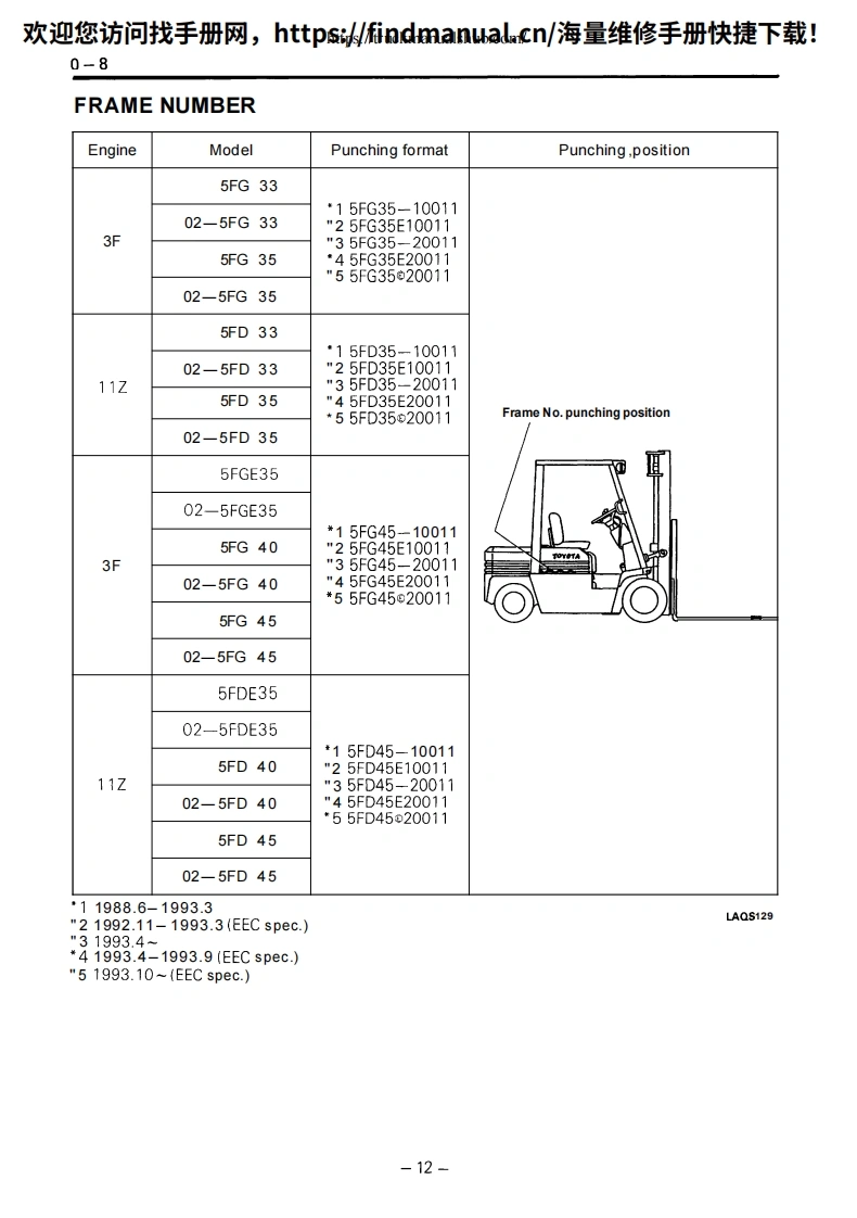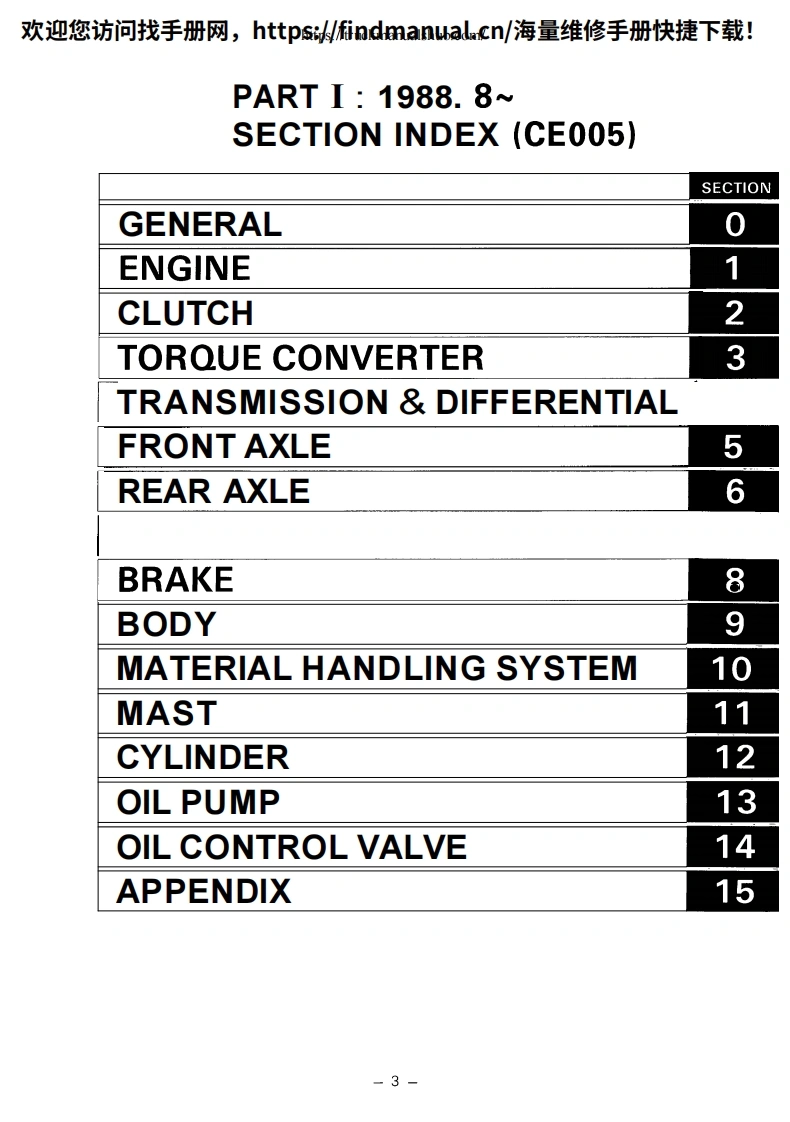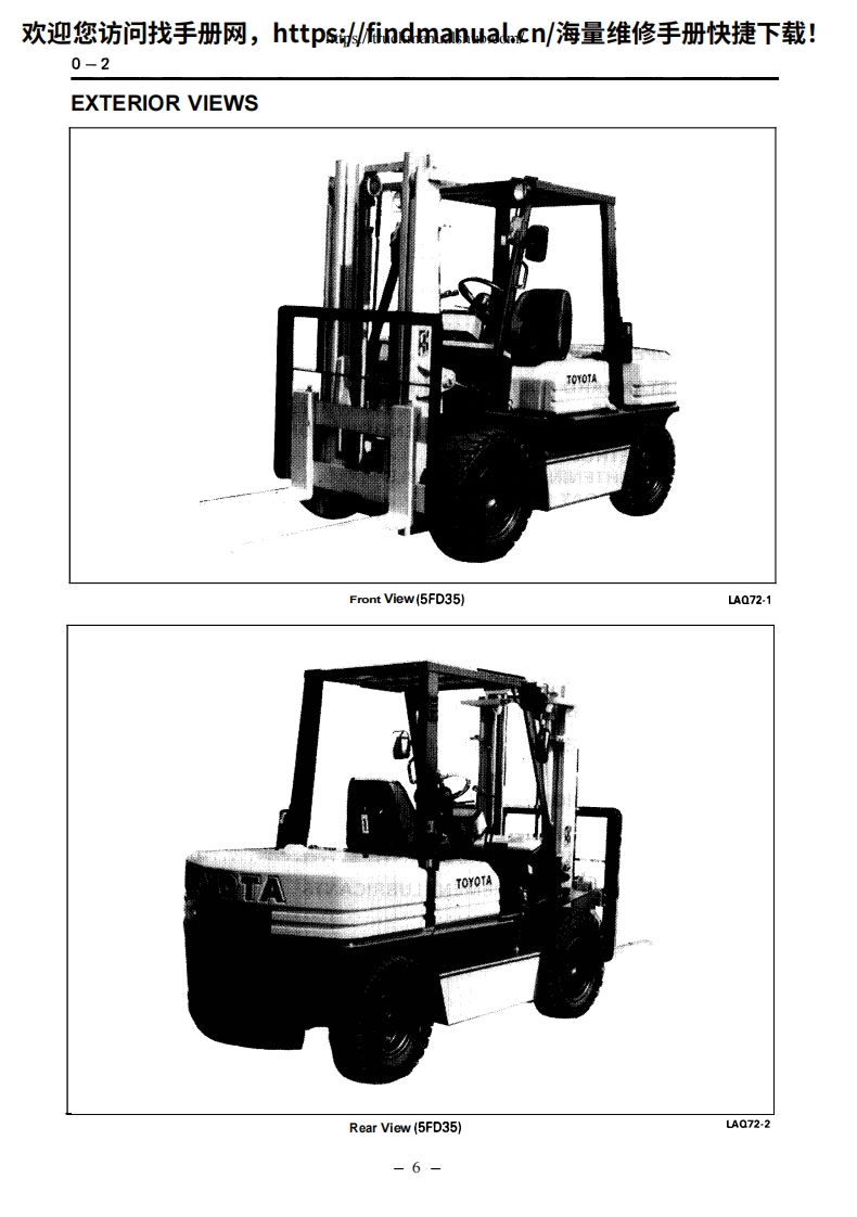 欢迎您访问找手册网,https://findmanual.cn/海量维修手册快捷下载!FOREWORDThis manual covers the service procedures of the TOYOTA FORKLIFT5FG/5FD33 ~45 series.Please use this manual for providing quick,correctservicing of the corresponding forklift models.This manual has been edited by combining Repair Manual Pub.No.CE005as Part I (Sections 0 to 15)and Repair Manual (Supplement)Pub.No.CE014.as Part 11(Sections 0 to 4).Part I explains the service procedures for the models produced sinceAugust,1988 while Part II covers those for the models subject to the minorchange in September,1994.For servicing the vehicles after the minorchange,please refer to both Part I and Part_Please understand that disagreement can take place between the de-scriptions in the manual and actual vehicles due to change in designand specifications.Any change or modifications thereafter will be in-formed by Toyota Industrial Equipment Parts Service News.For the service procedures of the mounted engine,read the repair man-uals listed below as reference together with this manual.(Reference)Repair manuals related to this manual are as follows:TOYOTA INDUSTRIAL EQUIPMENT 3F ENGINEREPAIR MANUAL (No.CE614)TOYOTA INDUSTRIAL EQUIPMENT 1FZ ENGINEREPAIR MANUAL (No.CE627)TOYOTA INDUSTRIAL EQUIPMENT 11Z,12Z ENGINEREPAIR MANUAL (No.CE615-1)TOYOTA MOTOR CORPORATION