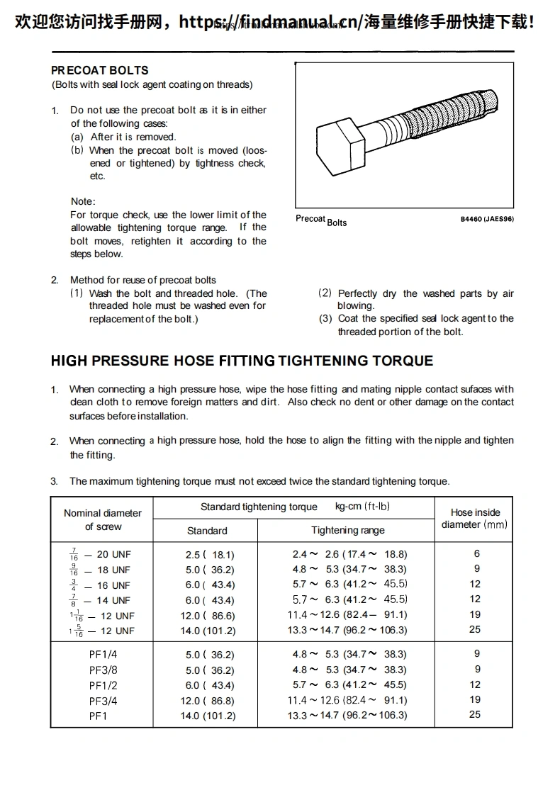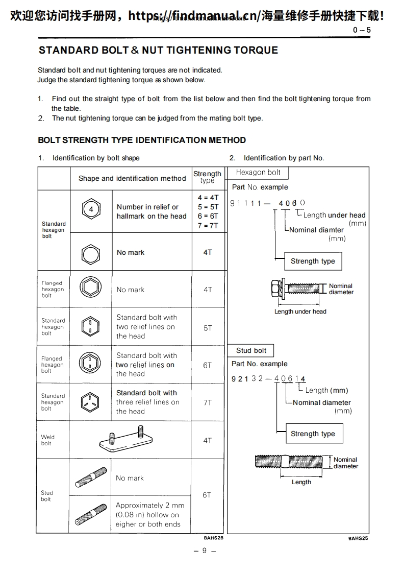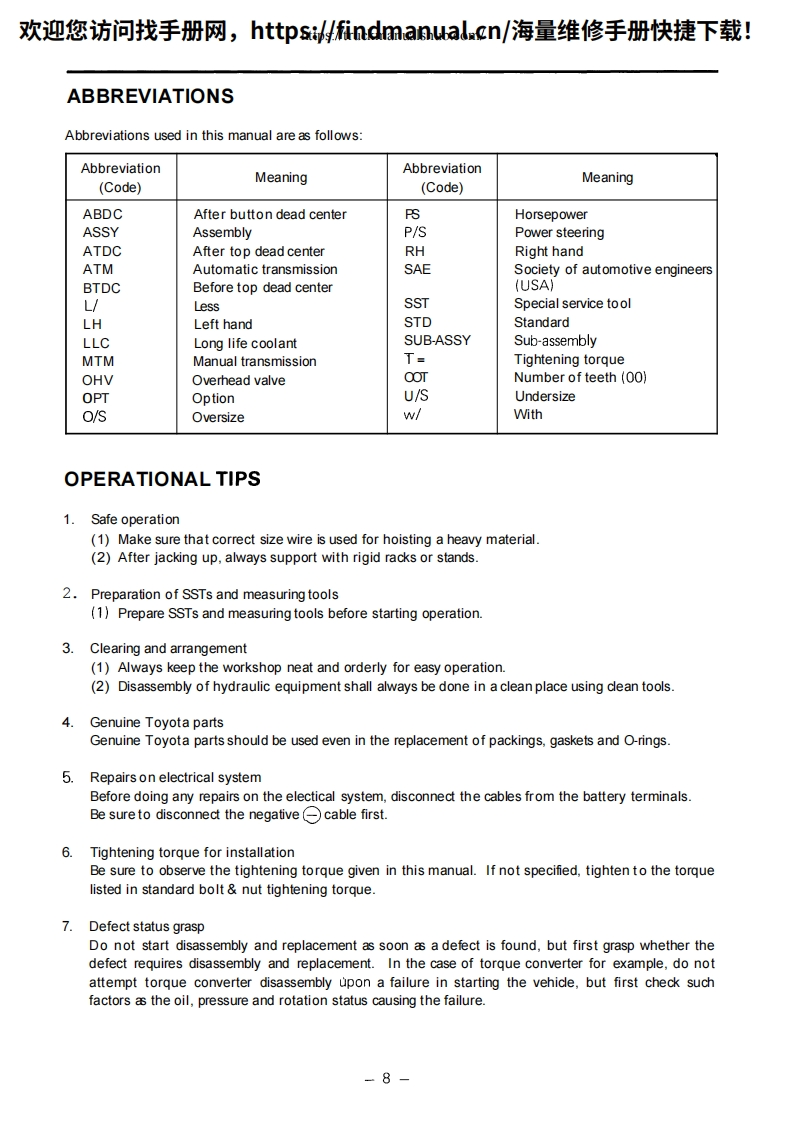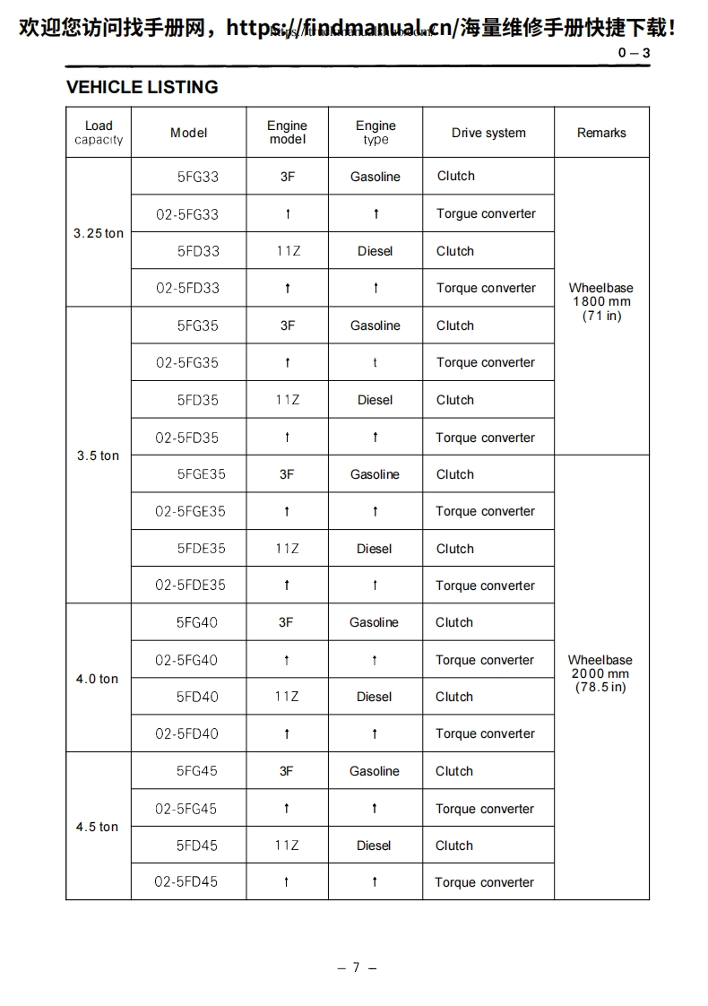 欢迎您访问找手册网,https://findmanual.cn/海量维修手册快捷下载!FOREWORDThis manual covers the service procedures of the TOYOTA FORKLIFT5FG/5FD33 ~45 series.Please use this manual for providing quick,correctservicing of the corresponding forklift models.This manual has been edited by combining Repair Manual Pub.No.CE005as Part I (Sections 0 to 15)and Repair Manual (Supplement)Pub.No.CE014.as Part 11(Sections 0 to 4).Part I explains the service procedures for the models produced sinceAugust,1988 while Part II covers those for the models subject to the minorchange in September,1994.For servicing the vehicles after the minorchange,please refer to both Part I and Part_Please understand that disagreement can take place between the de-scriptions in the manual and actual vehicles due to change in designand specifications.Any change or modifications thereafter will be in-formed by Toyota Industrial Equipment Parts Service News.For the service procedures of the mounted engine,read the repair man-uals listed below as reference together with this manual.(Reference)Repair manuals related to this manual are as follows:TOYOTA INDUSTRIAL EQUIPMENT 3F ENGINEREPAIR MANUAL (No.CE614)TOYOTA INDUSTRIAL EQUIPMENT 1FZ ENGINEREPAIR MANUAL (No.CE627)TOYOTA INDUSTRIAL EQUIPMENT 11Z,12Z ENGINEREPAIR MANUAL (No.CE615-1)TOYOTA MOTOR CORPORATION