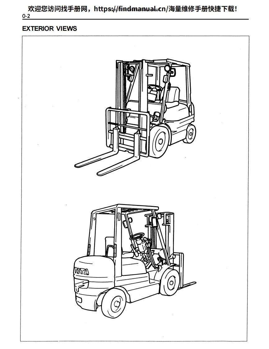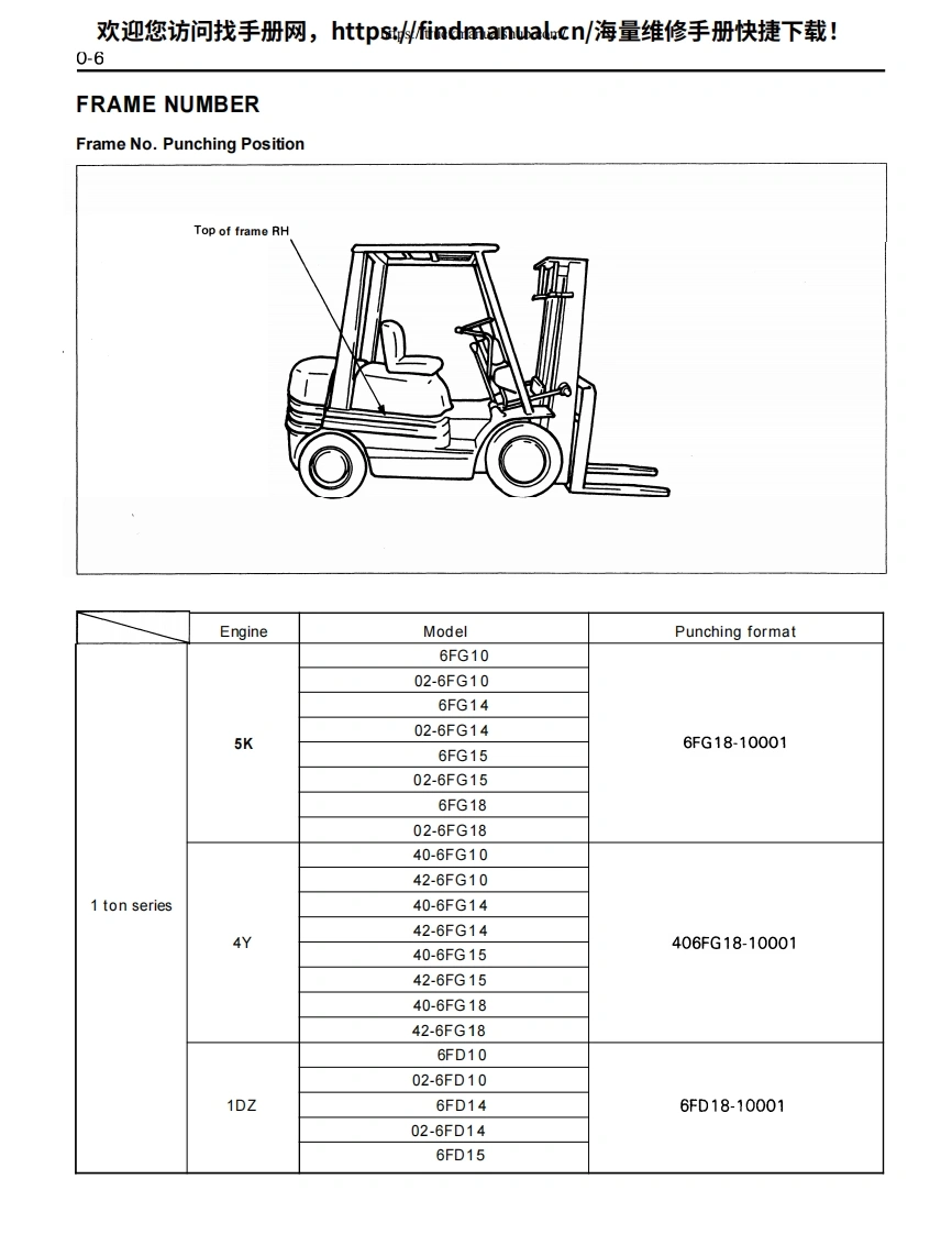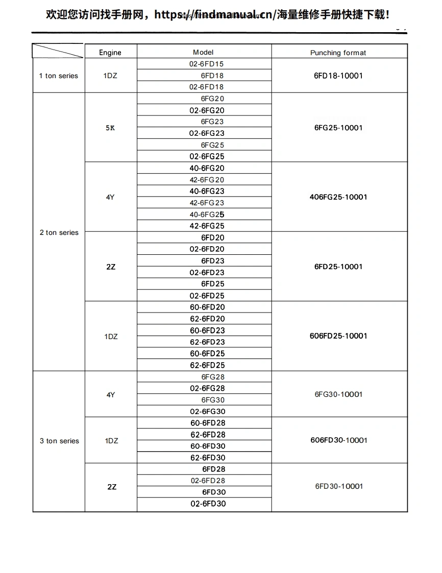 欢迎您访问找手册网,https4 findmanualcn/海量维修手册快捷下载!FOREWORDThis manual covers the service procedures of the TOYOTA FORKLIFT6FG/6FD10-30.Please use this manual for providing quick,correct ser-vicing of the corresponding forklift models.This manual deals with the above models as of January 1994.Pleaseunderstand that disagreement can take place between the descriptionsin the manual and actual vehicles due to change in design and specifica-tions.Any change or modifications thereafter will be informed byToyota Industrial Equipment Parts Service News.For the service procedures of the mounted engine,read the repair manu-als listed below as reference together with this manual.(Reference)Repair manuals related to this manual are as follows:TOYOTA INDUSTRIAL EQUIPMENT 5K ENGINEREPAIR MANUAL (No.CE617)TOYOTA INDUSTRIAL EQUIPMENT 4Y ENGINEREPAIR MANUAL (No.CE602)TOYOTA INDUSTRIAL EQUIPMENT 1DZ ENGINEREPAIR MANUAL (No.CE618)TOYOTA INDUSTRIAL EQUIPMENT 2Z ENGINEREPAIR MANUAL (No.CE625)TOYOTA MOTOR CORPORATION