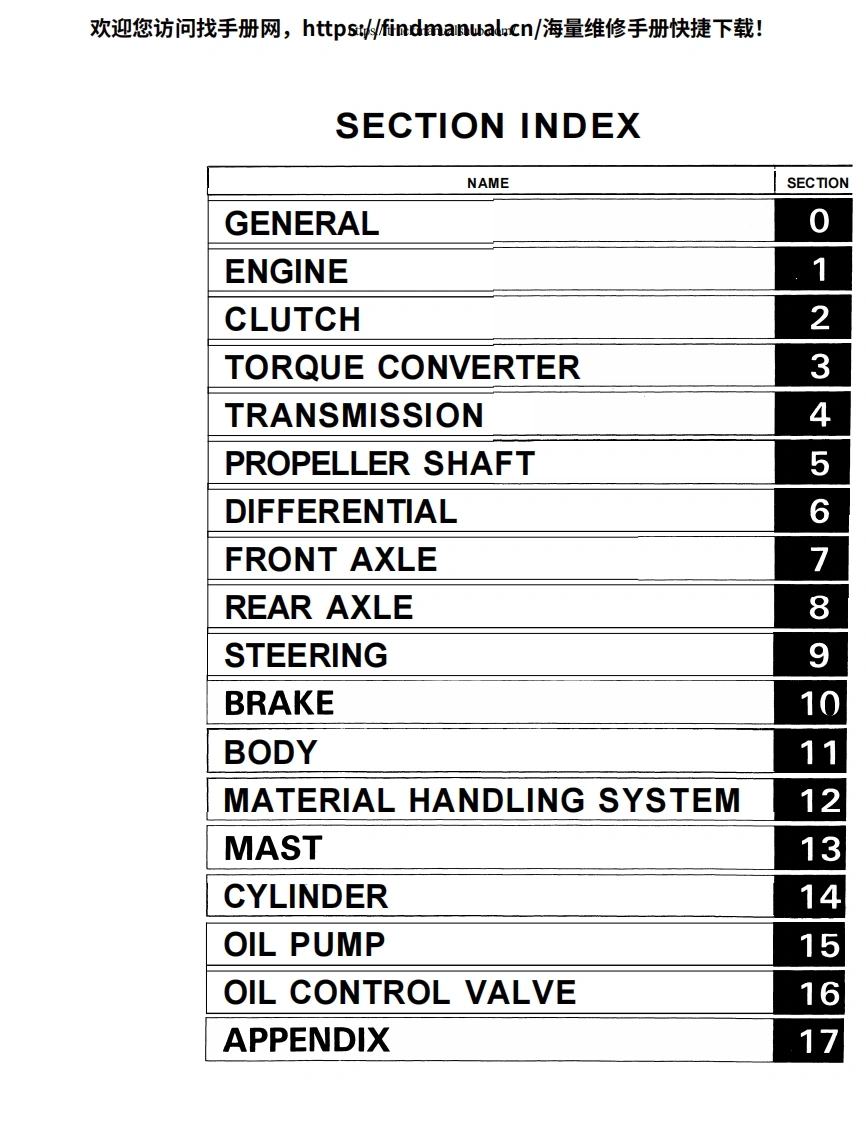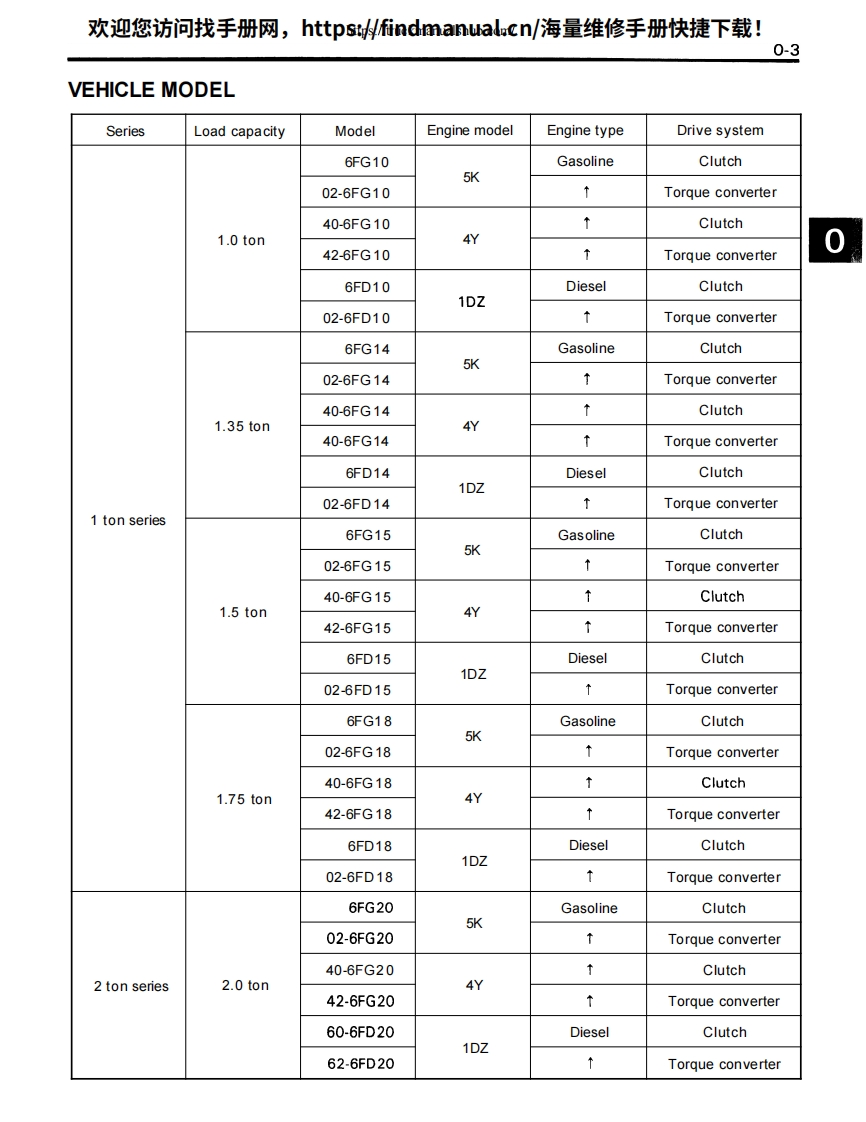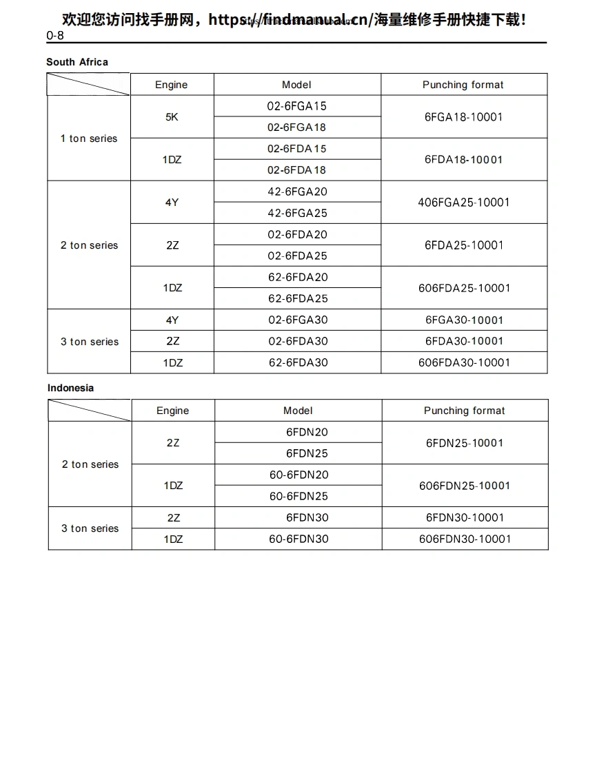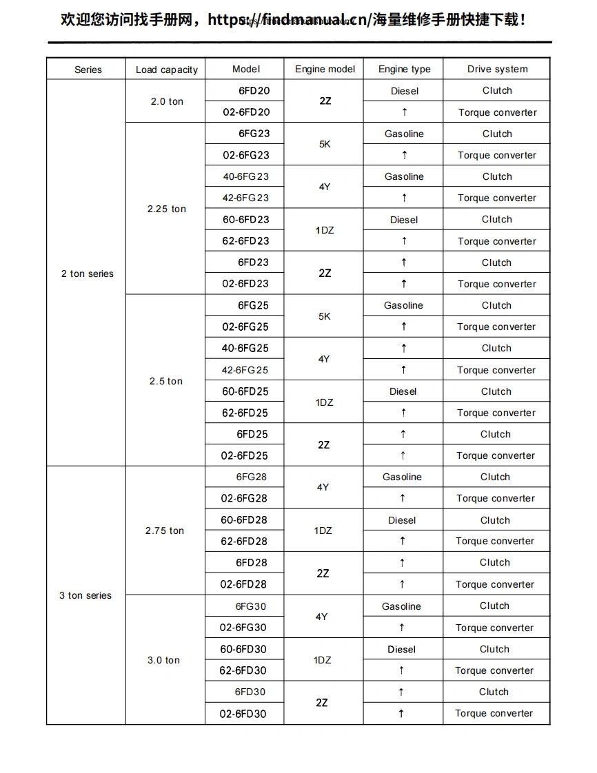 欢迎您访问找手册网,https4 findmanualcn/海量维修手册快捷下载!FOREWORDThis manual covers the service procedures of the TOYOTA FORKLIFT6FG/6FD10-30.Please use this manual for providing quick,correct ser-vicing of the corresponding forklift models.This manual deals with the above models as of January 1994.Pleaseunderstand that disagreement can take place between the descriptionsin the manual and actual vehicles due to change in design and specifica-tions.Any change or modifications thereafter will be informed byToyota Industrial Equipment Parts Service News.For the service procedures of the mounted engine,read the repair manu-als listed below as reference together with this manual.(Reference)Repair manuals related to this manual are as follows:TOYOTA INDUSTRIAL EQUIPMENT 5K ENGINEREPAIR MANUAL (No.CE617)TOYOTA INDUSTRIAL EQUIPMENT 4Y ENGINEREPAIR MANUAL (No.CE602)TOYOTA INDUSTRIAL EQUIPMENT 1DZ ENGINEREPAIR MANUAL (No.CE618)TOYOTA INDUSTRIAL EQUIPMENT 2Z ENGINEREPAIR MANUAL (No.CE625)TOYOTA MOTOR CORPORATION