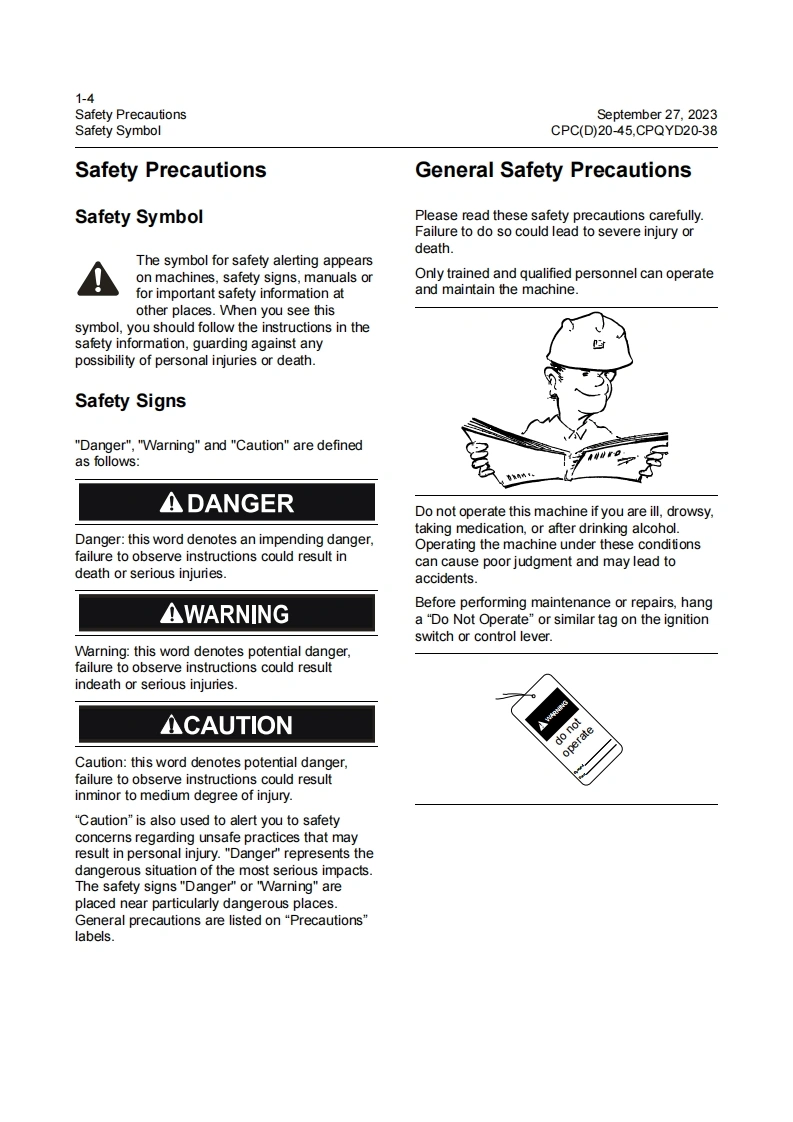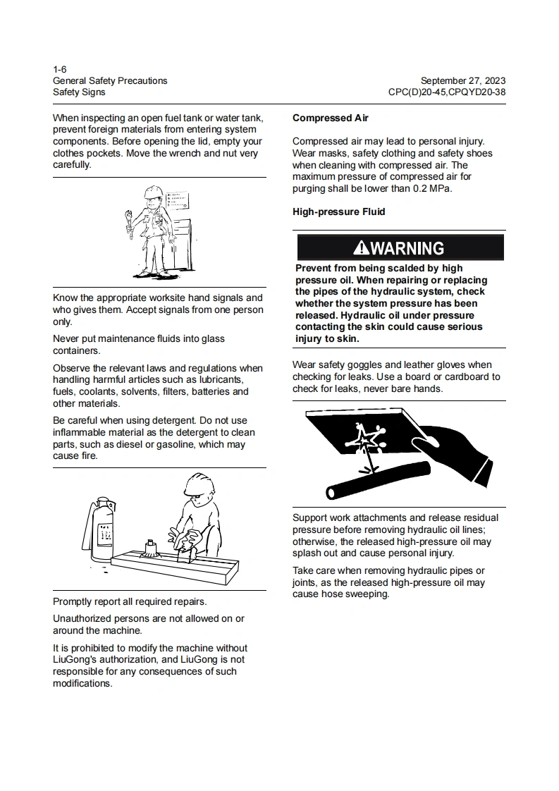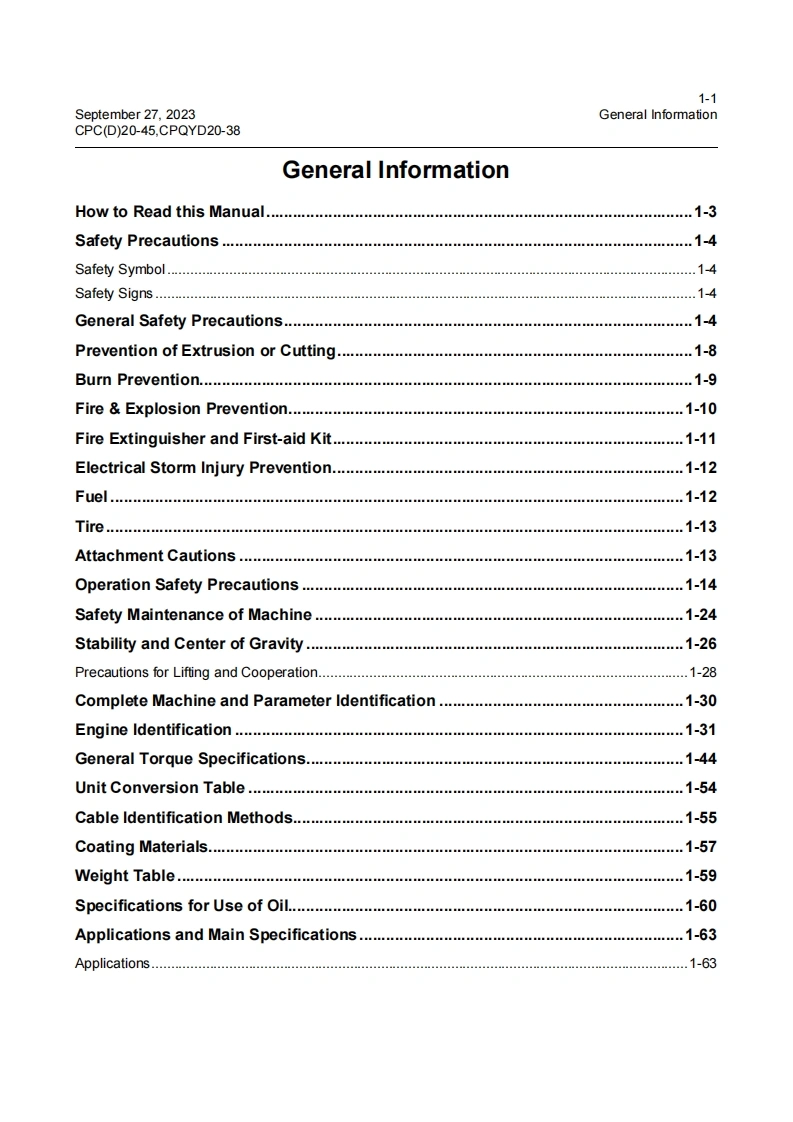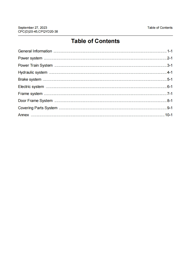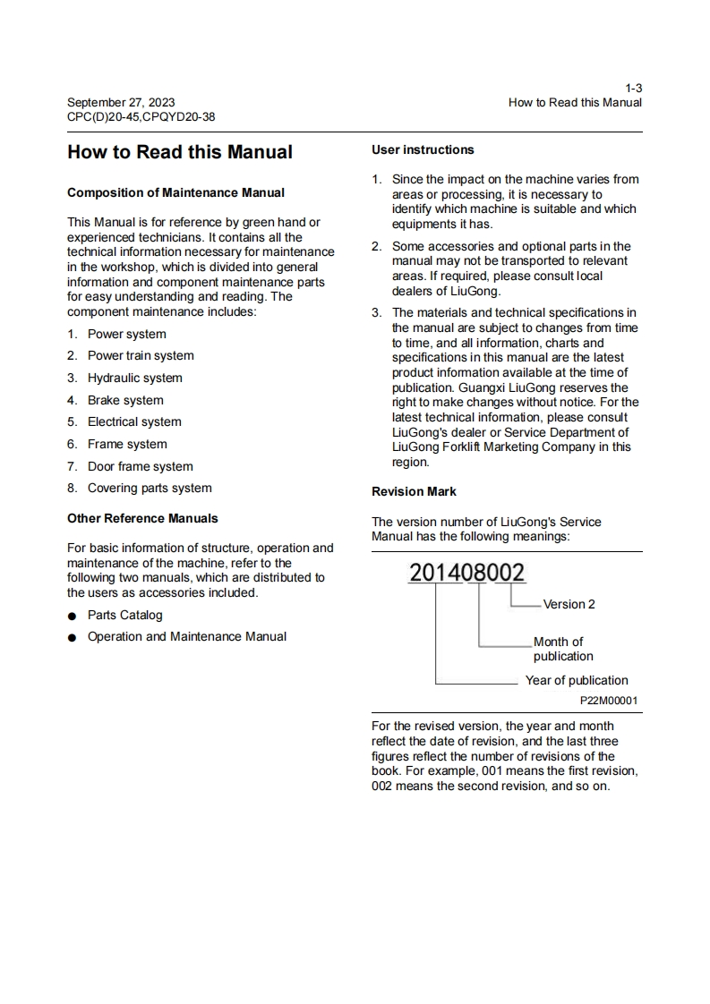 柳工CPCD20-45CPQYD20-38-Service-Manual-EN-202309000操作与维修维护手册含电器液压原理图找手册网3小时前发布关注私信20.62MB496页032柳工CPCD20-45CPQYD20-38-Service-Manual-EN-202309000操作与维修维护手册含电器液压原理图此内容为付费资源,请付费后查看¥39¥49黄金会员免费钻石会员免费登录购买付费资源 第1页 / 共496页 第2页 / 共496页 第3页 / 共496页 第4页 / 共496页 第5页 / 共496页 第6页 / 共496页 第7页 / 共496页 第8页 / 共496页 第9页 / 共496页 第10页 / 共496页 试读已结束,还剩486页,您可下载完整版后进行离线阅读 THE END柳工/临工/龙工/台励福/常林/成工 文本预览 SLIUGONG朽印工202309000CPC(D)20-45,CPQYD20-38E Series Internal CombustionCounterbalance ForkliftService ManualApplicable Model:CPC(D)2.0t-4.5t,CPQYD 2.0t-3.8t 查看更多 收起部分 喜欢就支持一下吧收藏