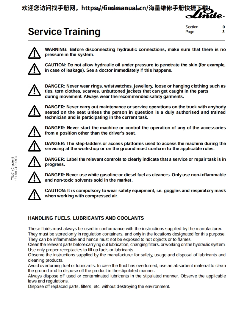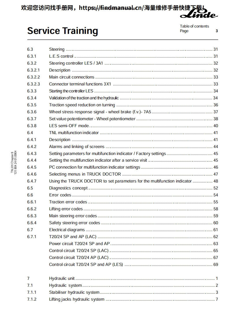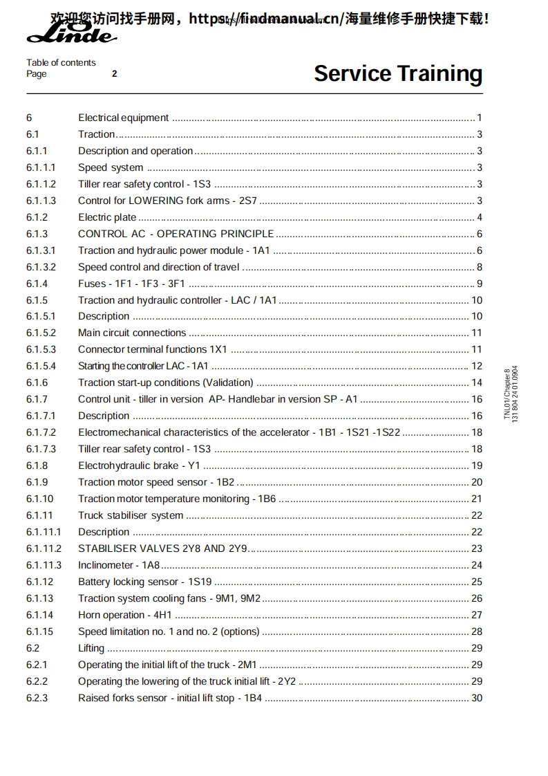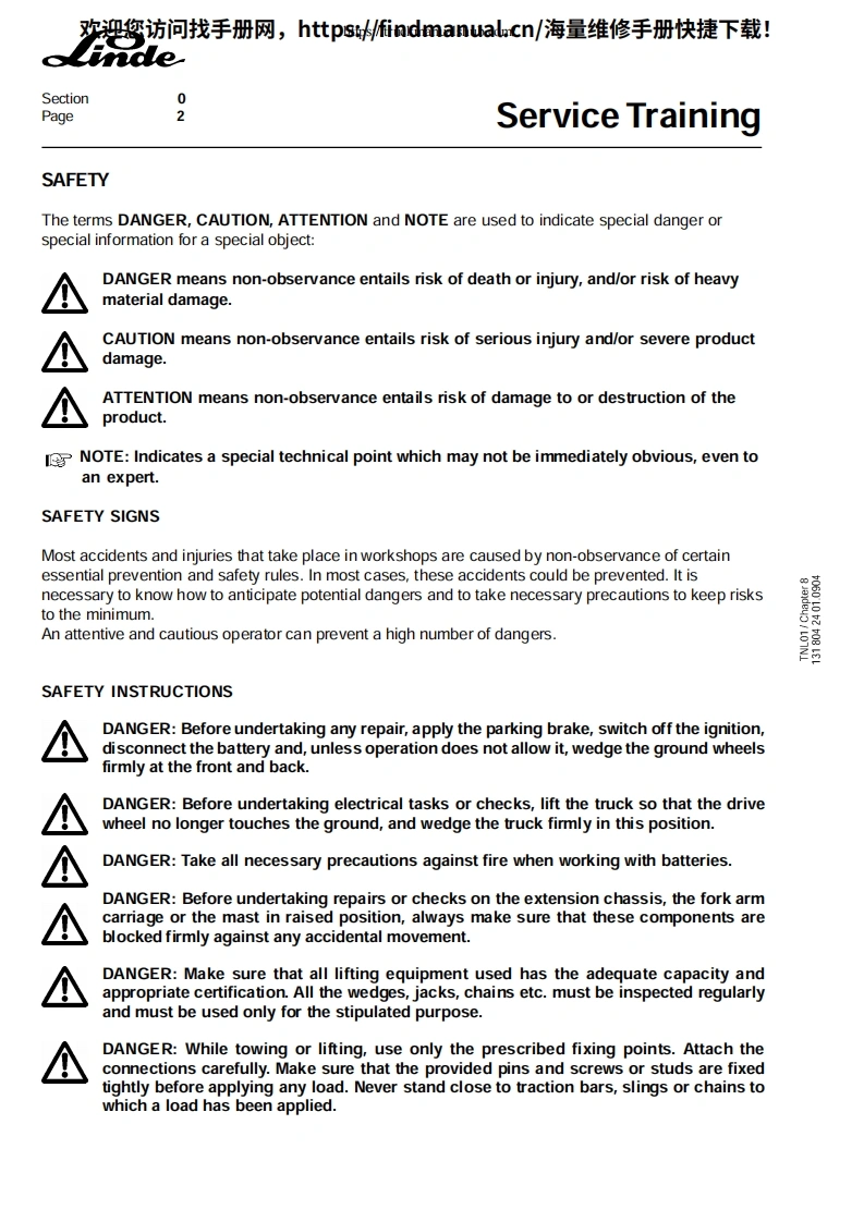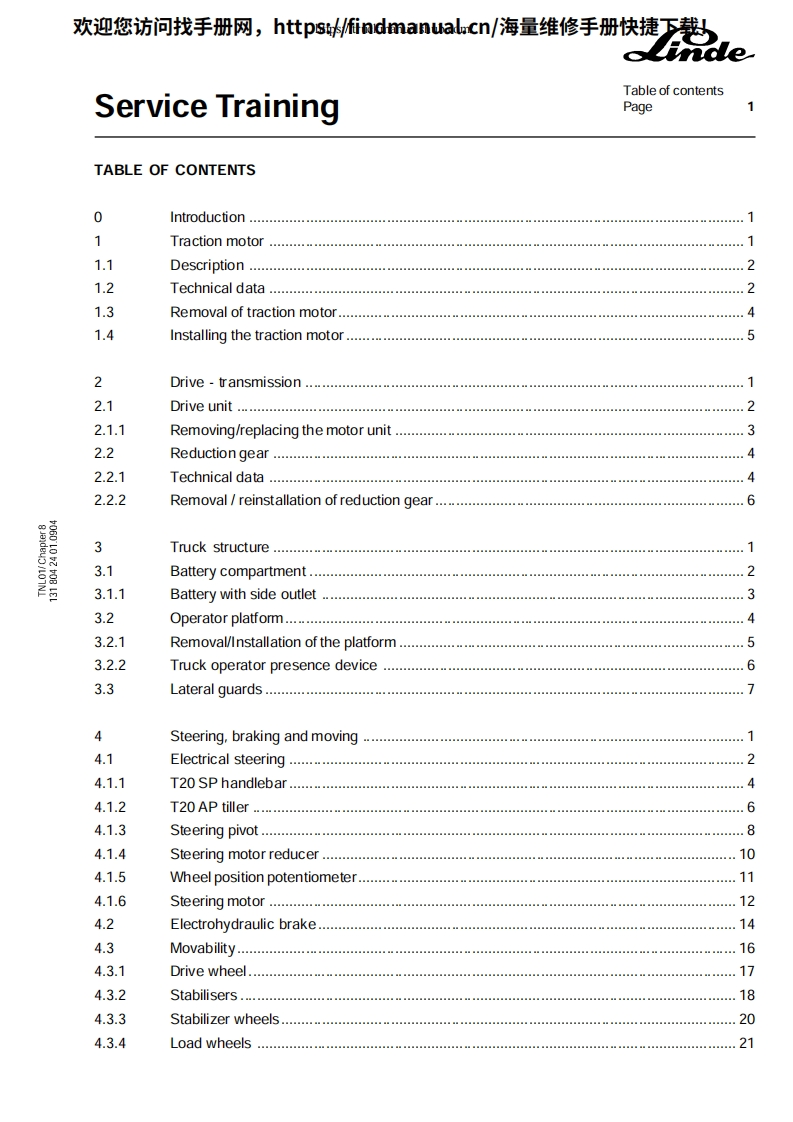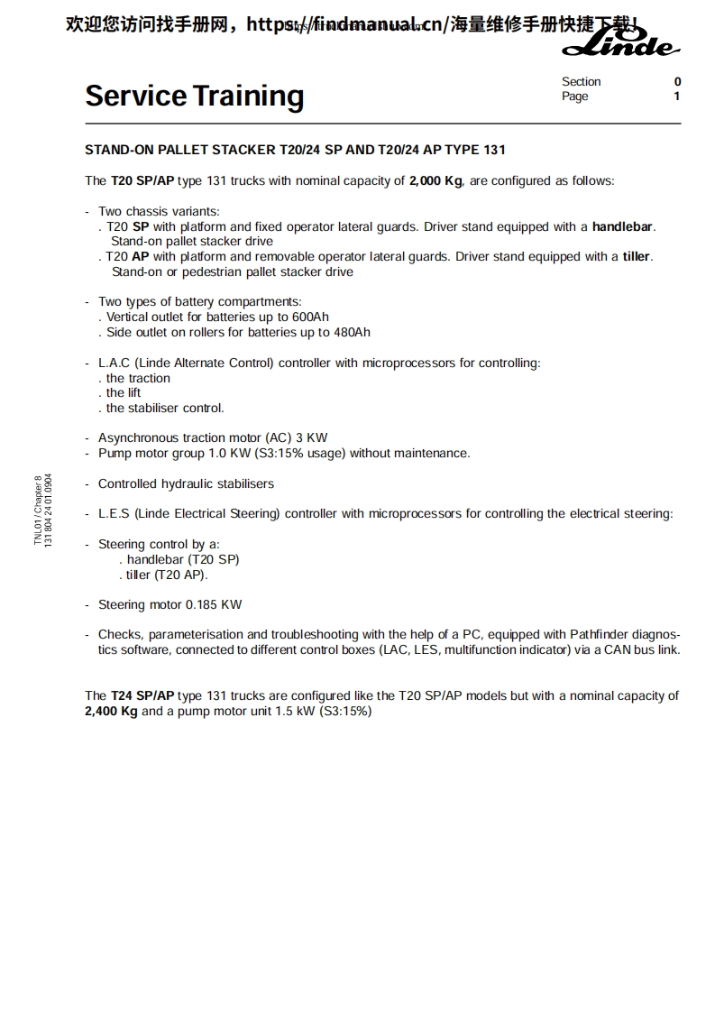 欢迎您访问找手册网,https://findmanual.cn/海量维修手册快捷下载!Service TrainingeStand-on pallet stacker:T20/24 SP-T20/24 AP type 131SP506110525091tT20 APThis maintenance /service manual is intended for"LINDE system technicians to guide them in the ir work.It remains the property of the company:FENWICK-LINDE.1,rueduMde Lattre de Tassigny-78854 Elancourt Cedex-Saint-Quentin en Yvelines
