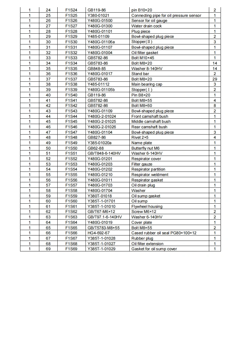 61513130.叫69Fig.1 Engine Body Assy(Y385)Fig.NO.Ser No.Fig./Ser.No.Part No.Name of PartQty.11F1S1Y485-01005Cvlinder head bolt82F1S2Y480G-01006Cylinder head bolt washer813F1S3Y385-01002Cylinder head gasket114F1S4Y485-01003Cylinder sleeve315F1S5GB5783-86Bolt M8×25616F1S6GB848-85Washer 8-140HV4917F1S7Y380-01013Side cover(II)118F1S8Y380-01014Side cover(II)gasket119F1S9Y480G-01012Side cover(I1110F1S10Y480G-01023Side cover(I gasket111F1S11Y385-01111Engine body112F1S12Y380T-01009Flywheel housing gasket113F1S13Y480G-01100Locating sleeve2114F1S14Y480G-01103Bowl-shaped plug piece3115F1S15Y380T-01600Dipstick sleeve weldment1116F1S16Y385T-1-01400Oil level dipstick117F1S17Y485-01015Main bearing halfshell(upper)4118F1S18Y485-01016Main bearing halfshell(lower)4119F1S19Y485-01007Upper thrust piece of crankshaft2120F1S20Y485-01008Lower thrust piece of crankshaft2121F1S21Y485-01113Rear main bearing cap122F1S22Y480G-01114Main bearing boit washer8123F1S23Y480G-01115Main bearing cap bolt8
