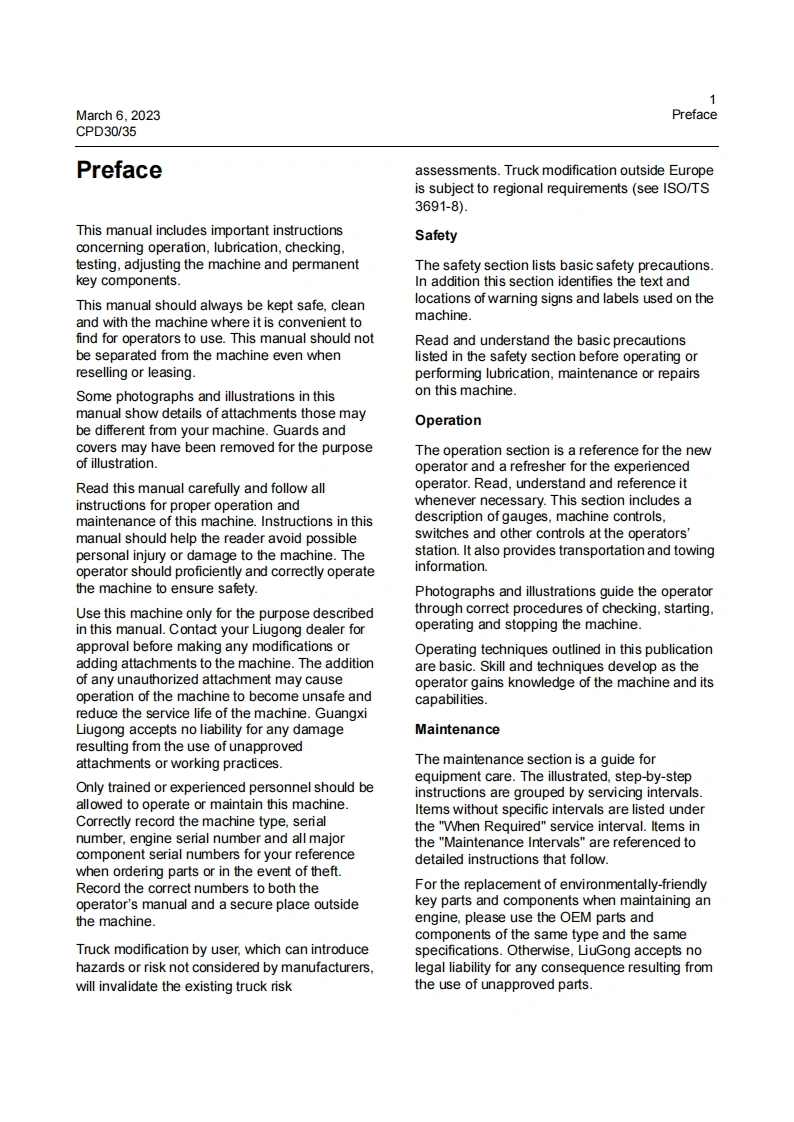 柳工CPD型3.0-3.5tE系列蓄电池叉车使用维护说明书-EN-202303000找手册网3小时前发布关注私信7.82MB140页045柳工CPD型3.0-3.5tE系列蓄电池叉车使用维护说明书-EN-202303000此内容为付费资源,请付费后查看¥39¥49黄金会员免费钻石会员免费登录购买付费资源 第1页 / 共140页 第2页 / 共140页 第3页 / 共140页 第4页 / 共140页 第5页 / 共140页 第6页 / 共140页 第7页 / 共140页 第8页 / 共140页 第9页 / 共140页 第10页 / 共140页 试读已结束,还剩130页,您可下载完整版后进行离线阅读 THE END柳工/临工/龙工/台励福/常林/成工 文本预览 GLIUGONG印工202303000CPD30/35BATTERY FORKLIFT TRUCKE SERIES(英文)OPERATION ANDMAINTENANCE MANUAL 查看更多 收起部分 喜欢就支持一下吧收藏