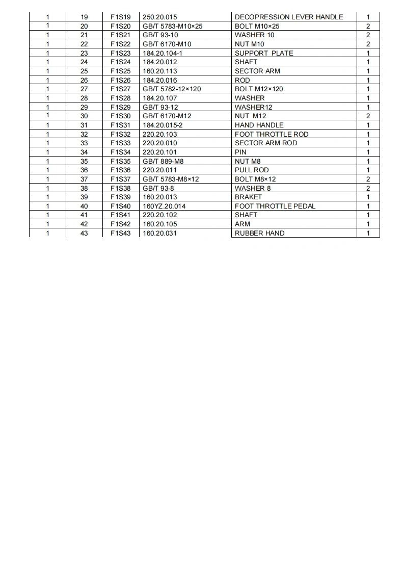 1551000015212241854184035232443362742263132、18Fig.1 Engine Control Mechanism IIIFIGSERFIG/SER.PARTPARTQTY.NO.NO.NO.NO.NAME71F1S1GB/T882-B5×20AXIS PIN B5×20612F1S2160.20.101YOKE513F1S3GBT97.1-5WASHER 5514F1S4GBT91-2×16PIN2×161275F1S5GB/T6170-M6NUT M646F1S6250.20.112SHUT DOWN PULL ROD117F1S7250.20.011-1ROD118F1S8160.20.102LEFT ARM119F1S9GBT879-3×20PIN3×203110F1S10160.20.030KNOB(M5)1111F1S11GBT6170-M5NUT M51112F1S12184.20.117-1DECOMPRESSION HANDLE1113F1S13180.20.010SUPPORT SEAT114F1S14GB/T91-3.2×26PIN32×26115F1S15GBT97.1-10WASHER 103116F1S16GB/T5782-M6×35BOLT M6×351117F1S17180.20.118-1CLAMPING ARM118F1S18GB/T97.1-6WASHER 66