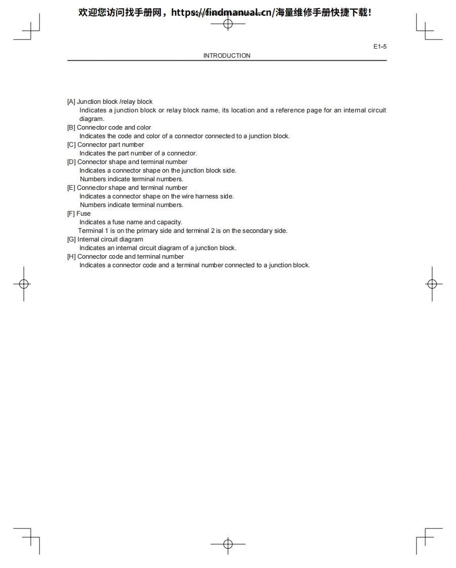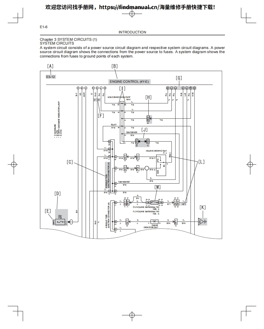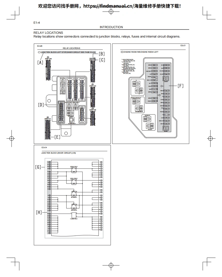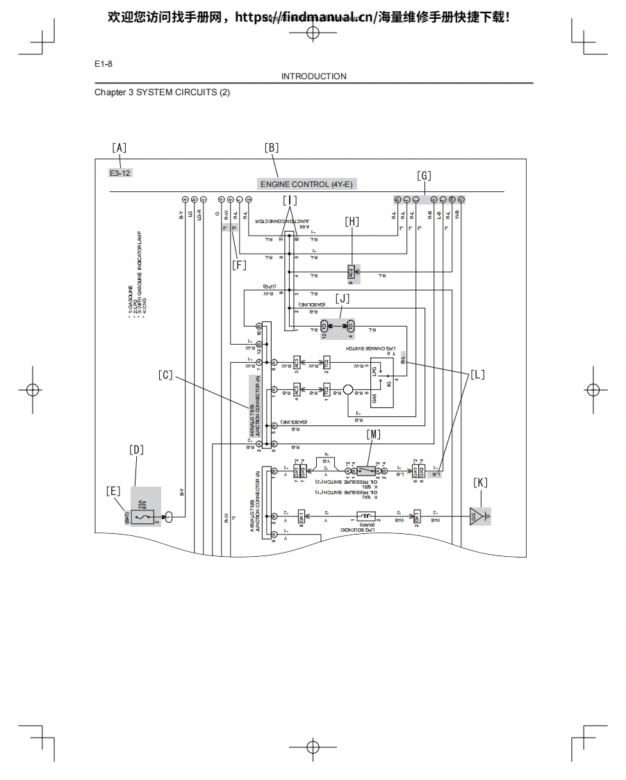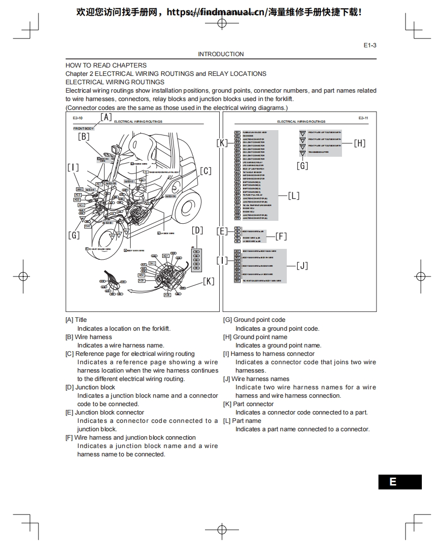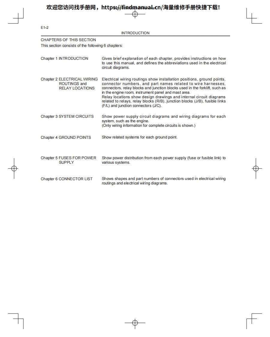 欢迎您访问找手册网,https://findmanual.cn/海量维修手册快捷下载!WIRING DIAGRAM8FG(D)U15-32,8FGCU20-32CHAPER 1 INTRODUCTIONE1CHAPTER 2 ELECTRICAL WIRING ROUTING AND RELAY LOCATIONE2CHAPTER 3 SYSTEM CIRCUITSE3CHAPTER 4 GROUND POINTSE4CHAPTER 5 FUSES FOR POWER SUPPLYE5CHAPTER 6 CONNECTOR LISTE68FGCU15,18,SU20CHAPTER 7 ELECTRICAL WIRING ROUTING AND RELAY LOCATIONE7CHAPTER 8 SYSTEM CIRCUITSE8CHAPTER 9 GROUND POINTSE9CHAPTER 10 FUSES FOR POWER SUPPLYE10CHAPTER 11 CONNECTOR LISTE11