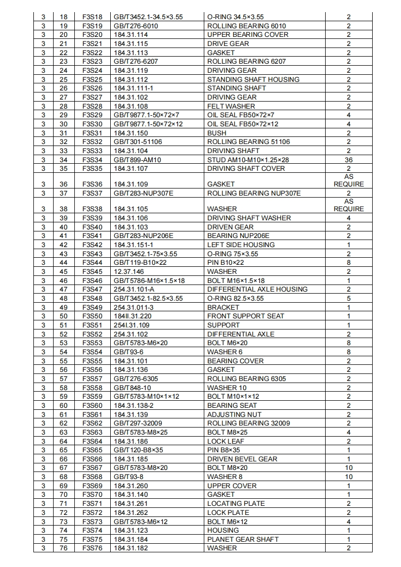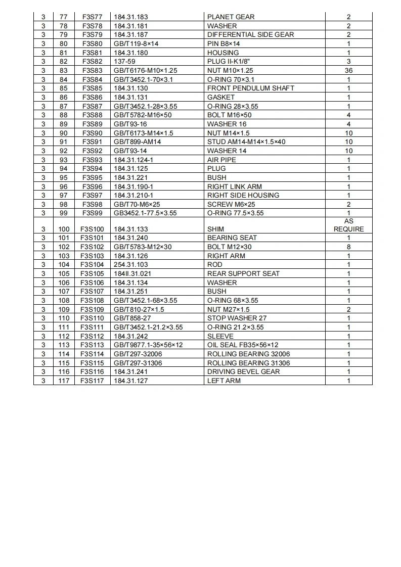 Fig.3-A Front Axle For Hydraulic SteeringFIGSER FIG/SERPARTPARTQTYNO.NONO.NO.NAMEFRONT AXLE*(SIDE3254.31.001CYLINDER )*25431F3S1184.31.024PULL ROD JOINT (LEFT)232F3S2GB/T6173-M16×1.5NUTM16×1.5(LEFT)33F3S3184.31.023PULL ROD JOINT(RIGHT)234F3S4GB/T617316×1.5NUTM16×1.5(LEFT)335F3S5254.31.108DRAG LINK136F3S6GB/T119-B8×20PINB8×2012AS37F3S7184.31.110GASKETREQUIRE38F3S8GBT93-10WASHER 107839F3S9GBT5783-M10×30BOLT M10×3038310*F3S10254YZ.31.160LEFT STEERING KNUCKLE ARM1311F3S11GB/T1152-M10×1GREASE M10×18312F3S12GBT5783-M10×25BOLT M10x2512313F3S13GBT93-12WASHER 128314F3S14GB/T6181-M12NUT M12315F3S15184.31.161BUSH2316F3S16184.31.117WASHER2AS317F3S17184.31.116ADJUSTING SHIMREQUIRE