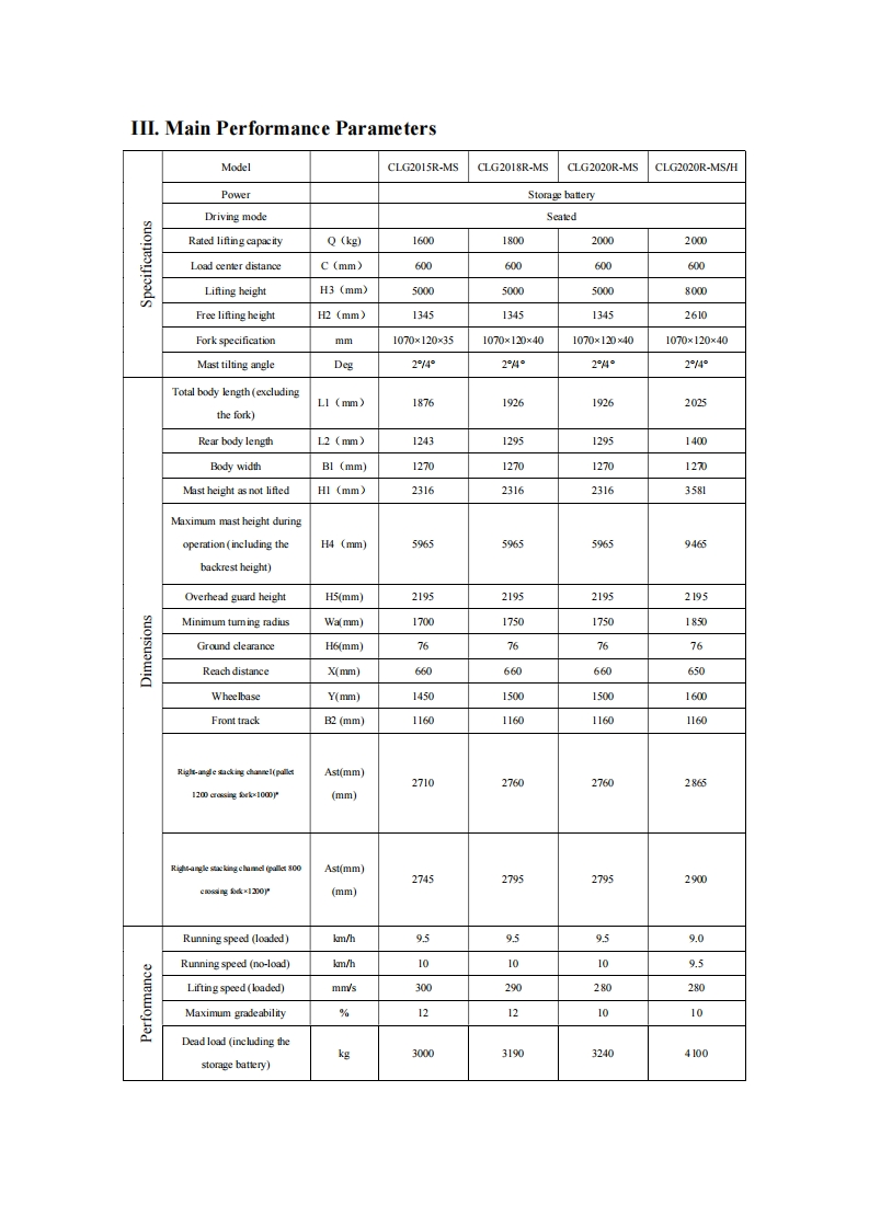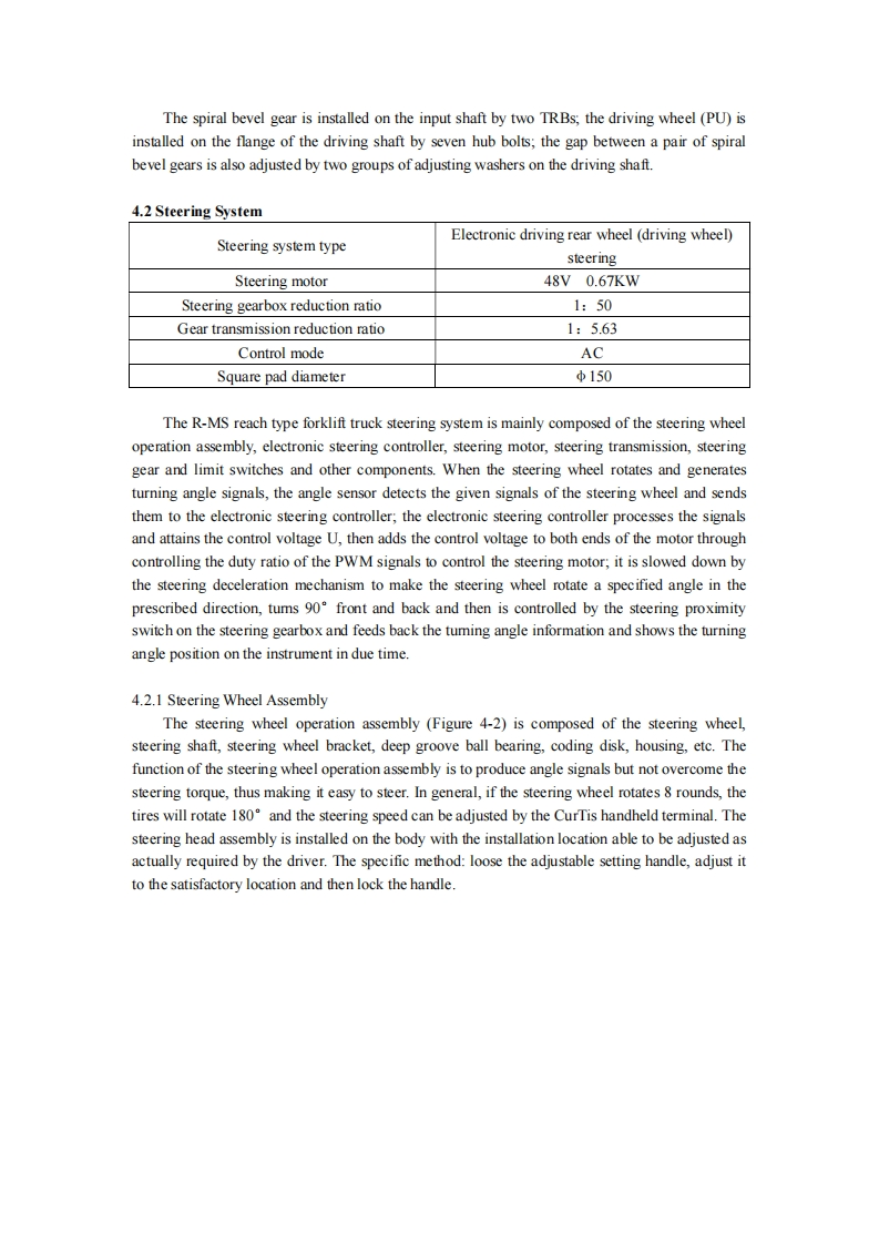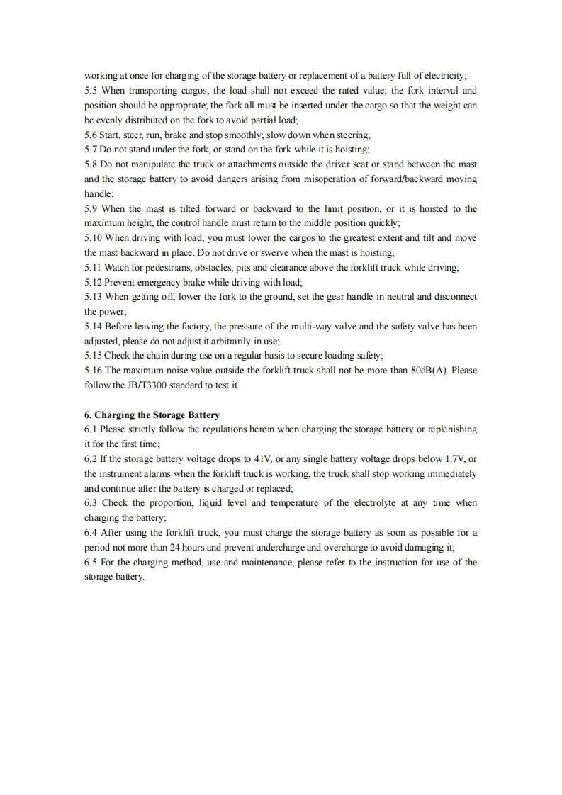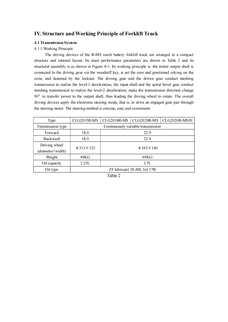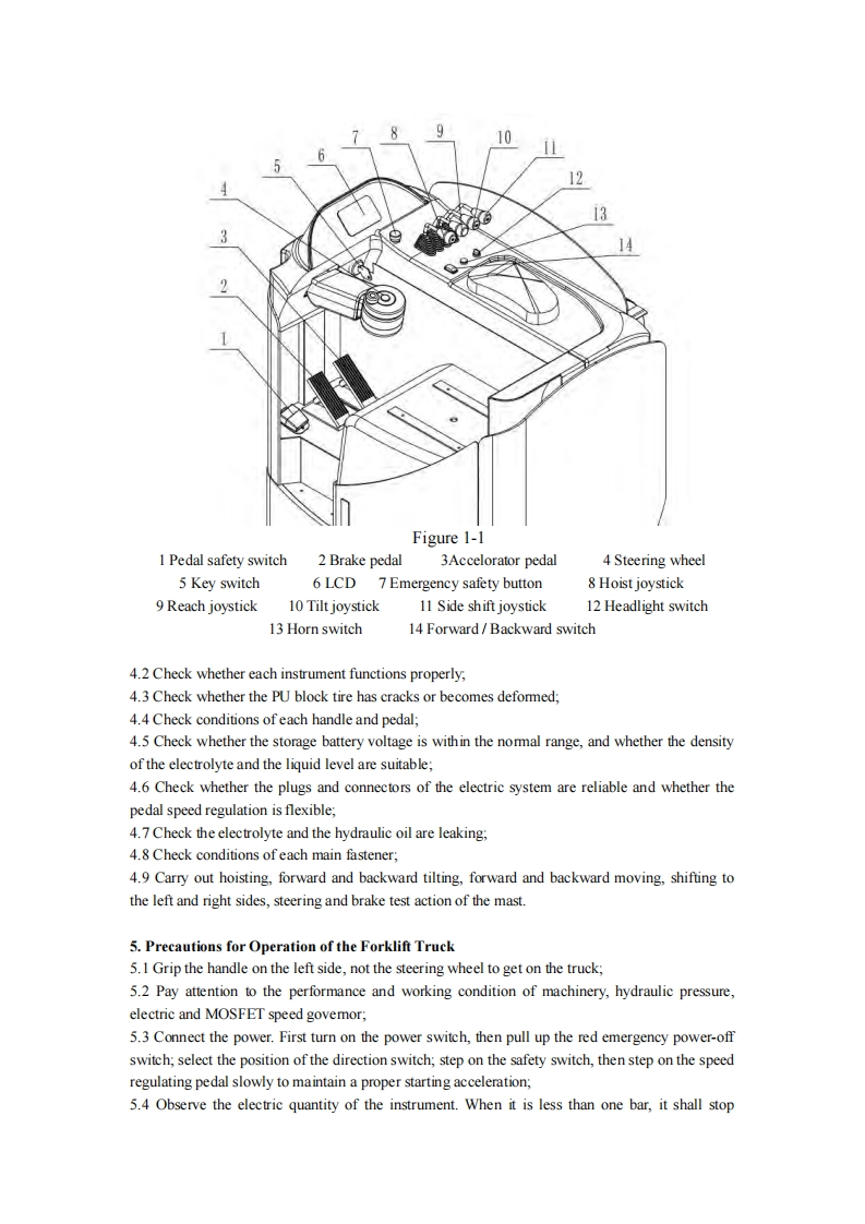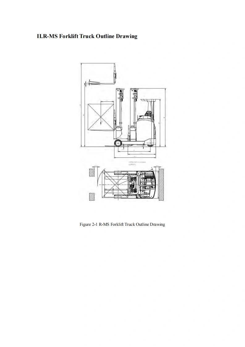I.Safety Standard for Driving and Operating of R-MS Type ReachBattery Forklift Truck1.The forklift truck driver and management personnel must remember "Safety First"and operatesafely in strict accordance with the forklift truck use and maintenance manual and driverhandbook.2.Transport of Forklift TruckPay attention to the following matters when transporting the forklift truck by a container or a car.2.1 Move the mast backward in place and tum off the power;2.2 Hoist as per the position marked on the forklift truck hoisting sign:do not hoist the mast or getoff directly from the loading platform:2.3 Fix the mast and the overhead guard by steel wire ropes during transport and wedge the frontand rear tires at the corresponding positions.3.Parking of Forklift Truck3.1 Lower the fork to the lowest ground level;3.2 Shut down the key switch and the red emergency power-off switch,set all the joysticks inneutral and pull out the main power plug;3.3 When the forklift truck is not used for a long time,please lift the tires off the ground andreplenish the storage battery once per month.4.Preparation before Use4.1 The driver must hold a driving license and must read the use and maintenance manual andrelevant accompanying documents carefully before using it,get familiar with the positions of theinstruments and the control mechanisms (Figure 1-1)and leam about the structure andperfommance of the forklift truck;