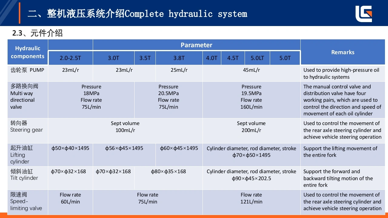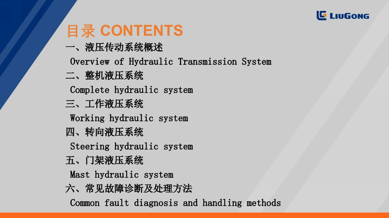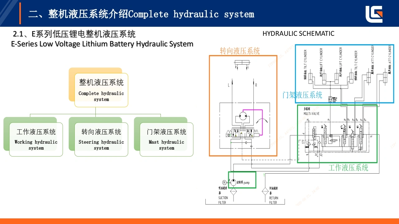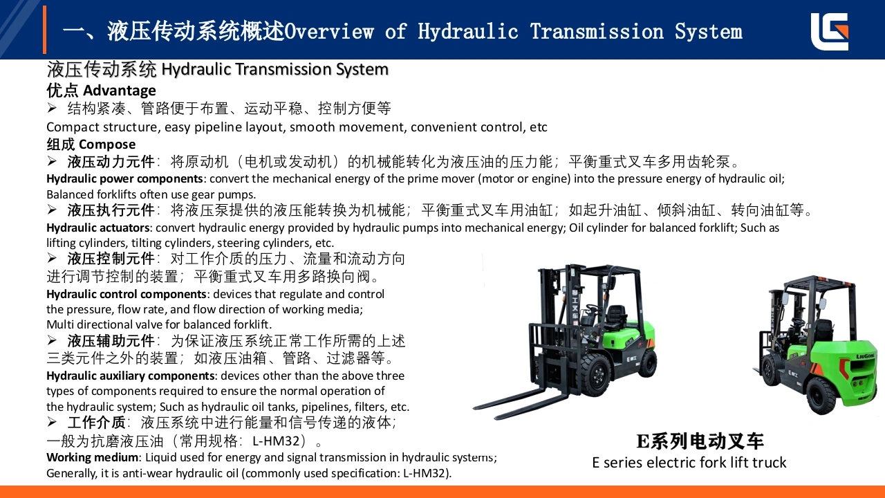 LIUGONG灯即工E系列低压锂电2-3.8T,4-5T平衡重式叉车液压系统培训TRAINING ON HYDRAULIC SYSTEM OF E-SERIES LOW-VOLTAGELITHIUM BATTERY 2-3.8T,4-5T COUNTERBALANCED FORKLIFT编制:戴婷Prepared by:Ting Dai单位:柳工叉车工业车辆研究院Unit:LiuGong forklift industrialvehicle research institute极限工况强悍设备TOUGH WORLD.TOUGH EQUIPMENT.