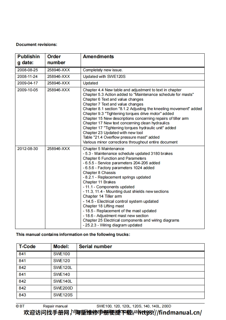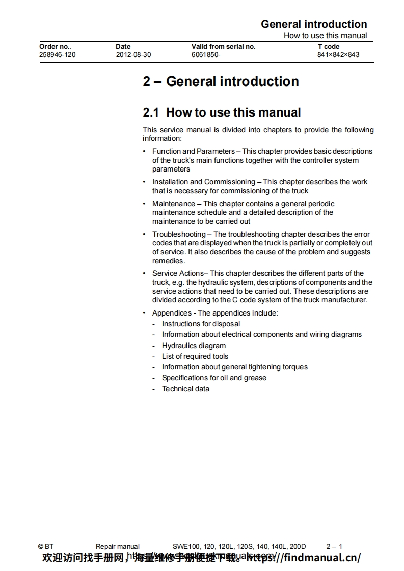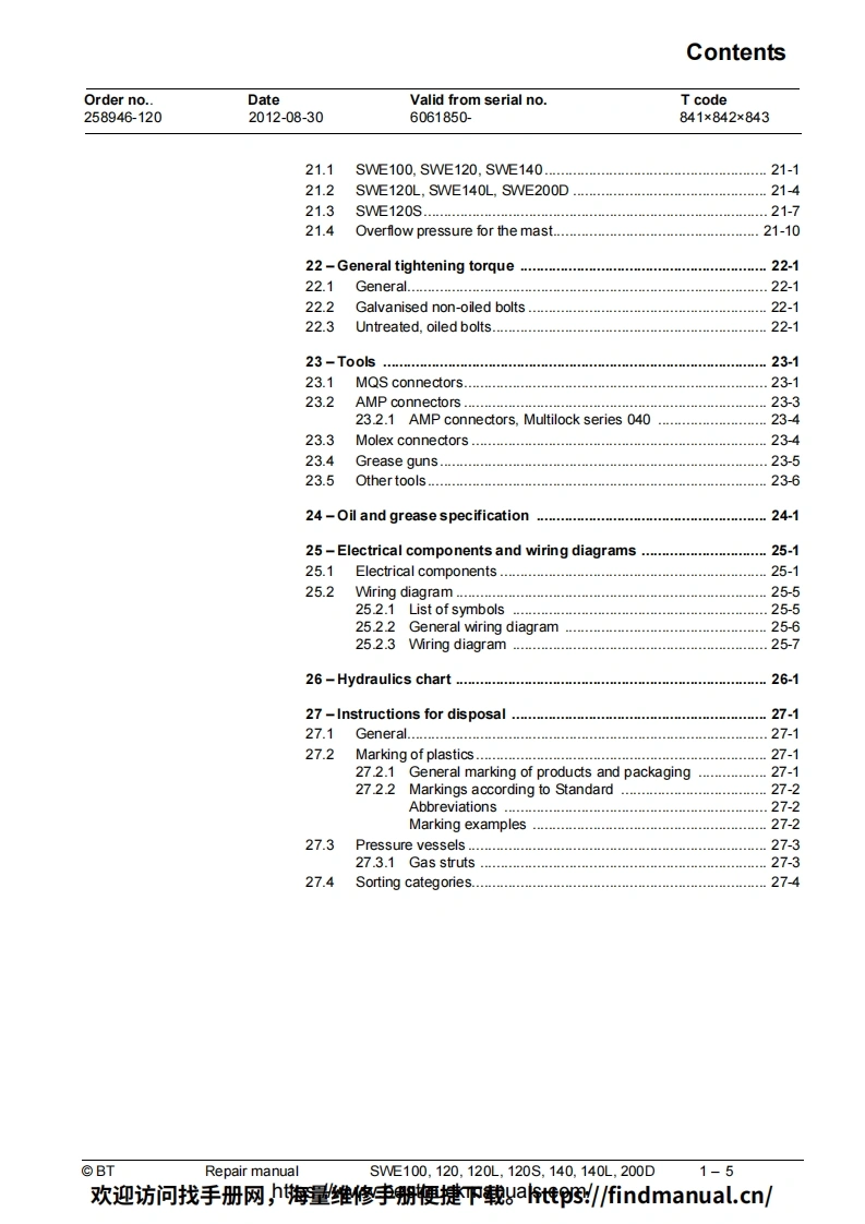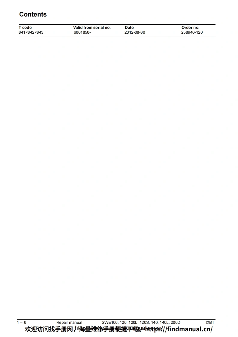BT-SWE100-200D-Lift-Truck-Repair-Manual-PDF叉车维修手册含电器液压原理图找手册网3天前发布关注私信6.95MB230页050BT-SWE100-200D-Lift-Truck-Repair-Manual-PDF叉车维修手册含电器液压原理图此内容为付费资源,请付费后查看¥39¥49黄金会员免费钻石会员免费登录购买付费资源 第1页 / 共230页 第2页 / 共230页 第3页 / 共230页 第4页 / 共230页 第5页 / 共230页 第6页 / 共230页 第7页 / 共230页 第8页 / 共230页 第9页 / 共230页 第10页 / 共230页 试读已结束,还剩220页,您可下载完整版后进行离线阅读 THE END中联重科/山河智能/Doosan/BT 文本预览 BTRepair manualenSWE100,120,120L,120S,140,140L,200DApplies from serial number:6061850-Order number:258946-120Issued:2012-08-30 TP©BT Industries AB欢迎访问找手册网,h海量维修李册鞭捷吓载gat惟3/findmanual.cn/ 查看更多 收起部分 喜欢就支持一下吧收藏