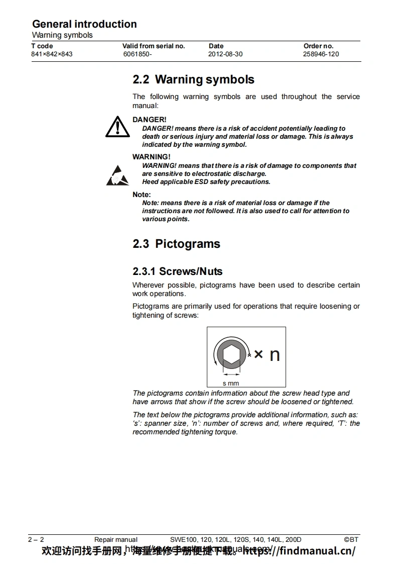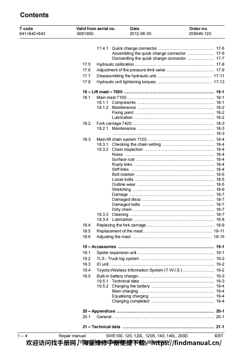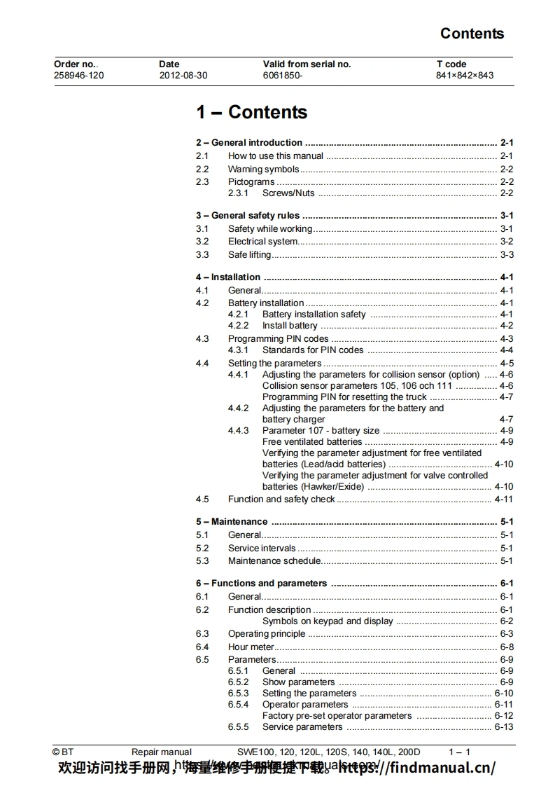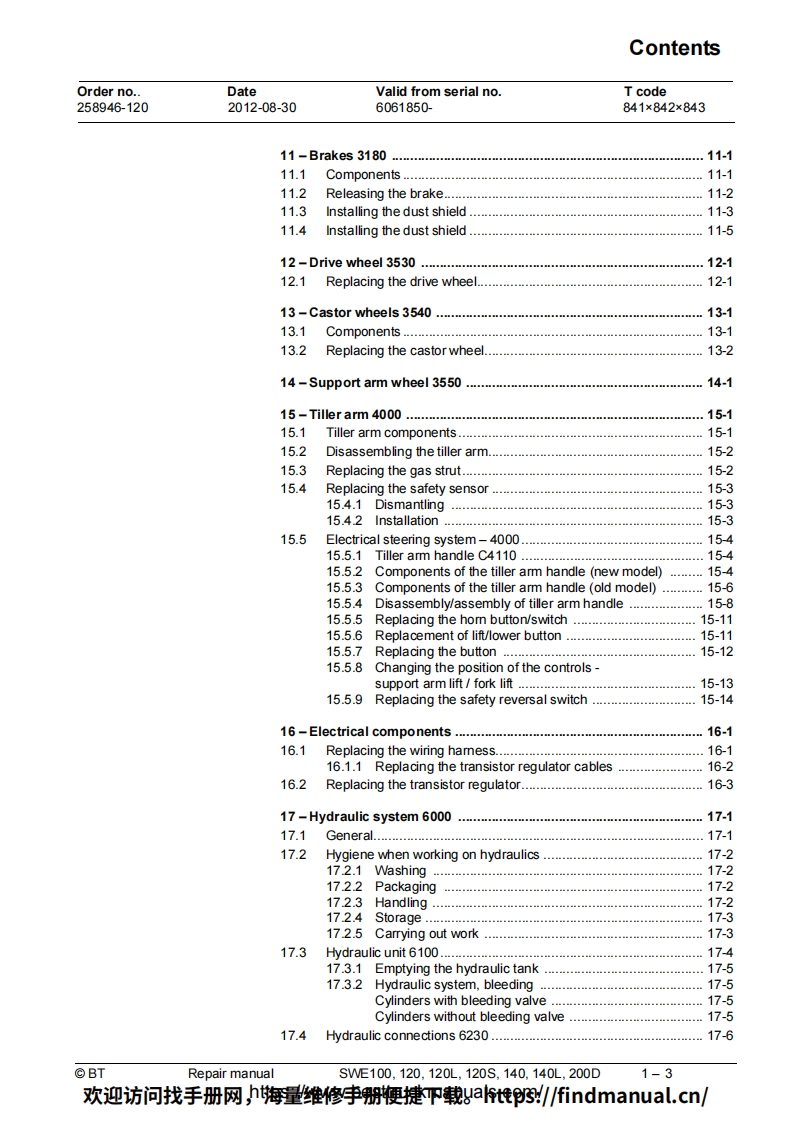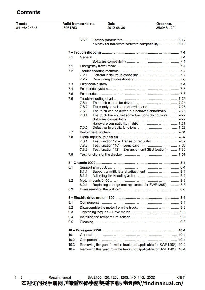 BT-SWE100-200D-Lift-Truck-Repair-Manual-PDF叉车维修手册含电器液压原理图找手册网3天前发布关注私信6.95MB230页050BT-SWE100-200D-Lift-Truck-Repair-Manual-PDF叉车维修手册含电器液压原理图此内容为付费资源,请付费后查看¥39¥49黄金会员免费钻石会员免费登录购买付费资源 第1页 / 共230页 第2页 / 共230页 第3页 / 共230页 第4页 / 共230页 第5页 / 共230页 第6页 / 共230页 第7页 / 共230页 第8页 / 共230页 第9页 / 共230页 第10页 / 共230页 试读已结束,还剩220页,您可下载完整版后进行离线阅读 THE END中联重科/山河智能/Doosan/BT 文本预览 BTRepair manualenSWE100,120,120L,120S,140,140L,200DApplies from serial number:6061850-Order number:258946-120Issued:2012-08-30 TP©BT Industries AB欢迎访问找手册网,h海量维修李册鞭捷吓载gat惟3/findmanual.cn/ 查看更多 收起部分 喜欢就支持一下吧收藏