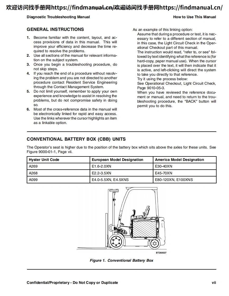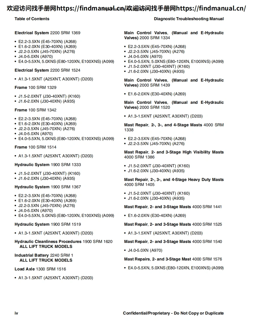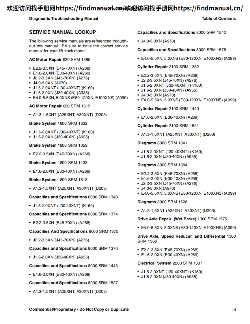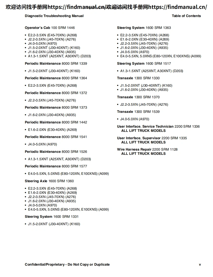 欢迎访问找手册网https:/findmanual.cn欢迎访间找手册网https:/findmanual..cn/DIAGNOSTICTROUBLESHOOTINGMANUALE2.2-3.5XN(E45-70XN))[A268];E1.6-2.0XN(E30-40XN)[A269];J2.2-3.5XN(J45-70XN)[A276];J1.6-2.0XN(J30-40XN)[A935];J4.0-5.0XN(J80-100XN)[A970];A1.3XNT,A1.5XNT (A25XNT,A30XNT)[D203];J1.5-2.0XNT(J30-40XNT)[K160];E4.0-5.5XN,E5.0XNS(E80-120XV,E100XNS)[A099]This manual contains information that is confidential andor proprietary to HysterCompany,its subsidiaries and/or vendors.Copying or distribution of any sections ofthis manual marked "Confidential/Proprietary"is prohibited.HYSTERPART NO.16888859000SRM1377