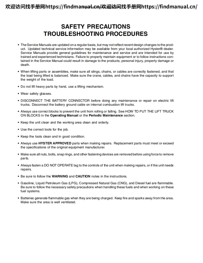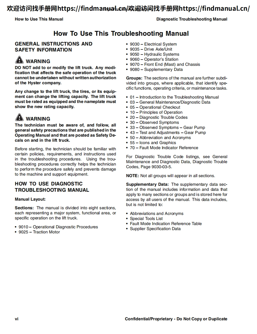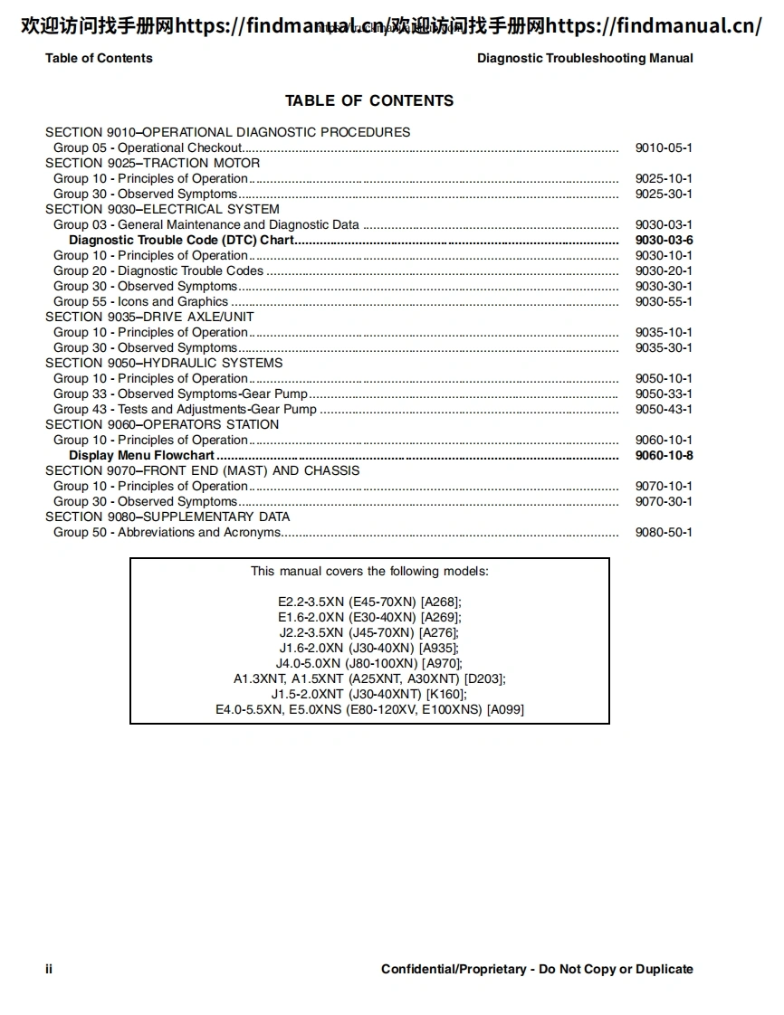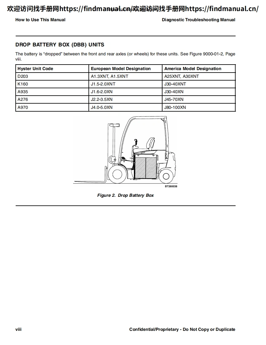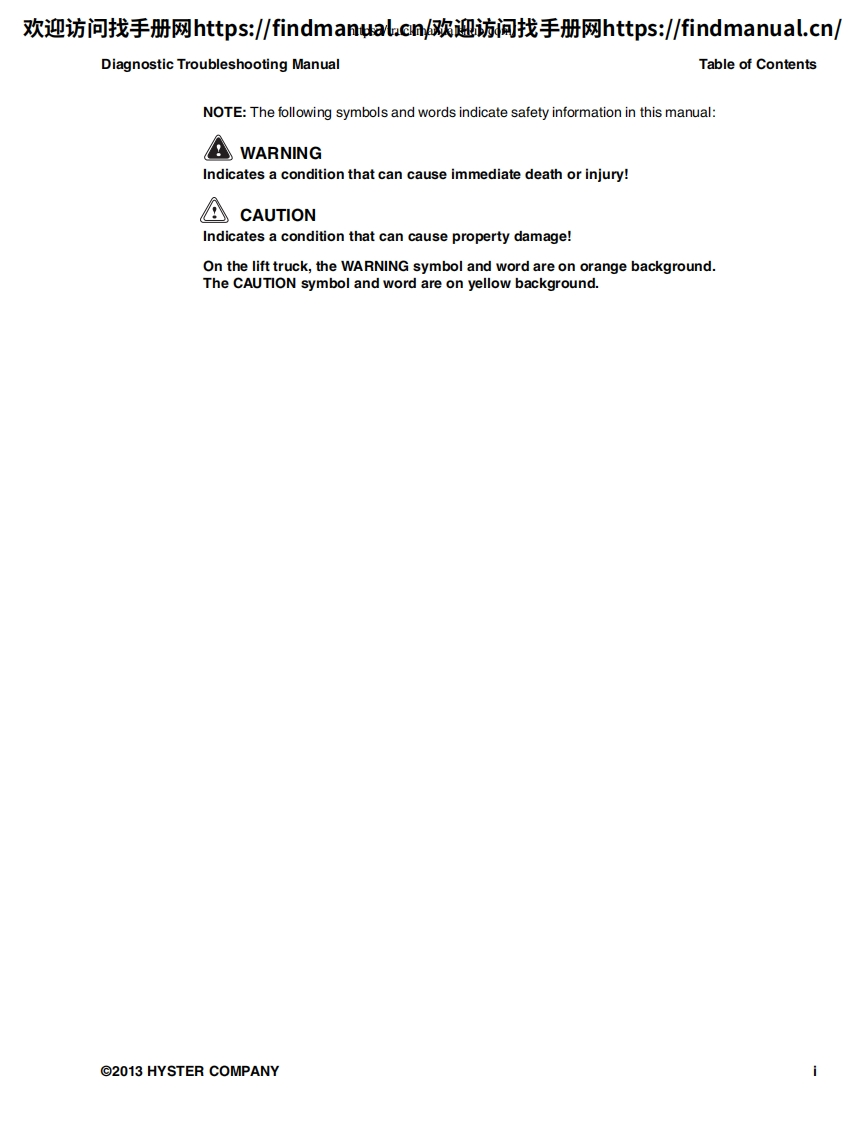 欢迎访问找手册网https:/findmanual.cn欢迎访间找手册网https:/findmanual..cn/DIAGNOSTICTROUBLESHOOTINGMANUALE2.2-3.5XN(E45-70XN))[A268];E1.6-2.0XN(E30-40XN)[A269];J2.2-3.5XN(J45-70XN)[A276];J1.6-2.0XN(J30-40XN)[A935];J4.0-5.0XN(J80-100XN)[A970];A1.3XNT,A1.5XNT (A25XNT,A30XNT)[D203];J1.5-2.0XNT(J30-40XNT)[K160];E4.0-5.5XN,E5.0XNS(E80-120XV,E100XNS)[A099]This manual contains information that is confidential andor proprietary to HysterCompany,its subsidiaries and/or vendors.Copying or distribution of any sections ofthis manual marked "Confidential/Proprietary"is prohibited.HYSTERPART NO.16888859000SRM1377