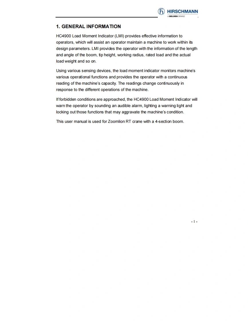 中联重科Zoomlion-Hirschmann-HC4900-Load-Moment-Indicator-User-Manual操作与维修手册含电器液压原理图找手册网3天前发布关注私信1.15MB39页035中联重科Zoomlion-Hirschmann-HC4900-Load-Moment-Indicator-User-Manual操作与维修手册含电器液压原理图此内容为付费资源,请付费后查看¥39¥49黄金会员免费钻石会员免费登录购买付费资源 第1页 / 共39页 第2页 / 共39页 第3页 / 共39页 第4页 / 共39页 第5页 / 共39页 第6页 / 共39页 第7页 / 共39页 第8页 / 共39页 第9页 / 共39页 第10页 / 共39页 试读已结束,还剩29页,您可下载完整版后进行离线阅读 THE END中联重科/山河智能/Doosan/BT 文本预览 HIRSCHMANNA BELDEN BRANDHC4900 Load Moment IndicatorUser ManualEdition 5/July,2014For Zoomlion RT CraneWith 4-section boom 查看更多 收起部分 喜欢就支持一下吧收藏