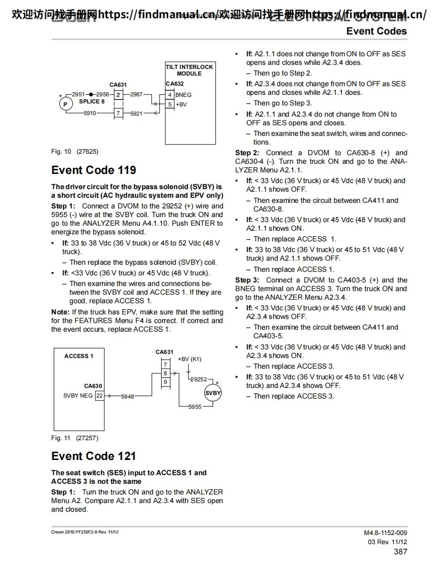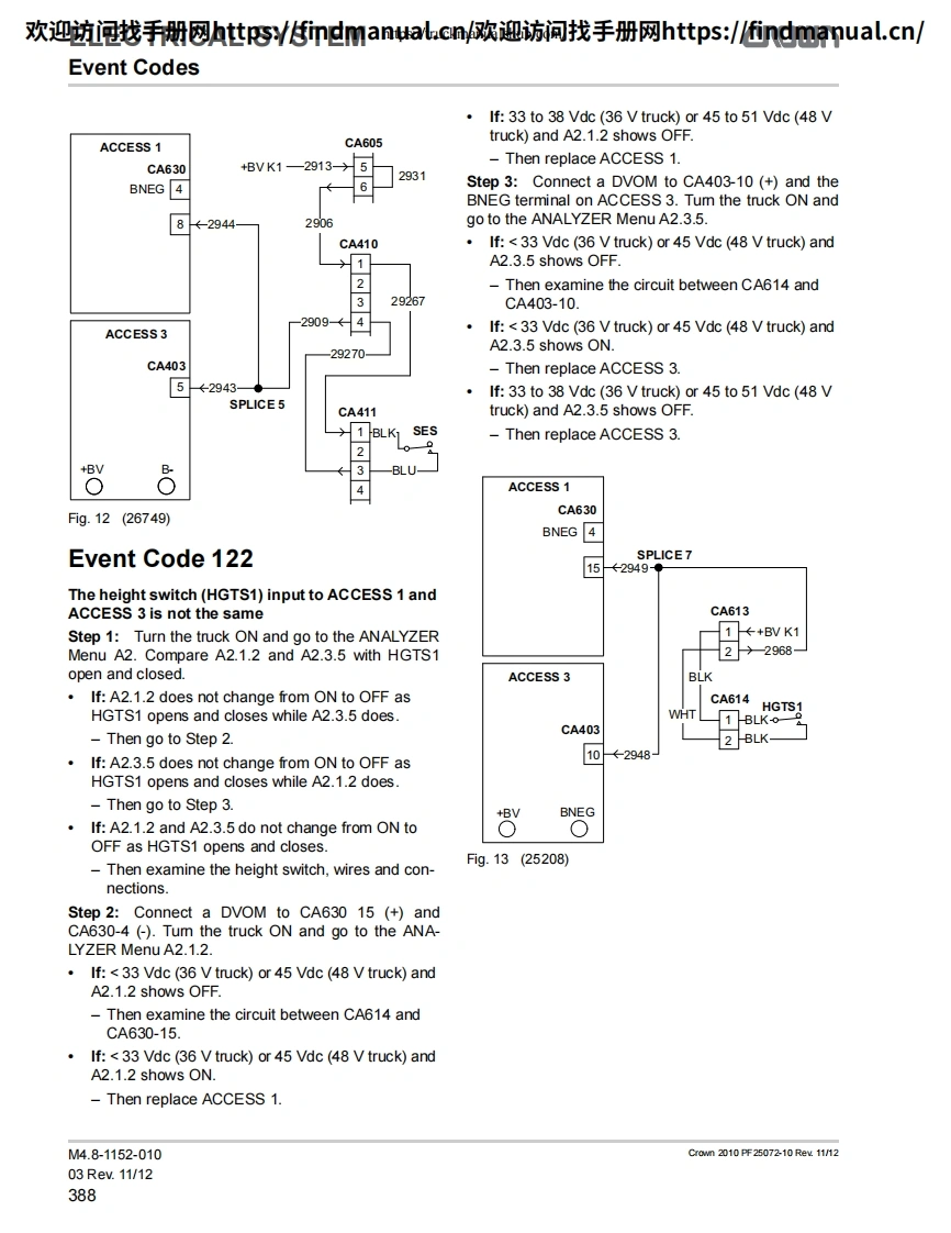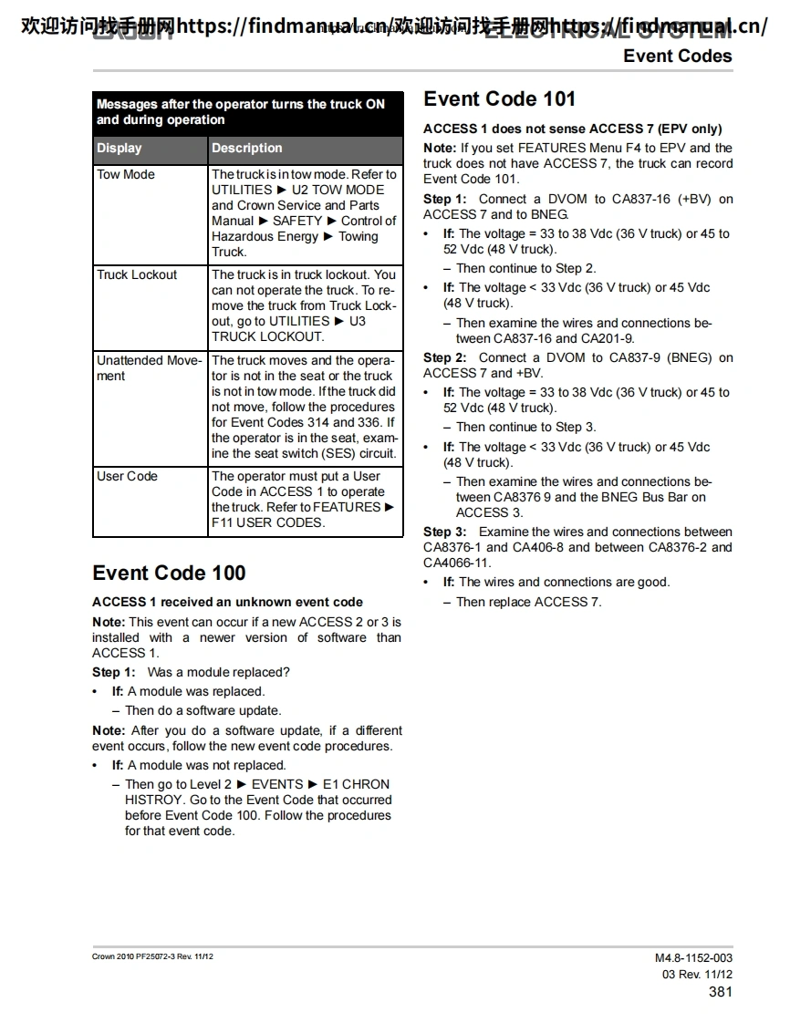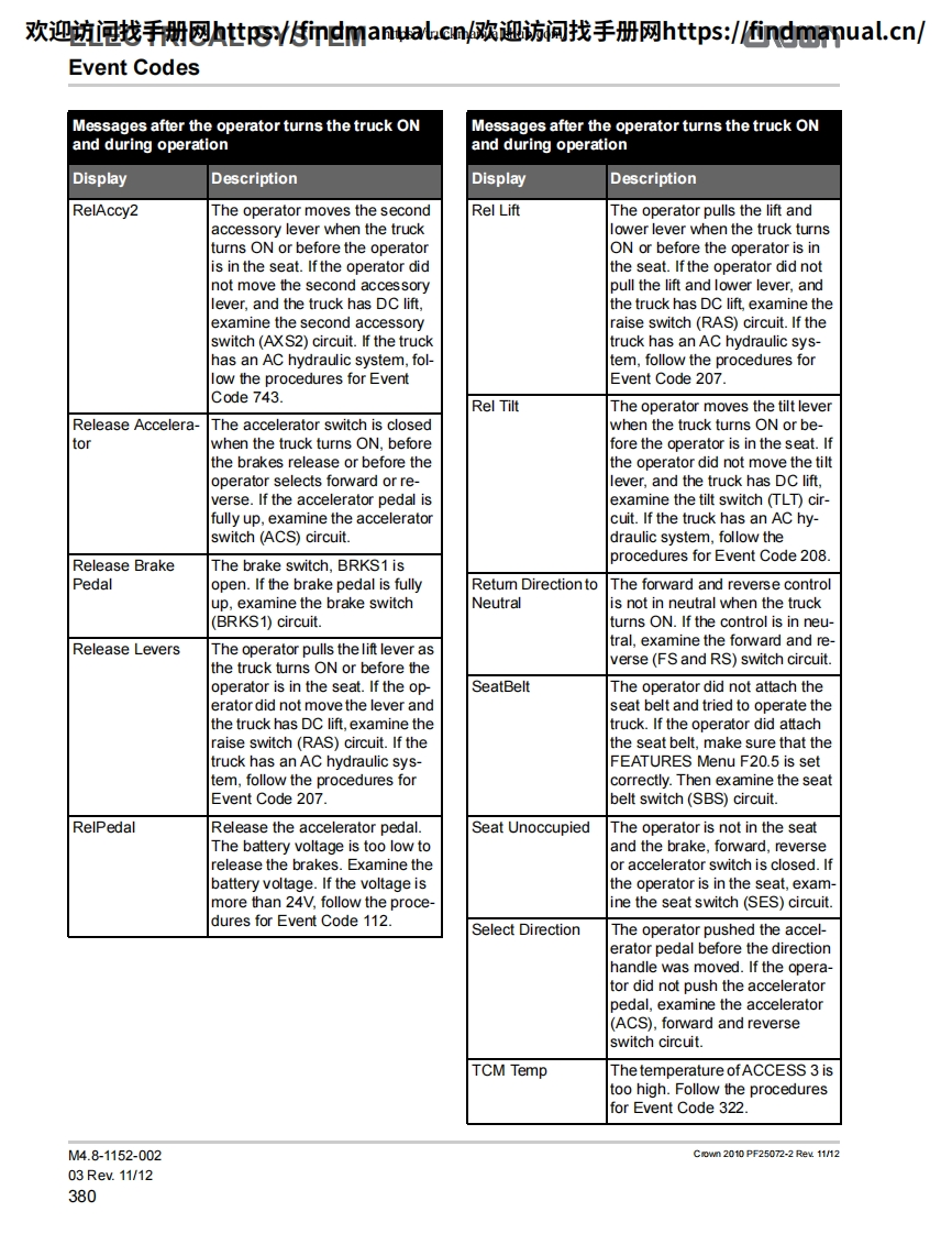 欢迎访问找舌册网https:/findmanual.cn欢迎访间找手册网W/findmanual.cn/Event CodesEvent CodesMessages after the operator turns the truck ONDisplay Messagesand during operationDuring truck operation,messages can occur that giveDisplayDescriptionvisual aid to the operator.After the operator or servicetechnician corrects the cause of the message,Low Battery,The battery charge is low and theACCESS 1 removes the message.Below is a list ofRekey to Lifttruck does not move.You canthese messages.turn the truck OFF and then ONtwo times.If the battery is notlow,make sure that the FEA-Messages after the operator turns the truck ONTURES Menu F3.4 is set cor-and during operationrectly.Then follow theprocedures for Event Code 315.DisplayDescriptionM1 TempThe temperature of the right trac-BattGateThe battery restraint switchtion motor is too high.Follow the(BRES)is open.Make sure thatprocedures for Event Code 323.the right battery cover is installedM2 TempThe temperature of the left trac-correctly.Make sure that thetion motor is too high.Follow theFEATURES Menu F20.1 is setprocedures for Event Code 338.correctly.Then examine the bat-tery restraint switch(BRES)cir-M3 TempThe temperature of the hydrauliccuit.motor is too high.Follow the pro-cedures for Event Code 228.Cycle BrakeFully push the brake pedal to re-Parameters Modi-lease the brakes.The Access 1 2 3 Menu settingsfiedchanged to the factory defaultFWD/REVThe forward and reverse switchsettings.Follow the proceduresclose at the same time.Followfor Event Code 318.the procedures for Event CodePM DueDo a PM on the truck.If the truck327.is not due for a PM,make sureHCM TempThe temperature of ACCESS 2 isthat the HOURS Menu H9 PMtoo high.Follow the proceduresTIMER is set correctly.for Event Code 226.Rekey Truck andThe truck lost calibration.TurnLift CutThe operator is not in the seatCalibratethe truck OFF and ON and followand pulls the lift handle.If the op-the procedures in the CALIBRA-erator is in the seat,examine theTION Menu.seat switch(SES)circuit.RelAccy1The operator moves the first ac-Low BattThe battery charge is low duringcessory lever when the trucktruck travel.If the battery is notturns ON or before the operatorlow,make sure that the FEA-is in the seat.If the operator didTURES Menu F3.4 is set cor-not move the first accessory le-rectly.Then follow thever,and the truck has DC lift,ex-procedures for Event Code 315.amine the first accessory switch(AXS1)circuit.If the truck has anLow Battery,LiftThe battery charge is low,theLockouttruck does not move and theAC hydraulic system,follow thetruck was tumed OFF and ONprocedures for Event Code 209.two times.If the battery is notlow,make sure that the FEA-TURES Menu F3.4 is set cor-rectly.Then follow theprocedures for Event Code 315.C0wn2010PF25072-1Re4/13M4.8-1152-00104Rev.4/13379