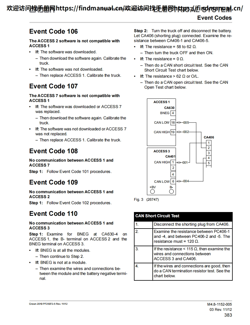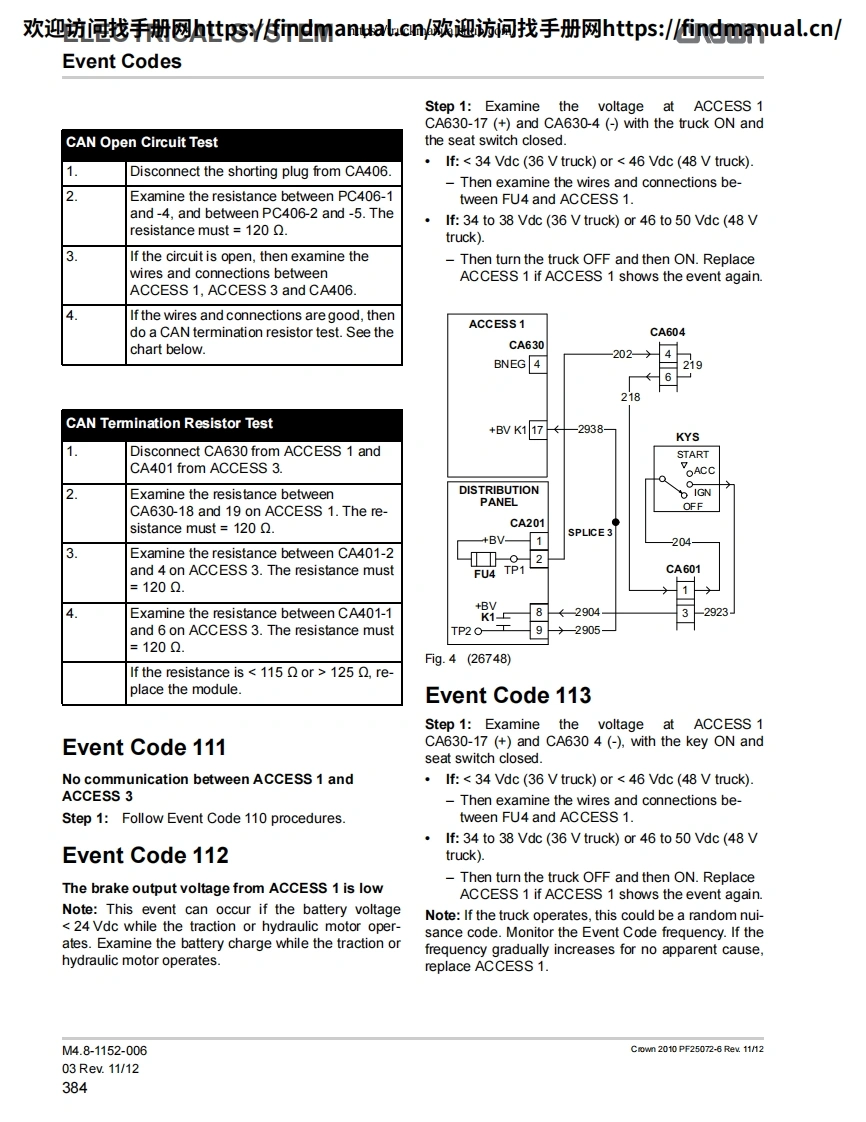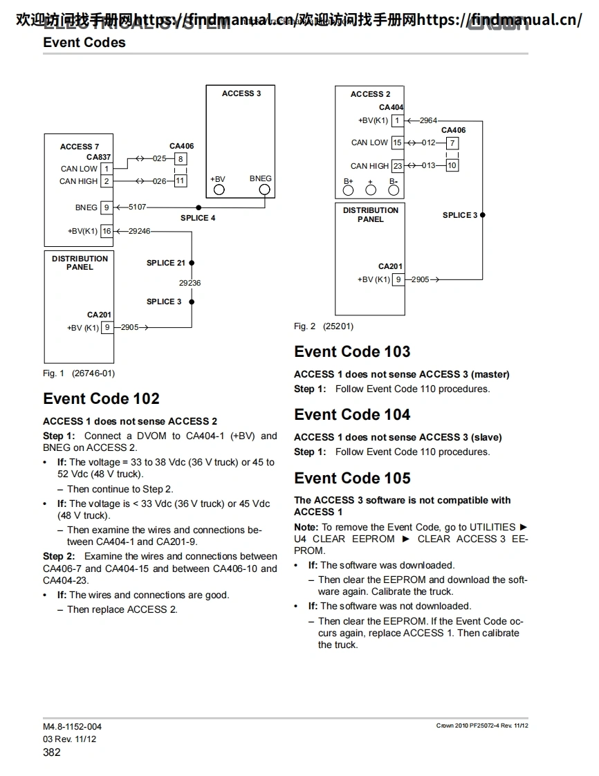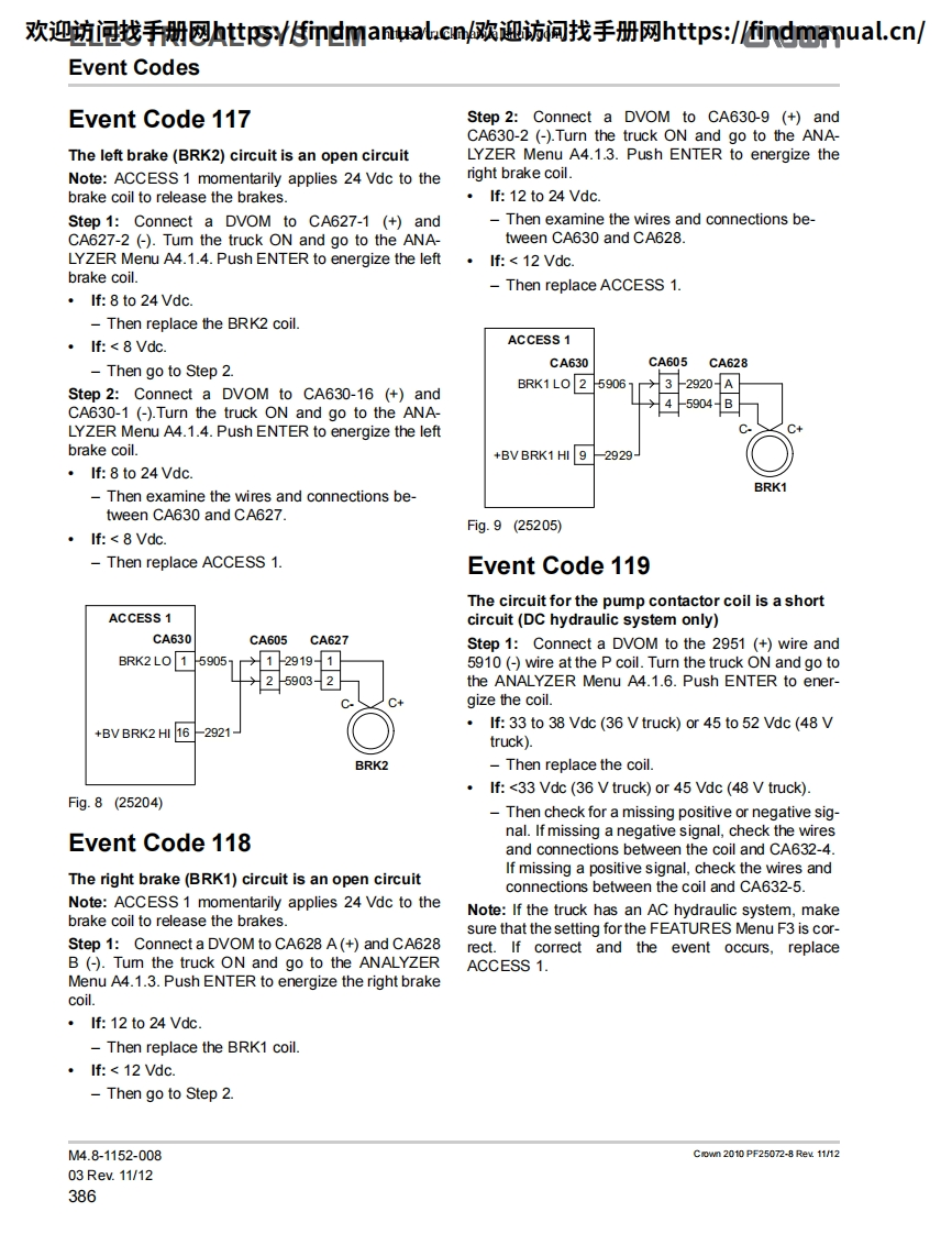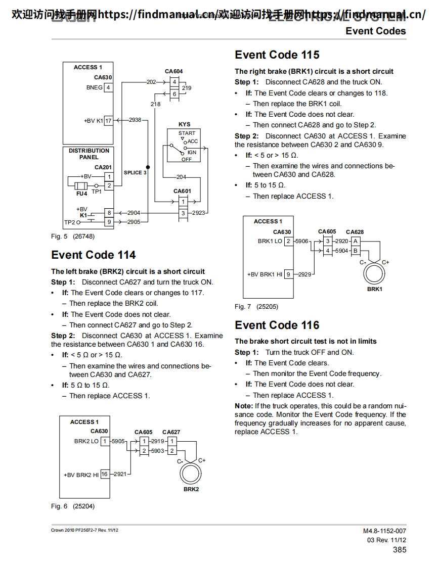 欢迎访问找舌册网https:/findmanual.cn欢迎访间找手册网W/findmanual.cn/Event CodesEvent CodesMessages after the operator turns the truck ONDisplay Messagesand during operationDuring truck operation,messages can occur that giveDisplayDescriptionvisual aid to the operator.After the operator or servicetechnician corrects the cause of the message,Low Battery,The battery charge is low and theACCESS 1 removes the message.Below is a list ofRekey to Lifttruck does not move.You canthese messages.turn the truck OFF and then ONtwo times.If the battery is notlow,make sure that the FEA-Messages after the operator turns the truck ONTURES Menu F3.4 is set cor-and during operationrectly.Then follow theprocedures for Event Code 315.DisplayDescriptionM1 TempThe temperature of the right trac-BattGateThe battery restraint switchtion motor is too high.Follow the(BRES)is open.Make sure thatprocedures for Event Code 323.the right battery cover is installedM2 TempThe temperature of the left trac-correctly.Make sure that thetion motor is too high.Follow theFEATURES Menu F20.1 is setprocedures for Event Code 338.correctly.Then examine the bat-tery restraint switch(BRES)cir-M3 TempThe temperature of the hydrauliccuit.motor is too high.Follow the pro-cedures for Event Code 228.Cycle BrakeFully push the brake pedal to re-Parameters Modi-lease the brakes.The Access 1 2 3 Menu settingsfiedchanged to the factory defaultFWD/REVThe forward and reverse switchsettings.Follow the proceduresclose at the same time.Followfor Event Code 318.the procedures for Event CodePM DueDo a PM on the truck.If the truck327.is not due for a PM,make sureHCM TempThe temperature of ACCESS 2 isthat the HOURS Menu H9 PMtoo high.Follow the proceduresTIMER is set correctly.for Event Code 226.Rekey Truck andThe truck lost calibration.TurnLift CutThe operator is not in the seatCalibratethe truck OFF and ON and followand pulls the lift handle.If the op-the procedures in the CALIBRA-erator is in the seat,examine theTION Menu.seat switch(SES)circuit.RelAccy1The operator moves the first ac-Low BattThe battery charge is low duringcessory lever when the trucktruck travel.If the battery is notturns ON or before the operatorlow,make sure that the FEA-is in the seat.If the operator didTURES Menu F3.4 is set cor-not move the first accessory le-rectly.Then follow thever,and the truck has DC lift,ex-procedures for Event Code 315.amine the first accessory switch(AXS1)circuit.If the truck has anLow Battery,LiftThe battery charge is low,theLockouttruck does not move and theAC hydraulic system,follow thetruck was tumed OFF and ONprocedures for Event Code 209.two times.If the battery is notlow,make sure that the FEA-TURES Menu F3.4 is set cor-rectly.Then follow theprocedures for Event Code 315.C0wn2010PF25072-1Re4/13M4.8-1152-00104Rev.4/13379