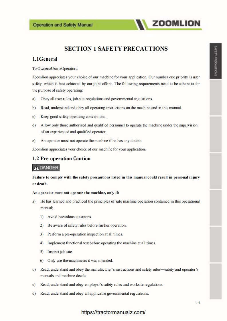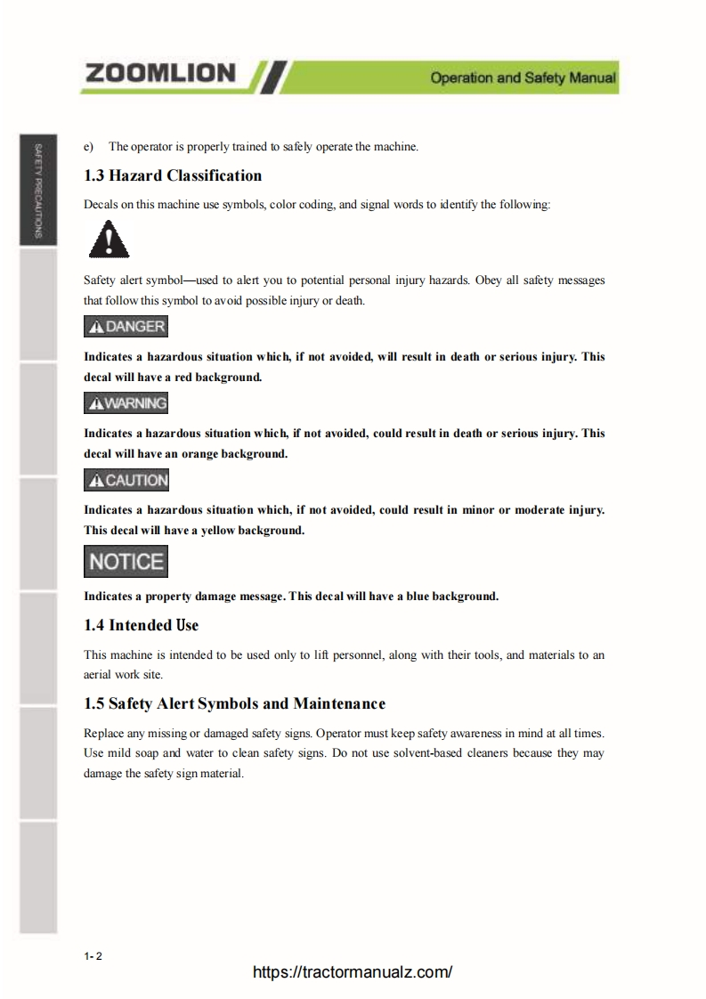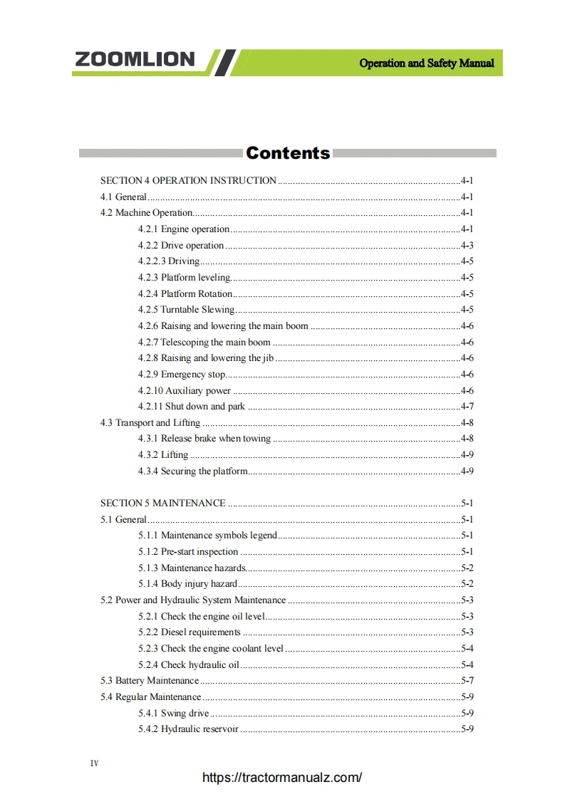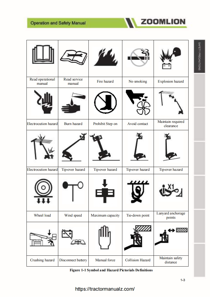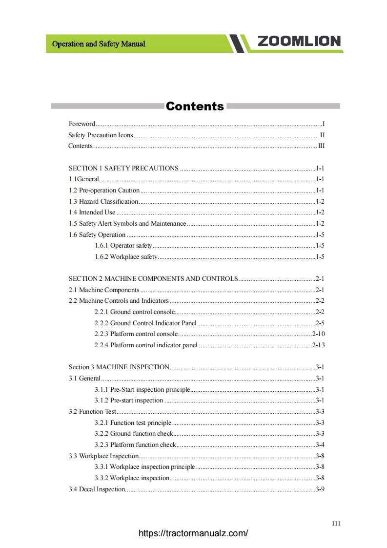Operation and Safety ManualZOOMLIONForewordZoomlion appreciates your choice ofour machine for your application.The Operation and Safety Manualmust be read and understood in its entirety before operating the machine.This manual introduces you safety information,significant technical specs,safety operation in detail forworking efficiency improving.Keep this manual properly at all times for looking up.Do not operate the machine if there is any doubt in operation,please consult local service team fortroubleshooting.Zoomlion AWP Machinery Company does not take the consequence of wrong operation.This manual should be considered a permanent part ofyour machine and should remain with the machineat all times.The content is under intellectual property protection,pemmission is required for a copy or other application.There might be some tiny differences in detail between your machine and the upgraded one due to thecontinuous improving.For clarification,questions,or additional information regarding any portions ofthis manual,Contact Zoomlion AWP Machinery.Our company reserves the right to modify this manual as technical improvement without notice.Thank you for your trust and support for Zoomlion products!Comply with ANSI SAIA_A92.20-2018 and CSA-B354.6-2017 StandardIhttps://tractormanualz.com/