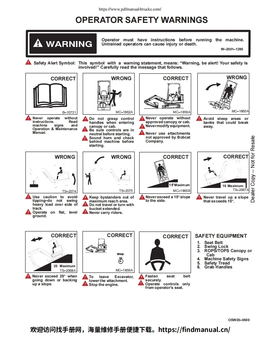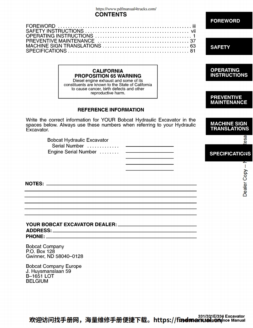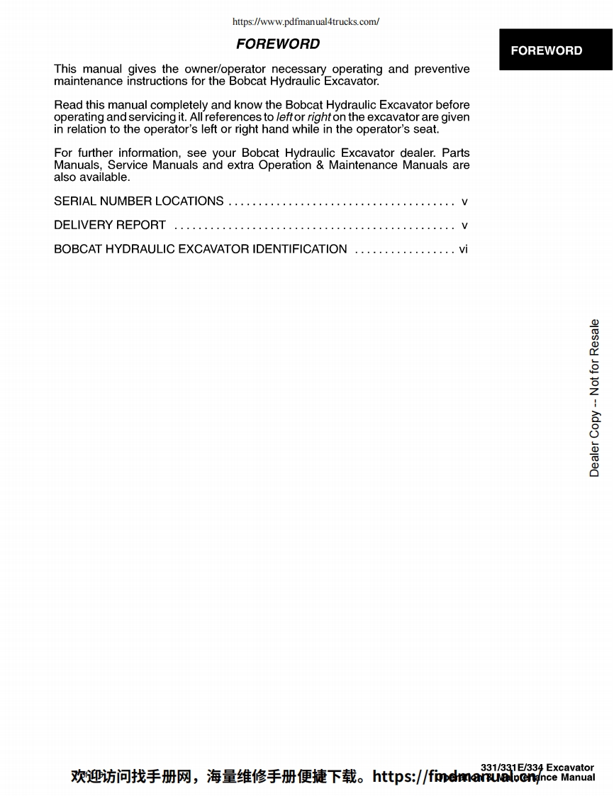 https://www.pdfmanual4trucks.com/X331Bobcat.X331EOperationX334&MaintenanceManualS/N512915200&AboveS/N517711001&AboveS/N516711001&Aboveservice marks.logos.or other proprietary idennfying marks be longingto Ingersoll-Rand Company in this mamal is historical or nominativein nature,and is not meant to suggest a current affiliation benveenIngersoll-Rand Company and Bobcat Company or the ofeither6900557(6-00)Revised5-12)Printed in U.S.ABobcat Company 2000欢迎访问找手册网,海量维修手册便捷下载。https:/findmanual..cn/