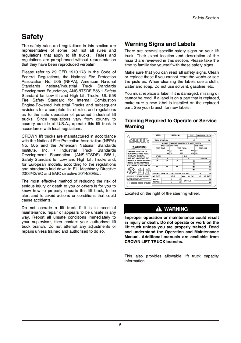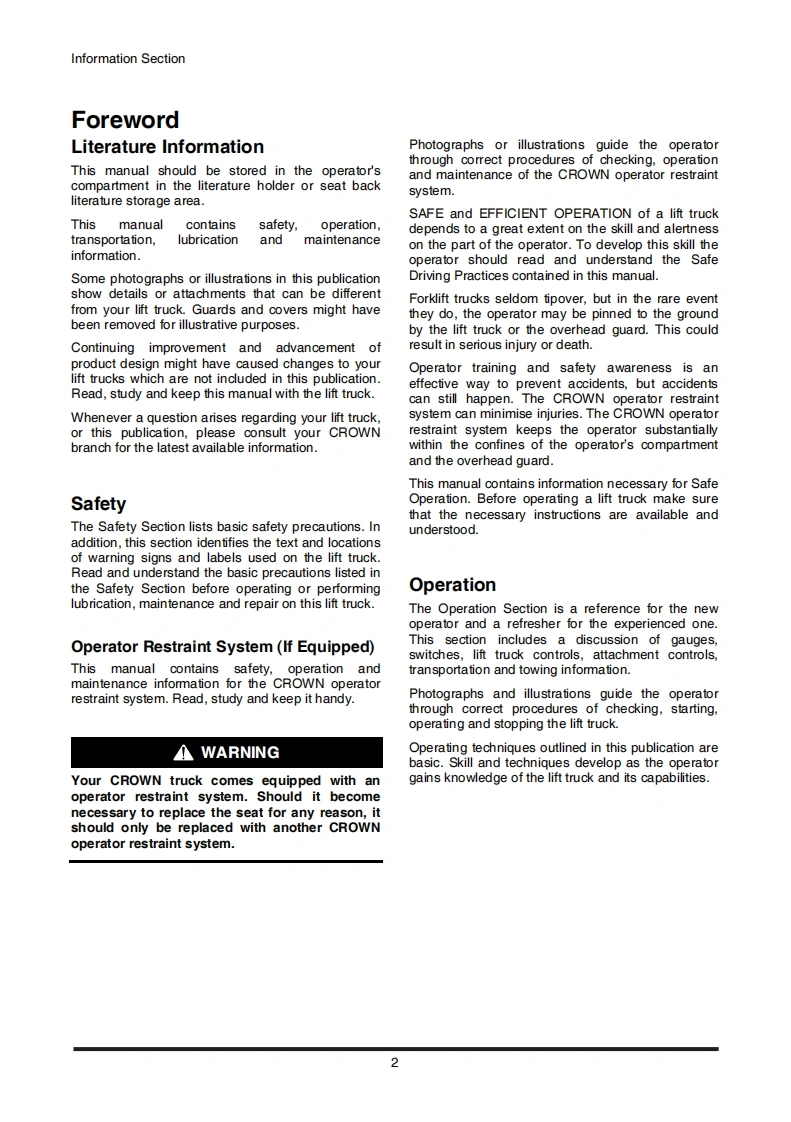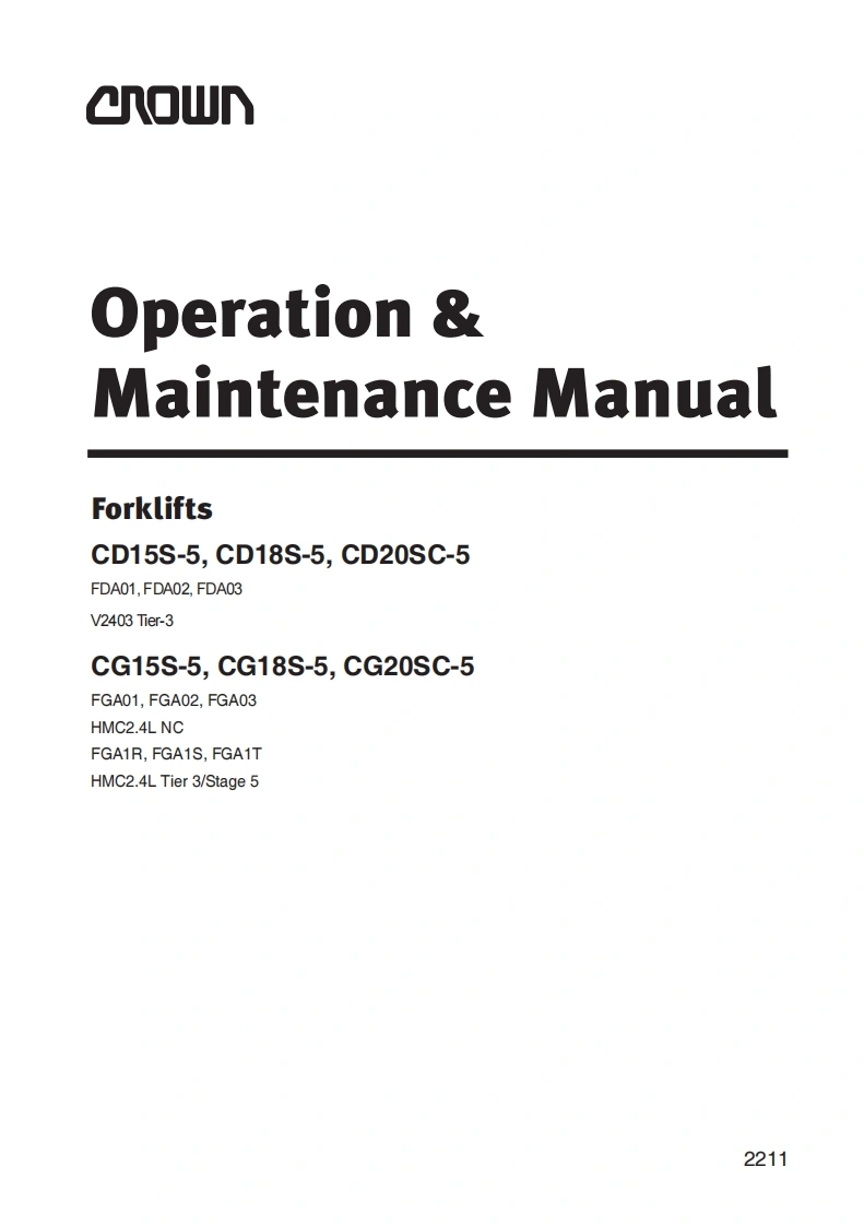 150X210X9.5(H)mmXS82363E10NAeMownCnoWn11.2022a▣WCD(CG)15/188-5.Please visit crowncom to tind your local Crown dealer.Operationwww.crow.comCD/CG)20SC-5Maintenance ManualCD15S-5,CD18S-5,CD20SC-5FOA01.FDA02.FCA03Operation Maintenance Manual/240gTe-3CG15S-5,CG18S-5,CG20SC-5FGA01.FGA02.FGA03HMC2.AL NCFGA1A.FGA1S.FGAITHMC2.4L Tier 3/Stage 5Forklifts