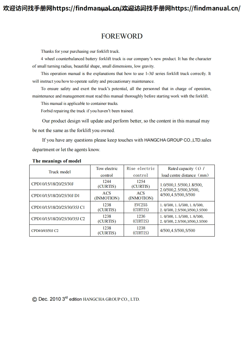欢迎访问找手册网https:/findmanual.cn欢迎访间找手册网https:/findmanual.cn/SC>HANGCHACPD10/15/18/20/25/30JCPD10/15/18/20/25/30JD1CPD10/15/18/20/25/30/35JC1CPD10/15/18/20/25/30/35JC2CPD40/45/50JD1CPD40/45/50JC21~5t J Series Counterbalanced Battery Forklift TruckSERVICE MANUALOriginal InstructionHANGCHA GROUP CO.,LTD.Dec.2010 3d edition