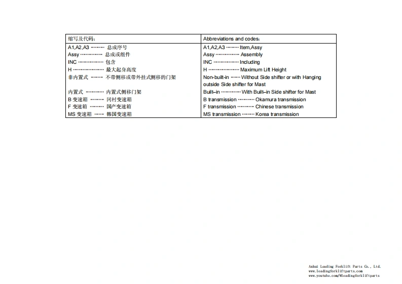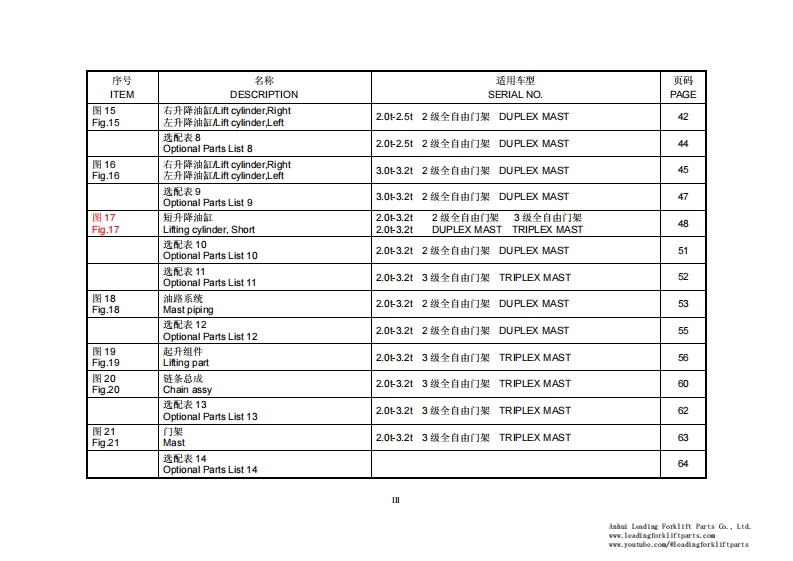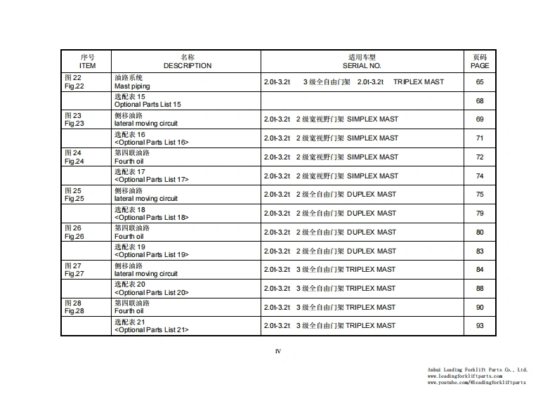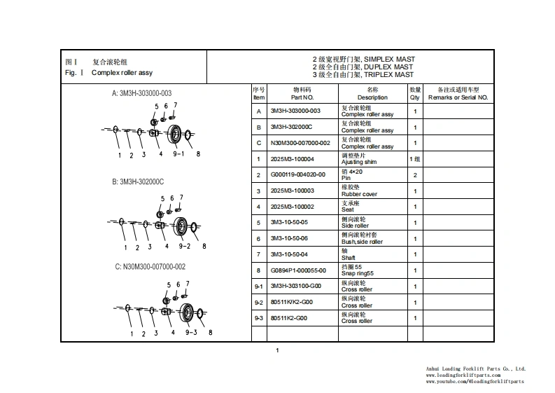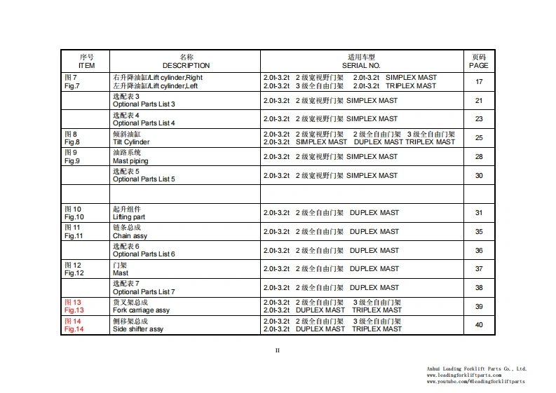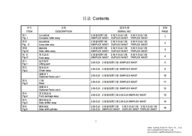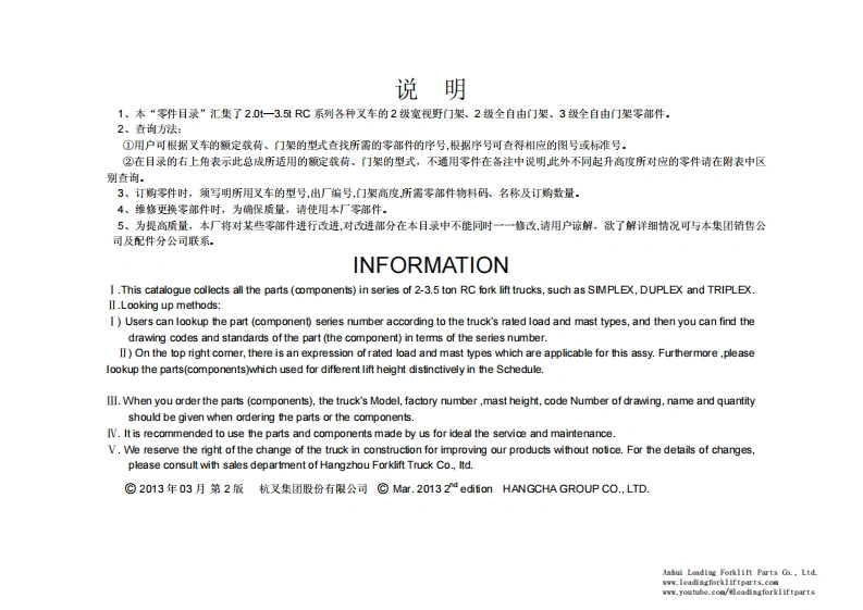 022.0t~3.2tRC系列内燃平衡重式叉车2.0t~3.2t RC Series Intemal Combustion Counterbalanced Forklift Truck门架零件目录MAST PARST CATALOGHangcha Forklift Parts ManualForklift Mast Parts CatalogHangcha 2.0t-3.2t RC Series Internal CombustionCounterbalanced Forklift TruckThis catalog collects all the components in a series of 2-3.5 ton RC forklift trucks,such asSIMPLEX,DUPLEX,and TRIPLEX.1.Mast,Fork Assy,Chain Assy,Fork Carriage Assy,Side Shifter Assy:2.Lifting parts,Mast Piping,Lateral Moving Circuit,Fourth Oil;3.Side Shift Cylinder,Lift Cylinder(Right),Lift Cylinder(Left),Tilt Cylinder,Lifting Cylinder(Short);4.Complex Roller Assy,Cross Roller Assy;5.Other Optional Parts List.Noted:1.Users can look up the component series number according to the truck's rated load and masttypes,and then they can find the drawing codes and standards of the part in terms of the seriesnumber.2.On the top right corner,there is an expression of rated load and mast types which are applicablefor this assy.Furthermore,please look at the parts used for different lift heights distinctively in theschedule.Anhui Leading Forklift Parts Co.,Ltd.www.leadingforkliftparts.comwww.youtube.com/@leadingforkliftparts