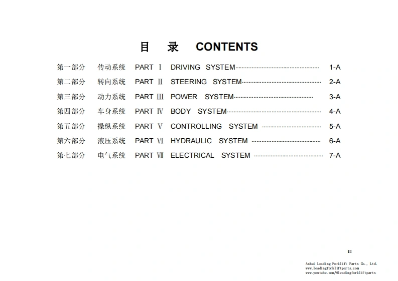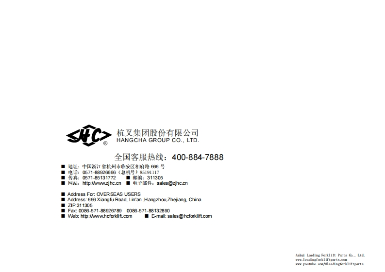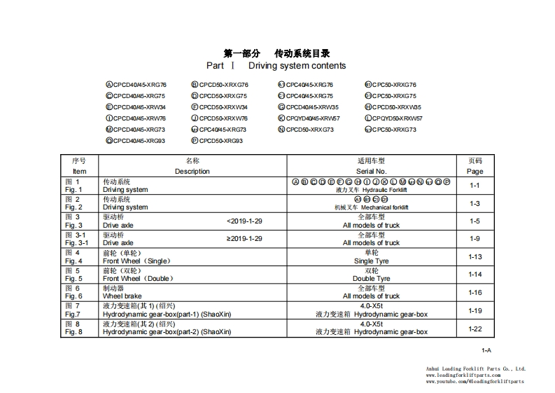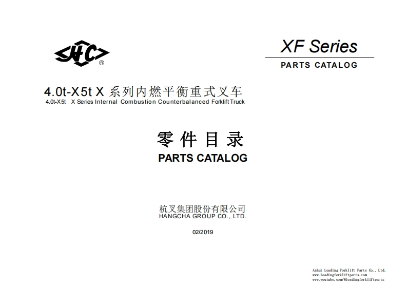 sCzXF SeriesPARTS CATALOG4.0t-X5tX系列内燃平衡重式叉车4.0t-X5t X Series Internal Combustion Counterbalanced Forknt Truck零件目录PARTS CATALOG核品集用熙懇公恩02209Hangcha Forklift Spare Parts ManualCPCD50 Hangcha Truck PartsHangcha X-Series 4.0t-X5t Internal CombustionCounterbalanced Forklift TruckThis catalog collects all of the components in an X-series of 4-5-ton forklift trucks.Noted:1.Looking up the series number of the part in the drawing of the assembly,in which thepart is in the catalog,and then the codes of the drawing and standard of the part in termsof the series number.2.No noted are all of the interchangeable parts and components,non-interchangeable partsand components are noted that which model can be applied,and it will be noted at the topright corner of the catalog and corresponding remark.3.Container forklift truck and CP series truck are the same except for the lifting system.4.For Mast parts see "4-X5t X Series Internal Combustion Counterbalanced Forklift TruckMast Parts Catalog".Anhui Leading Forklift Parts Co.,Ltd.www.leadingforkliftparts.comwww.youtube.com/@leadingforkliftparts
