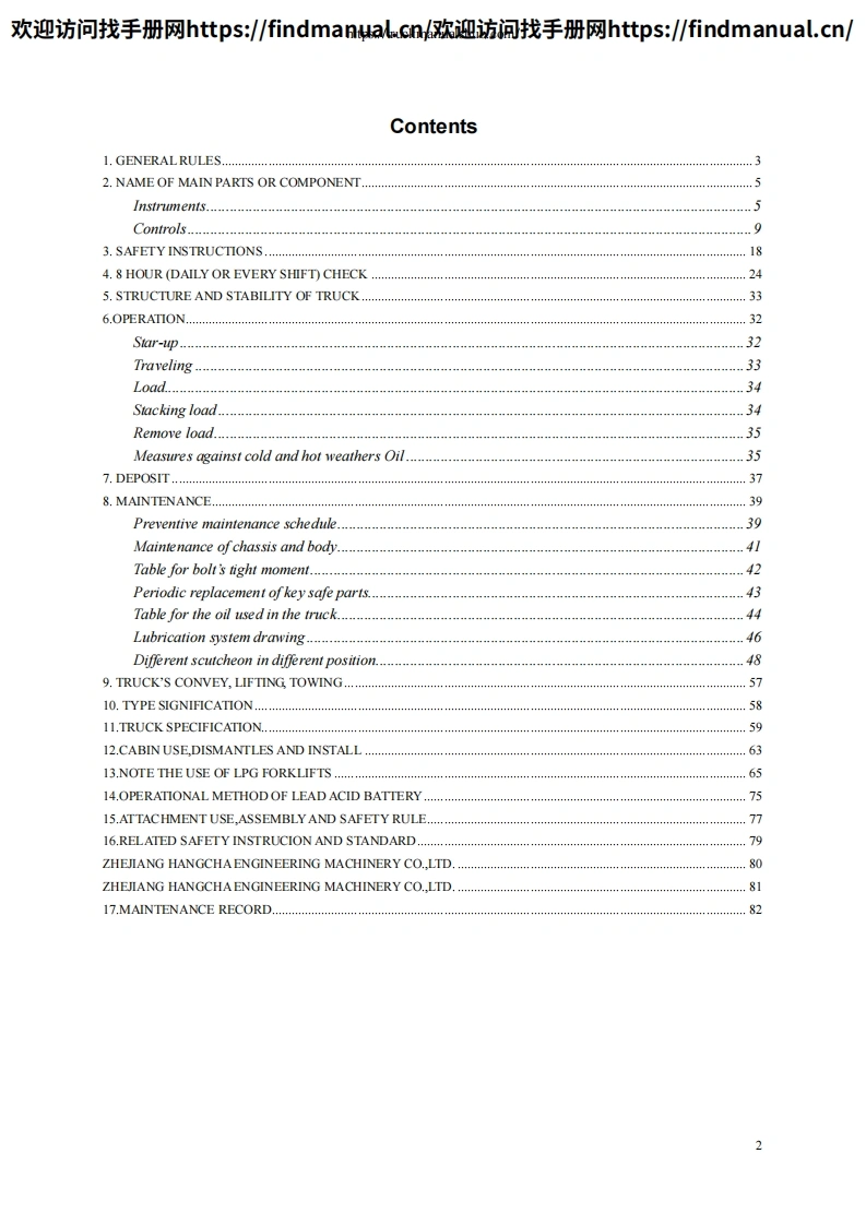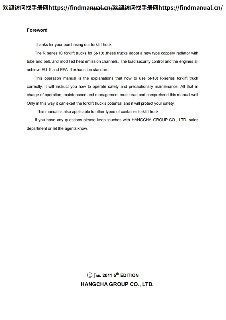 欢迎访问找手册网https:/findmanμal.cn/>欢迎访间找手册网https:/findmanual..cn/℃>HANGCHA5t-10t R SeriesInternal Combustion Counterbanlance Forklift TruckOPERATION AND MAINTENANCE MANUALCPCD50/60/70/80/100-RW28CPYD50/60/70-RW17(CPQD50/60/70-RW17-Y)CPCD50/60/70-RW38(€Original InstructionHANGCHA GROUP CO.,LTD.Jan.2011 5th EDITION