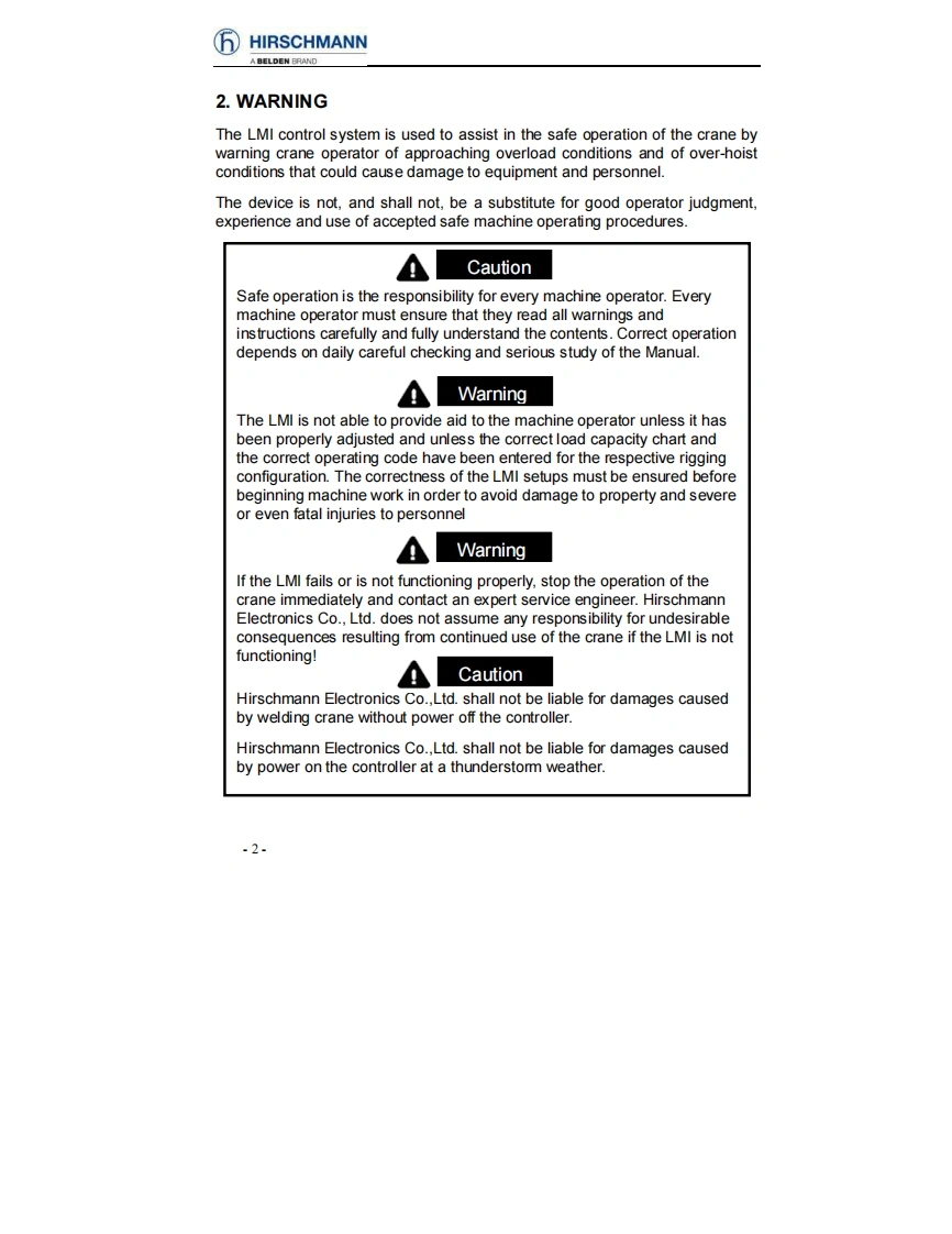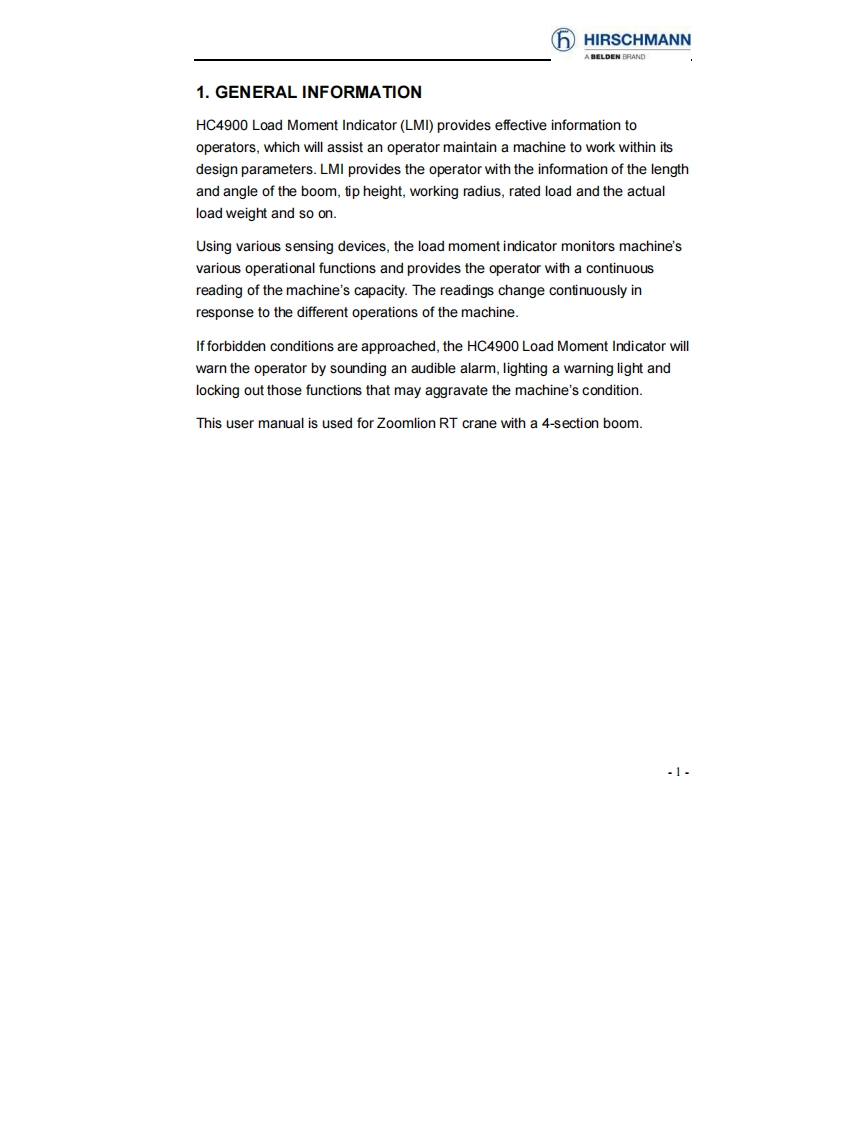 中联重科起重机吊车-Hirschmann-HC4900-Load-Moment-Indicator-操作说明书手册User-Manual_找手册网前天发布关注私信0.64MB39页043中联重科起重机吊车-Hirschmann-HC4900-Load-Moment-Indicator-操作说明书手册User-Manual_此内容为付费资源,请付费后查看¥39¥49黄金会员免费钻石会员免费登录购买付费资源 第1页 / 共39页 第2页 / 共39页 第3页 / 共39页 第4页 / 共39页 第5页 / 共39页 第6页 / 共39页 第7页 / 共39页 第8页 / 共39页 第9页 / 共39页 第10页 / 共39页 试读已结束,还剩29页,您可下载完整版后进行离线阅读 THE END中联重科/山河智能/Doosan/BT 文本预览 HIRSCHMANNA BELDEN BRANDHC4900 Load Moment IndicatorUser Manual34Edition 5/July,2014For Zoomlion RT CraneWith 4-section boom 查看更多 收起部分 喜欢就支持一下吧收藏