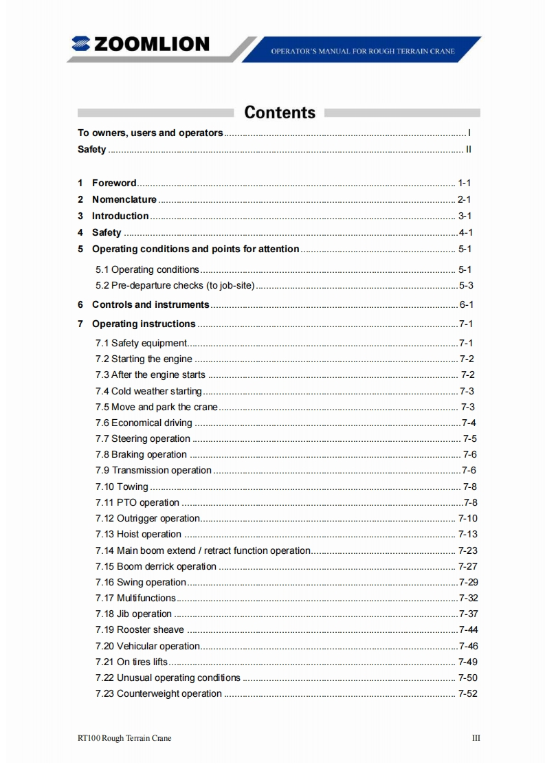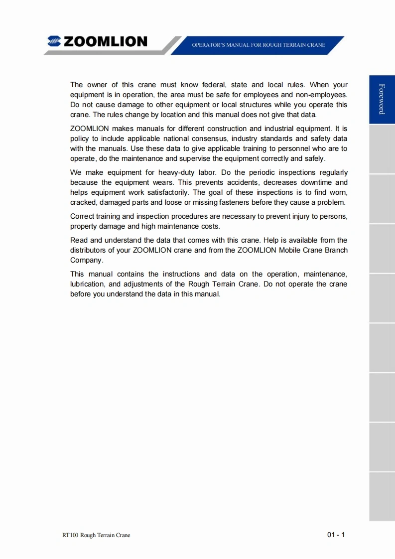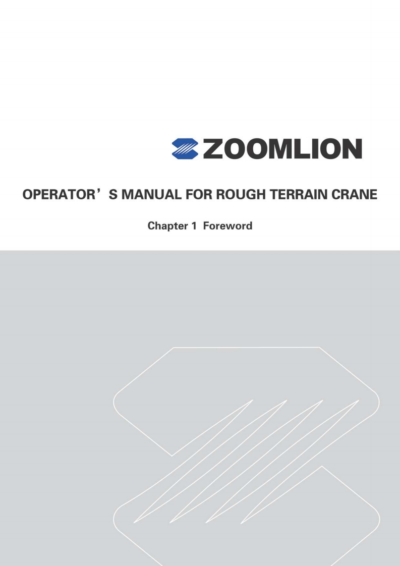 Vision creates futureSZOOMLIONZOOMLIONOPERATOR'S MANUAL FORRT100 ROUGH TERRAIN CRANE200MLON HEAY INDUSTRY SCENCE AND TECHNOLOGY OOJLTDChangsha Ecoonic and Toemdogica DevdopmentZone.Hunan Proince CnaAea0d240131ZOOMLION HEAWY NDUSTRY SCIENCE AND TECHNOLOGY OOLTD