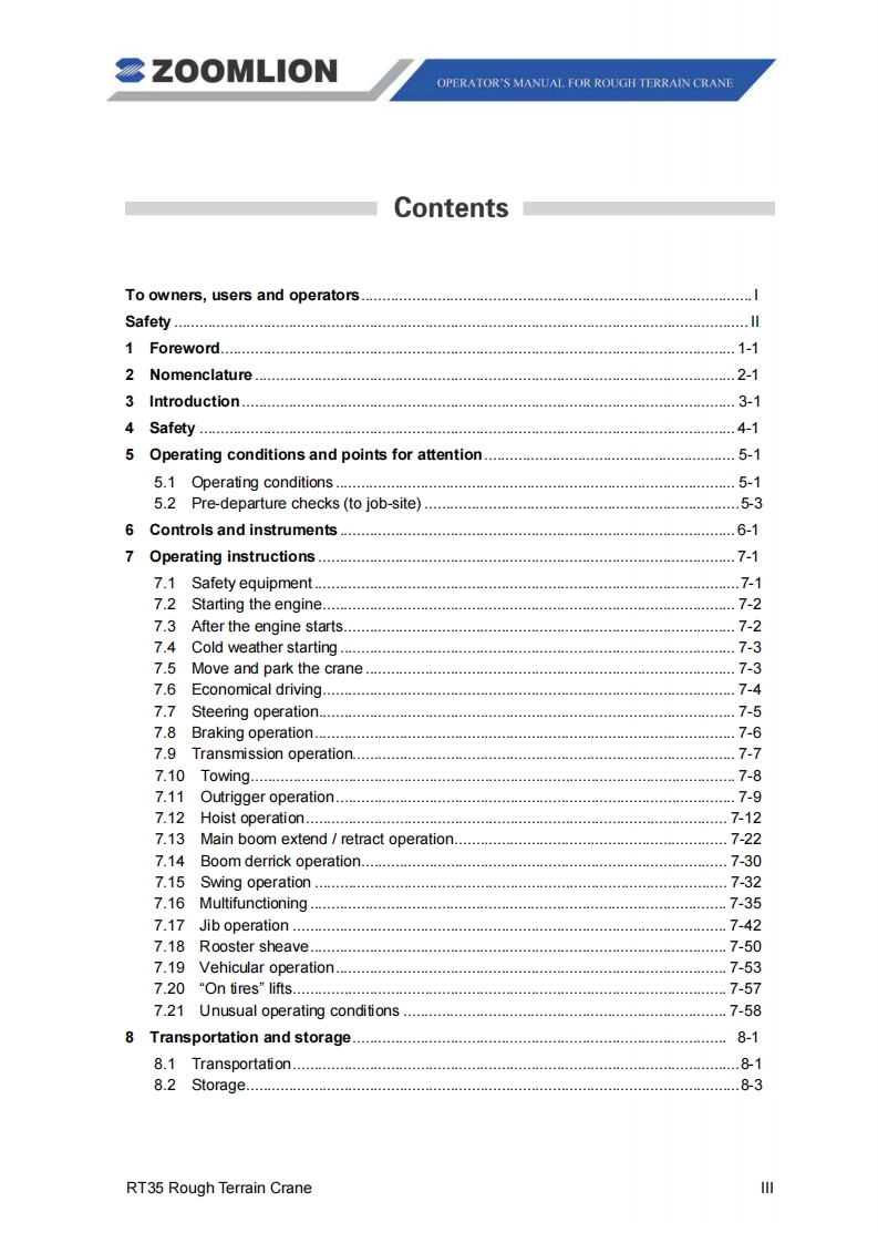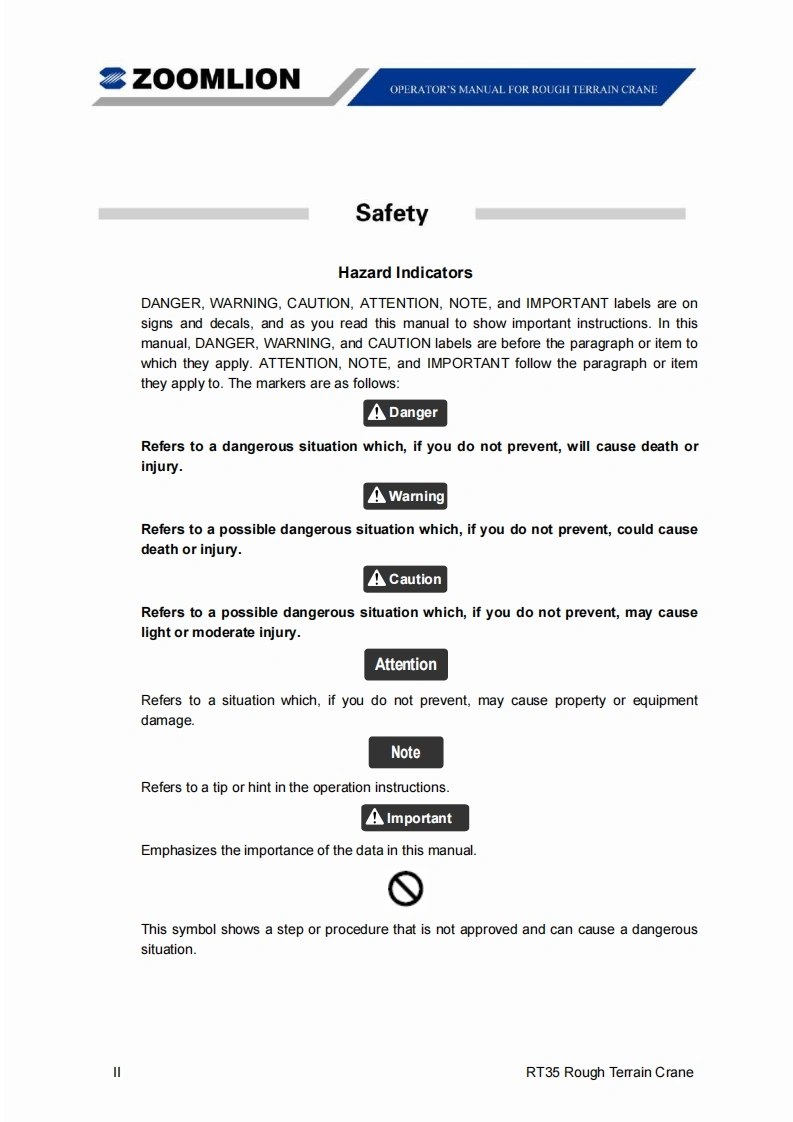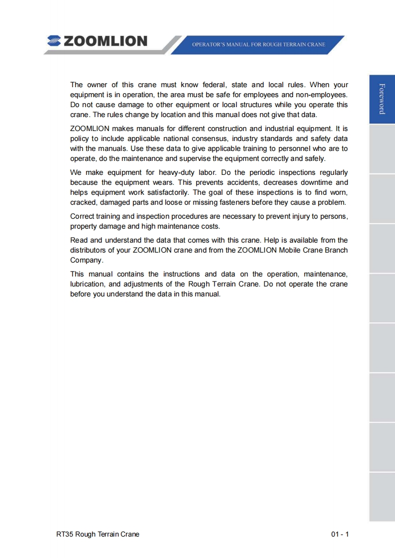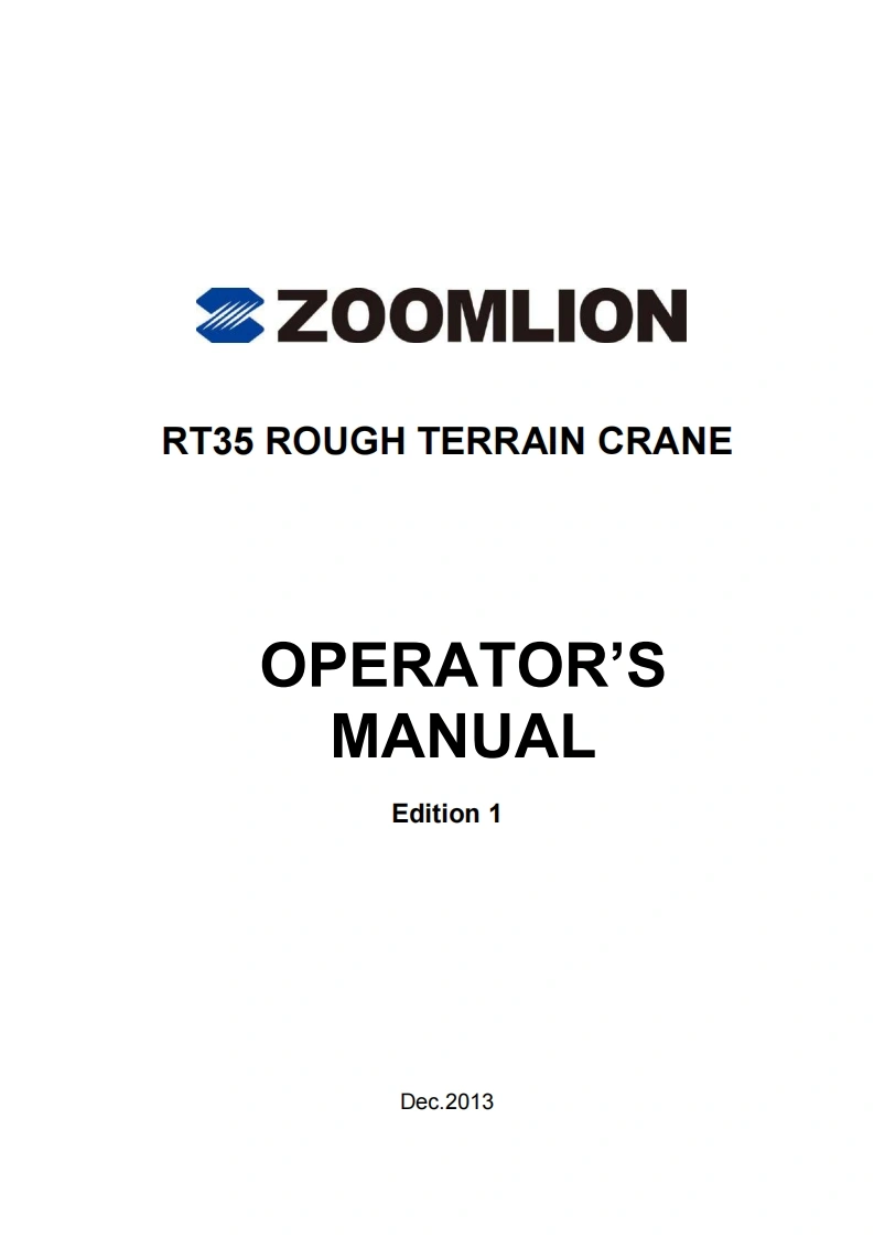 Vision creates futureSZOOMLIONZOOMLIONOPERATOR'S MANUAL FORRT35 ROUGH TERRAIN CRANE200MUON HEAY NDUSTRY SCENCE AND TECHNOLOGY OOULTDChangsha Ecoonic and Toemdogical DevdepmentZone.Hunan Proince CnaPostoode:410131ZOOMLION HEAWY NDUSTRY SCIENCE AND TECHNOLOGY OOLTD