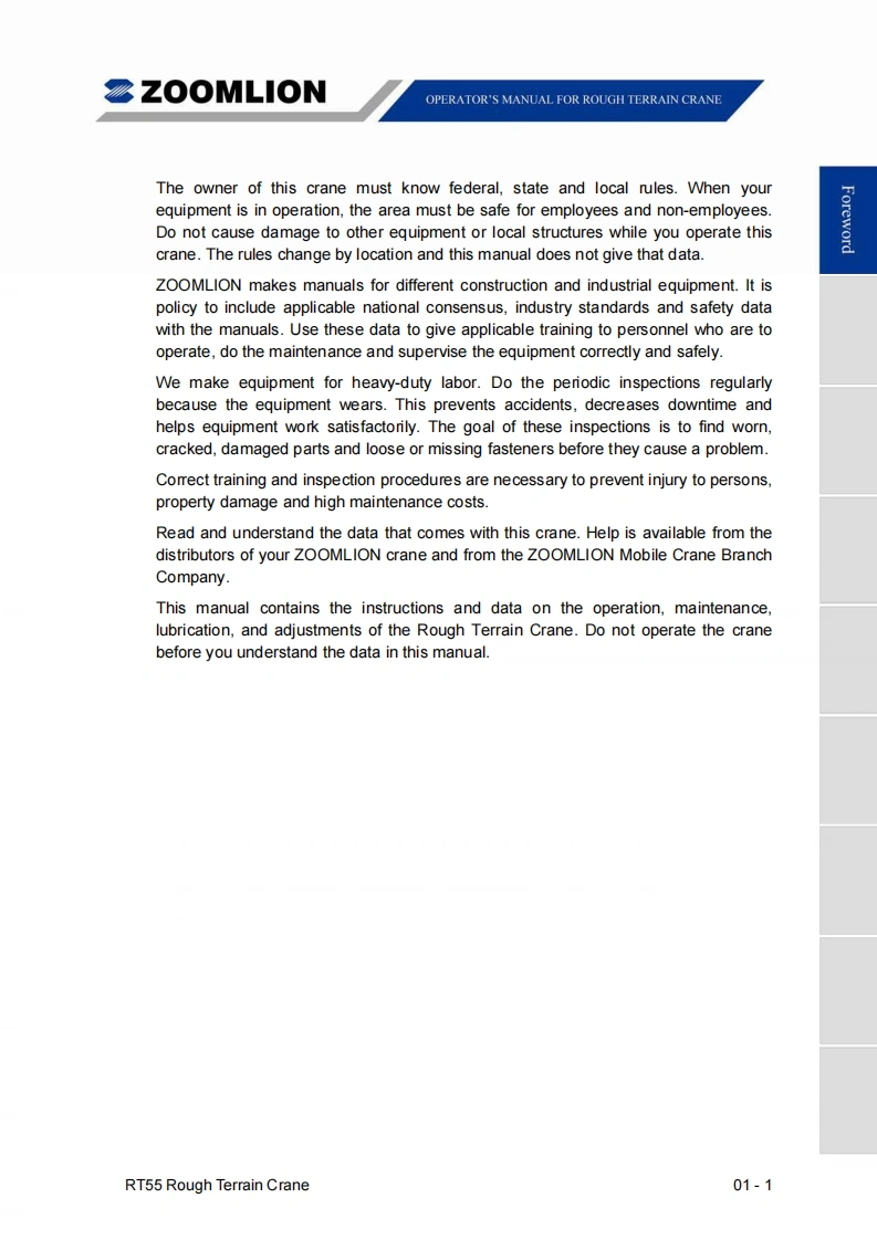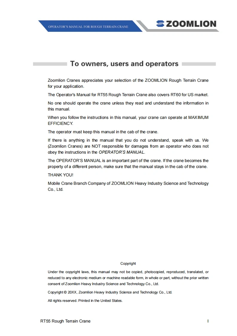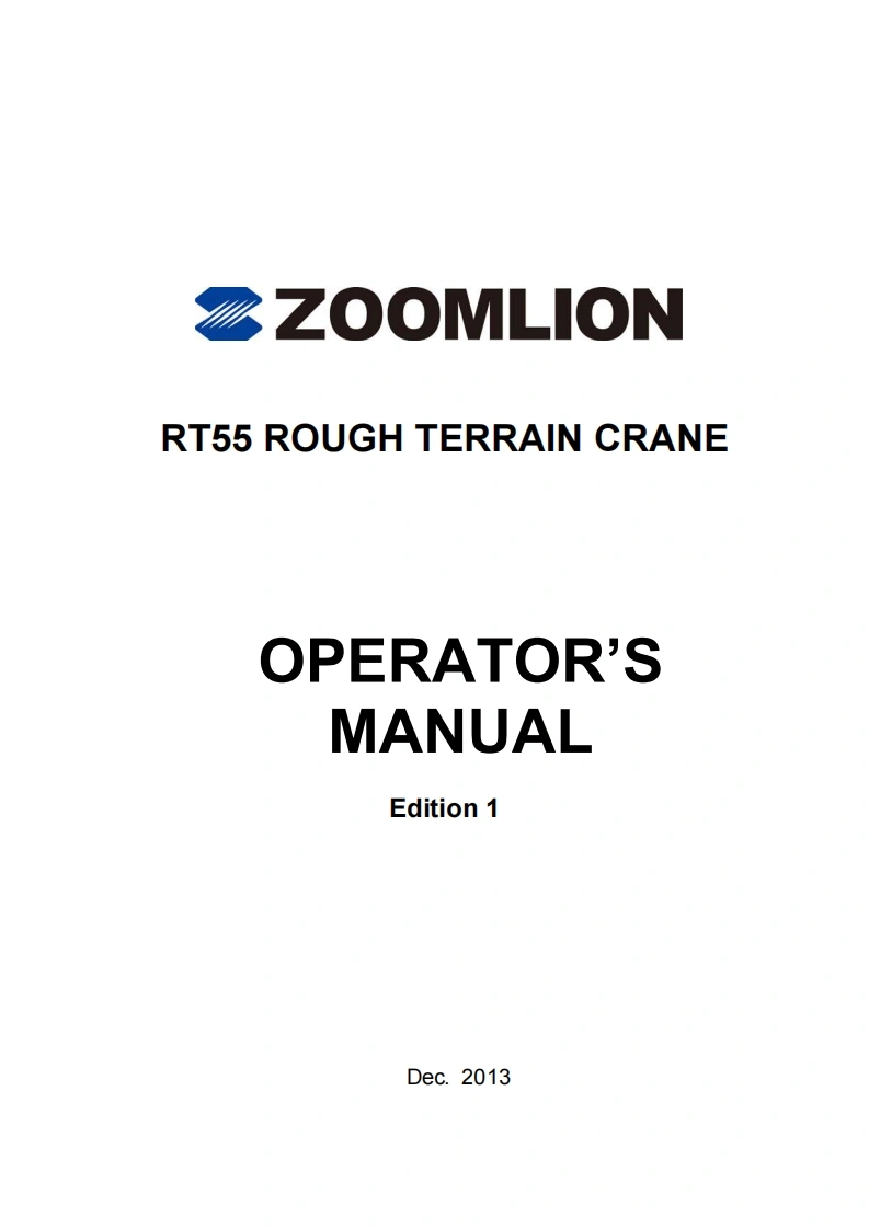 Vision creates futureSZOOMLIONZOOMLIONOPERATOR'S MANUAL FORRT55 ROUGH TERRAIN CRANE200MUON HEAY NDUSTRY SCENCE AND TECHNOLOGY OOJLTDChangsha Ecoonic and Toemdogica DevdopmentZone.Hunan Proince CnaAea0d240131ZOOMLION HEAWY NDUSTRY SCIENCE AND TECHNOLOGY OOLTD