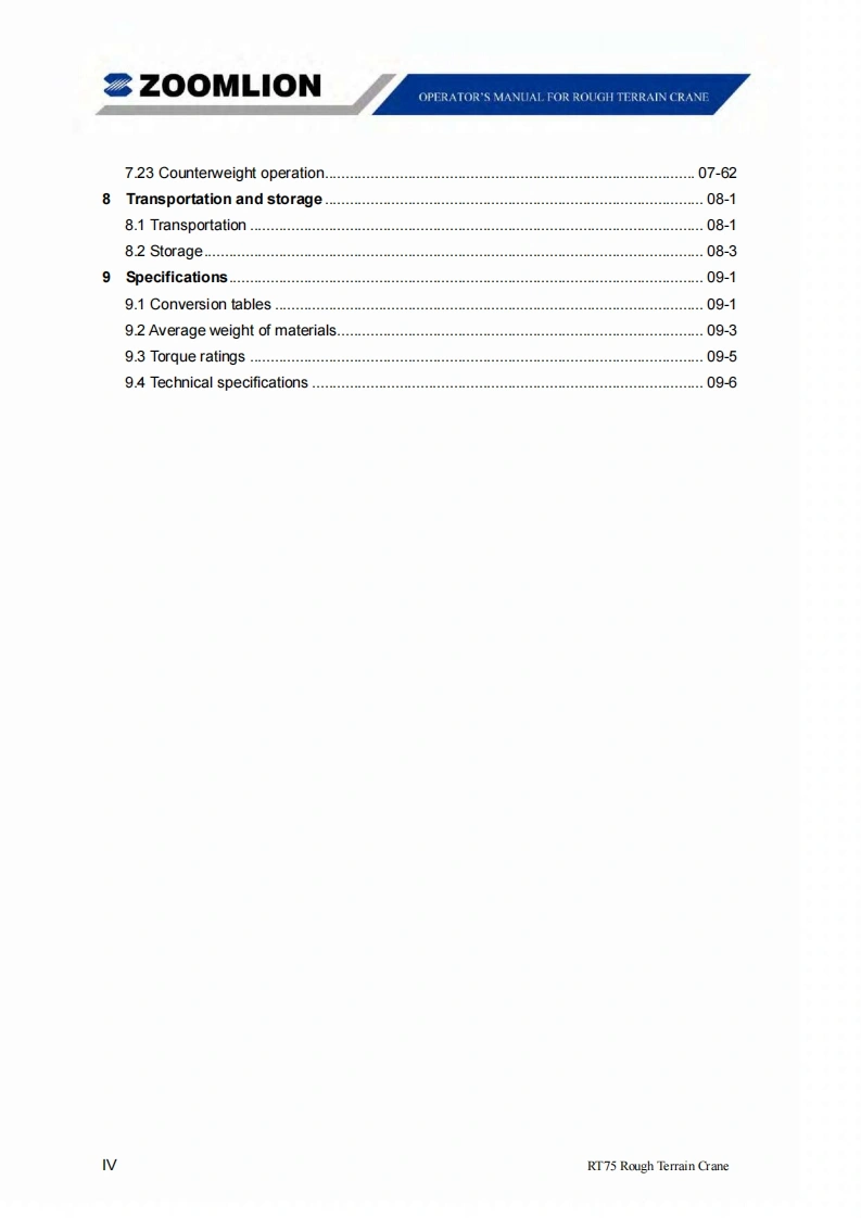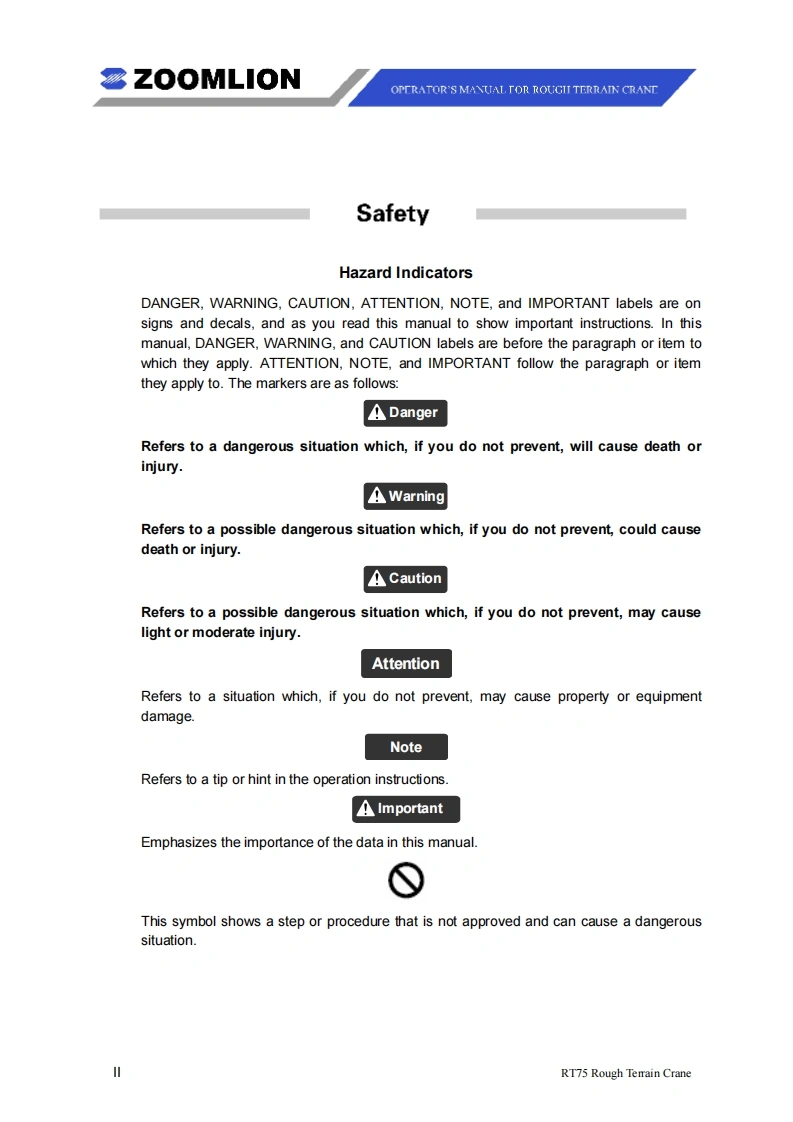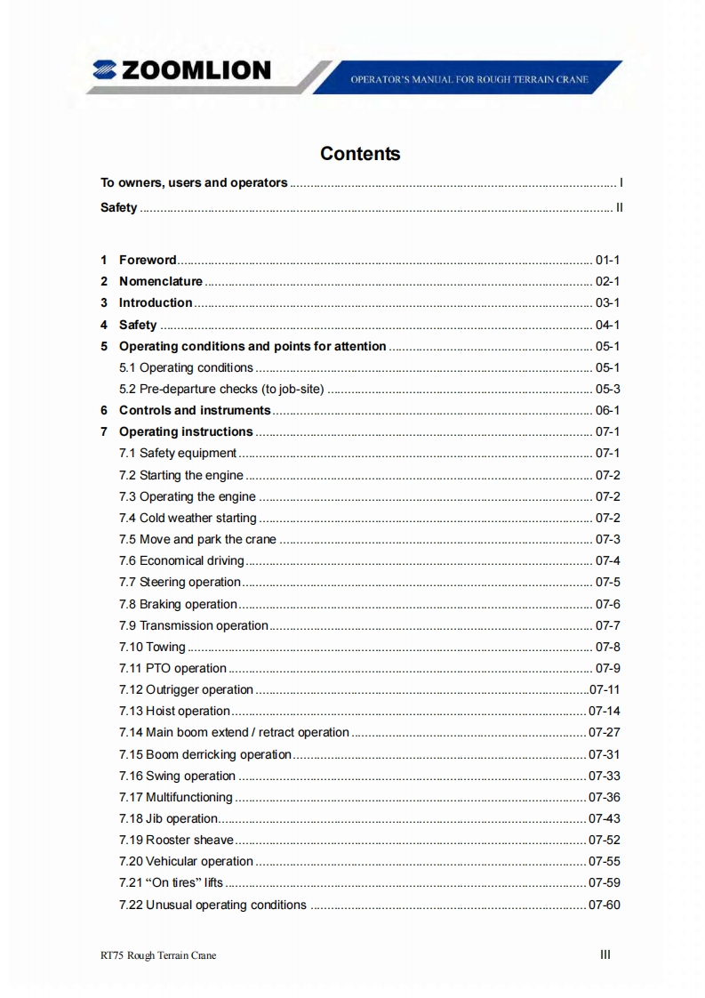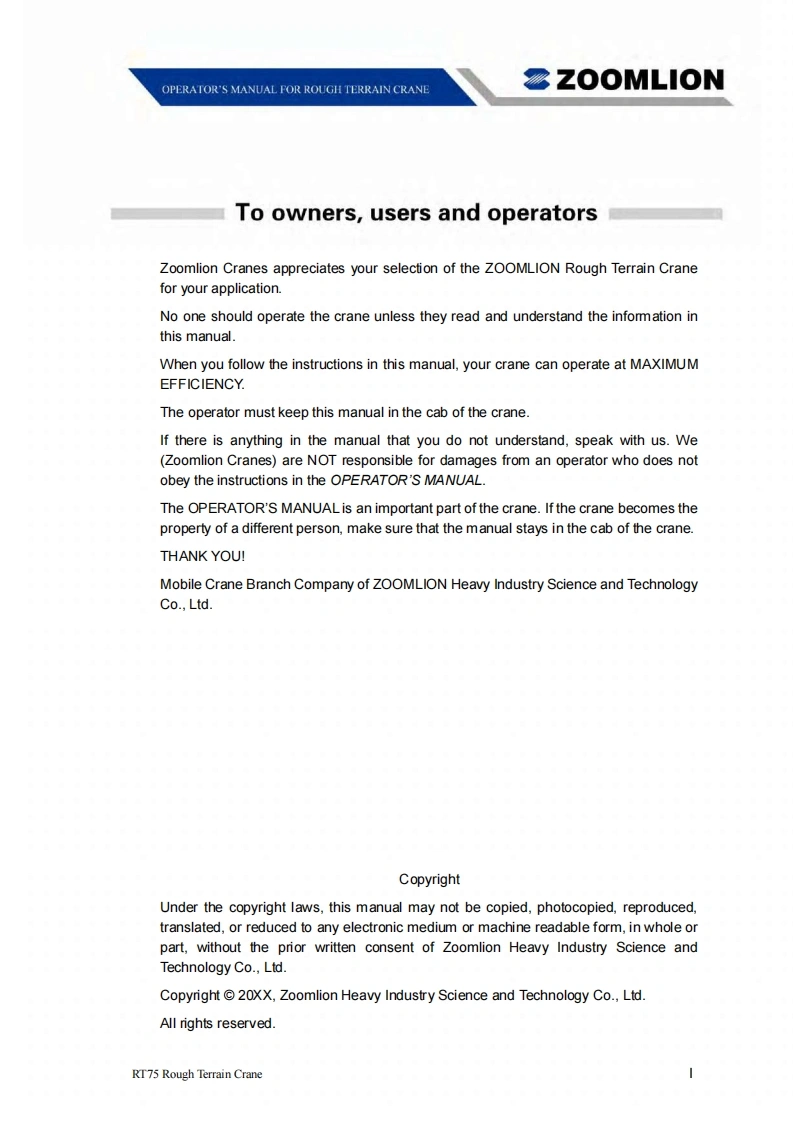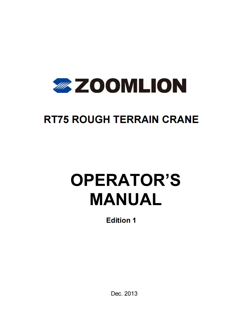 Vision creates futureSZOOMLIONZOOMLIONOPERATOR'S MANUAL FORRT75 ROUGH TERRAIN CRANE200MUON HEAY INDUSTRY SCENCE AND TECHNOLOGY OOULTDChangsha Ecoonic and Toemdogical DevdepmentZone.Hunan Proince CnaPostoode:410131ZOOMLION HEAWY NDUSTRY SCIENCE AND TECHNOLOGY OOLTD