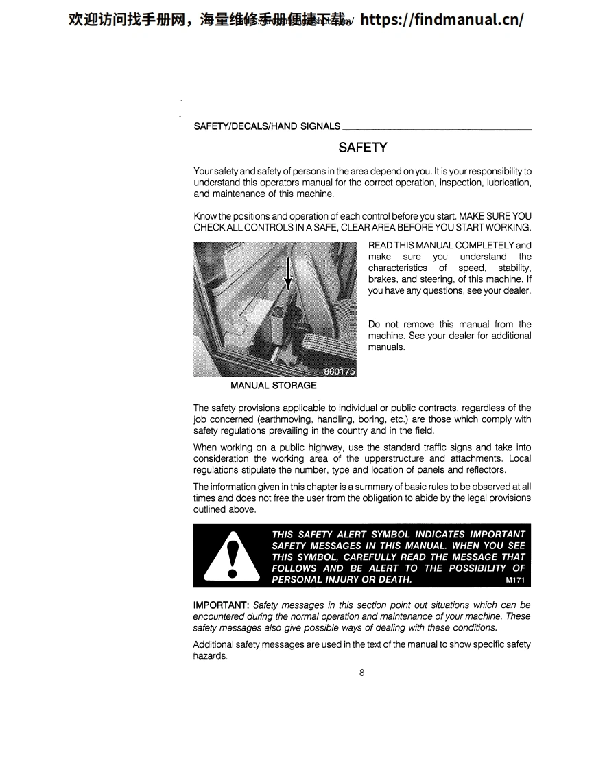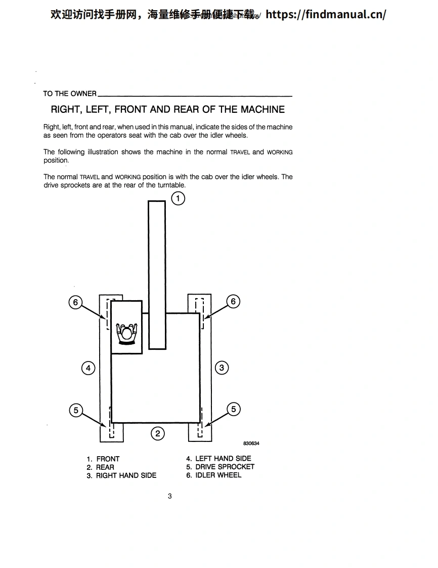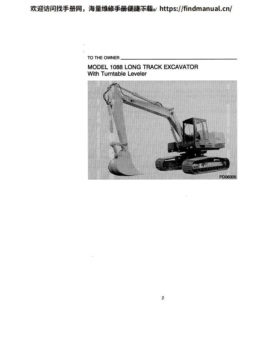 欢迎访问找手册网,海量维修弄册便捷载a/https:/findmanual.cn/TO THE OWNER.TO THE OWNER OF A CASE EXCAVATORUse this manual as your guide.If you follow the instructions given in this manual.yourCase excavator will work well for many years.Your Dealer can give you assistance with Case Company made parts and personswith special training that know the best methods of repair and maintenance for yourexcavatorCall your Dealer if you need any assistance or information.Your Authorized Case DealerMODEL 1088 LONG TRACK EXCAVATOR8801721
