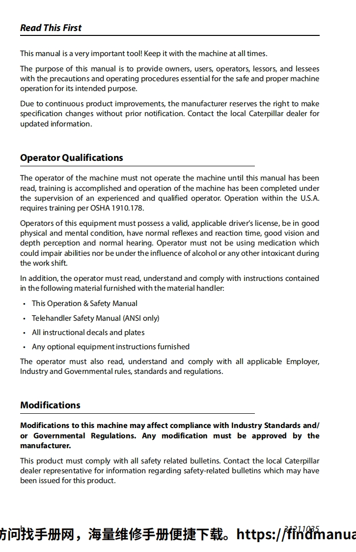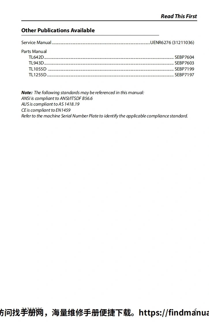 CATERPILLAROperationMaintenance ManualOriginal InstructionsKeep this manual with machine at all times.ModelsTL642D,TL943D,TL1055D,TL1255DSN ML800150 to Present,SN MLG00150 to PresentSN MLJ00150 to Present,SN MLD00150 to PresentSN ML500150 to Present,SN MNT00150 to PresentSN ML700150 to Present,SN MYW00150 to Present31211035SEBU9293-05February 18,2019-Rev F方问找手网,海星维修手册便捷我。ttps./7findmanua